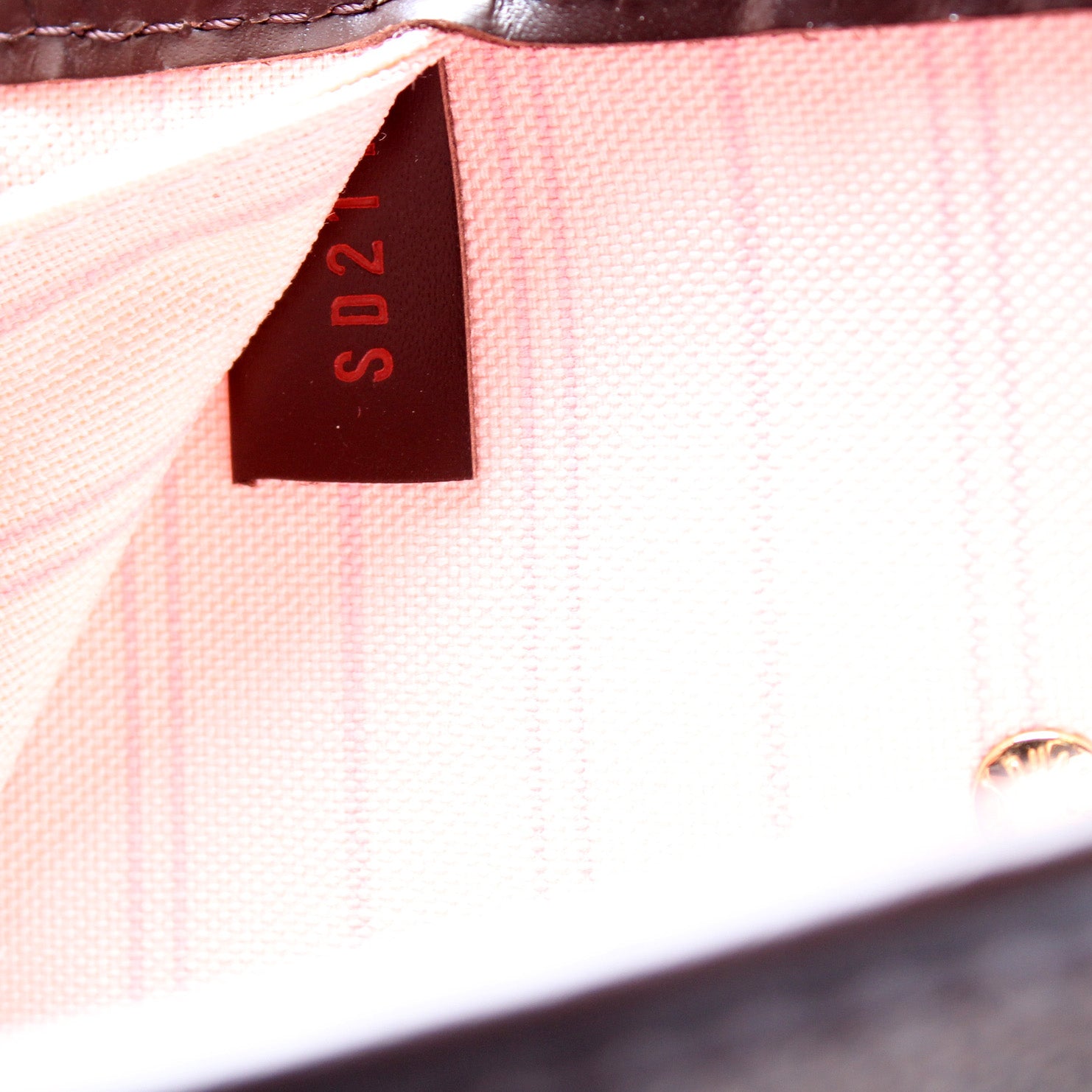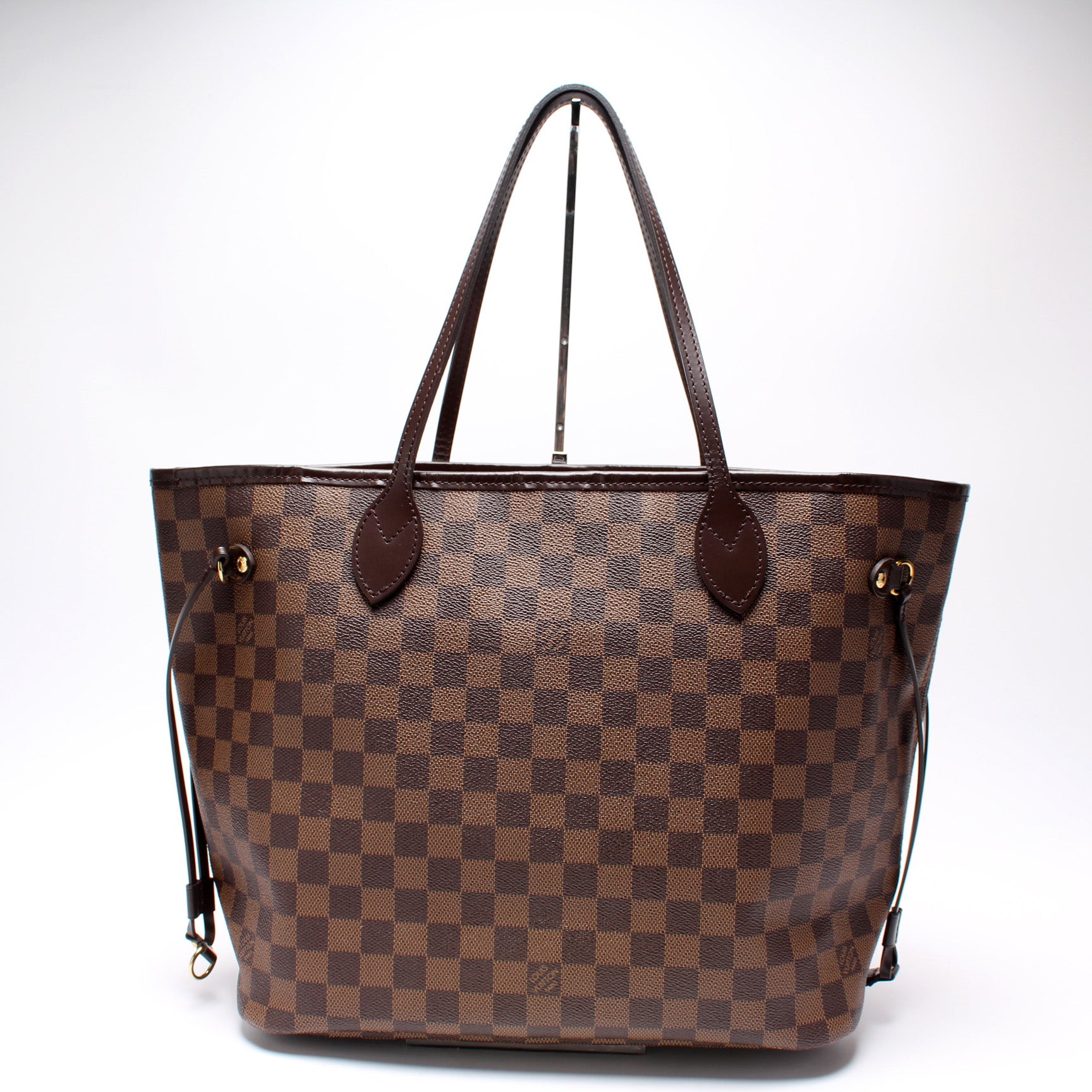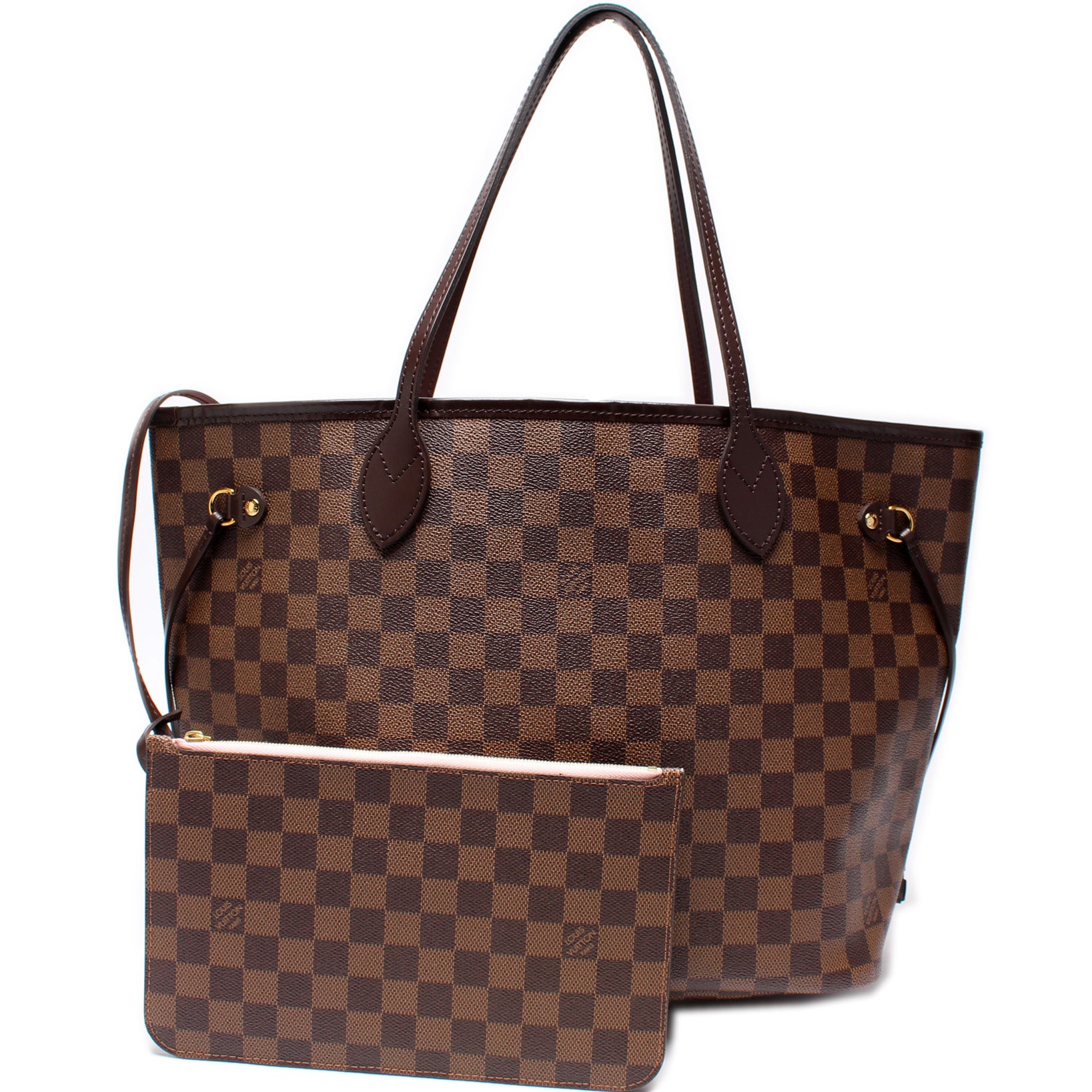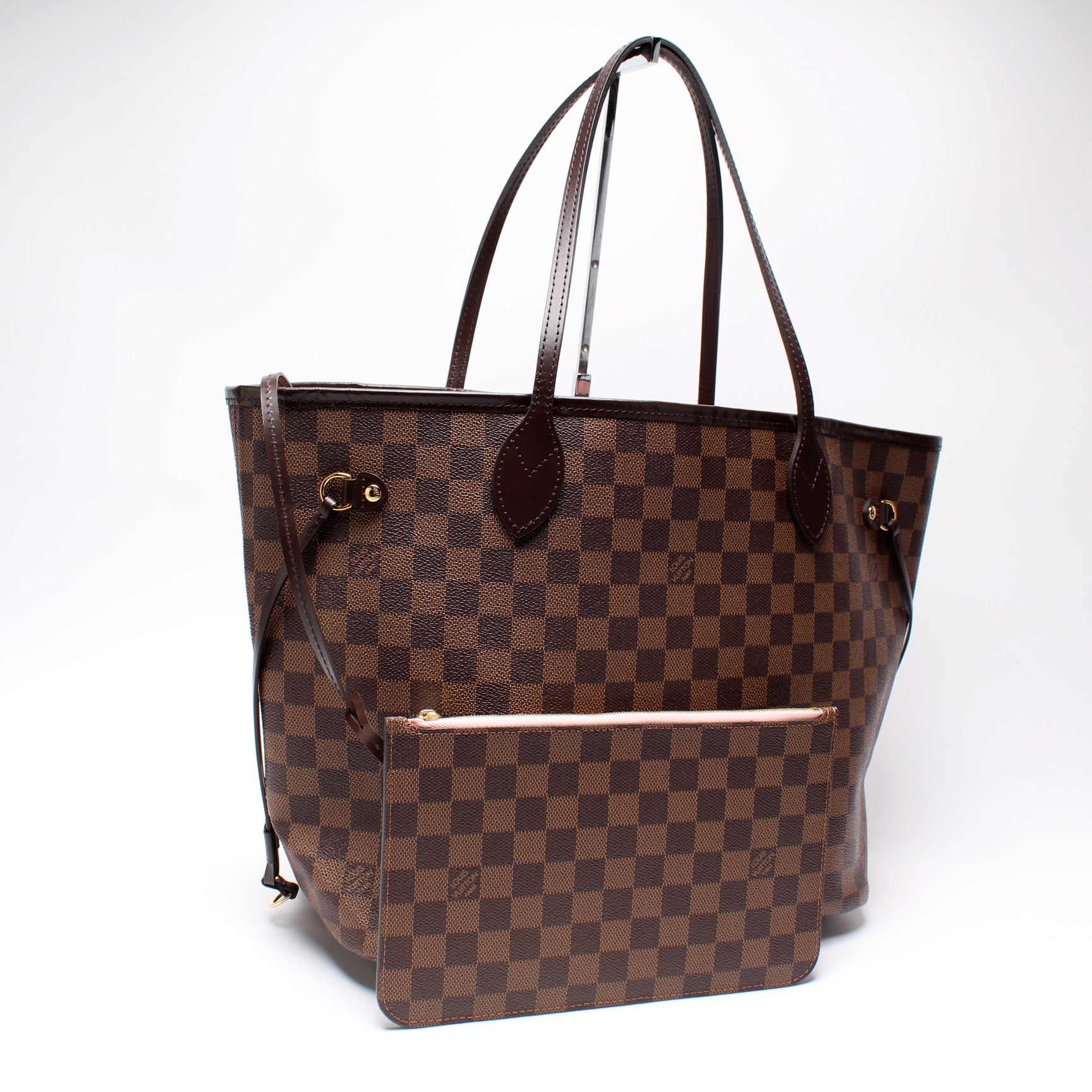 This pre-owned Louis Vuitton Neverfull MM is guaranteed 100% authentic. The exterior is in the classic Louis Vuitton Damier Ebene coated canvas.