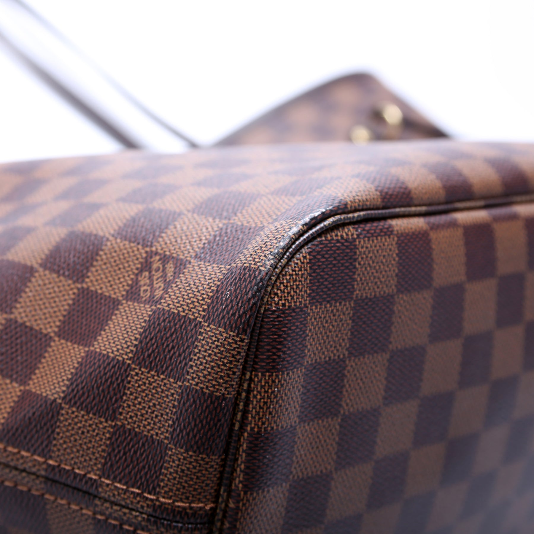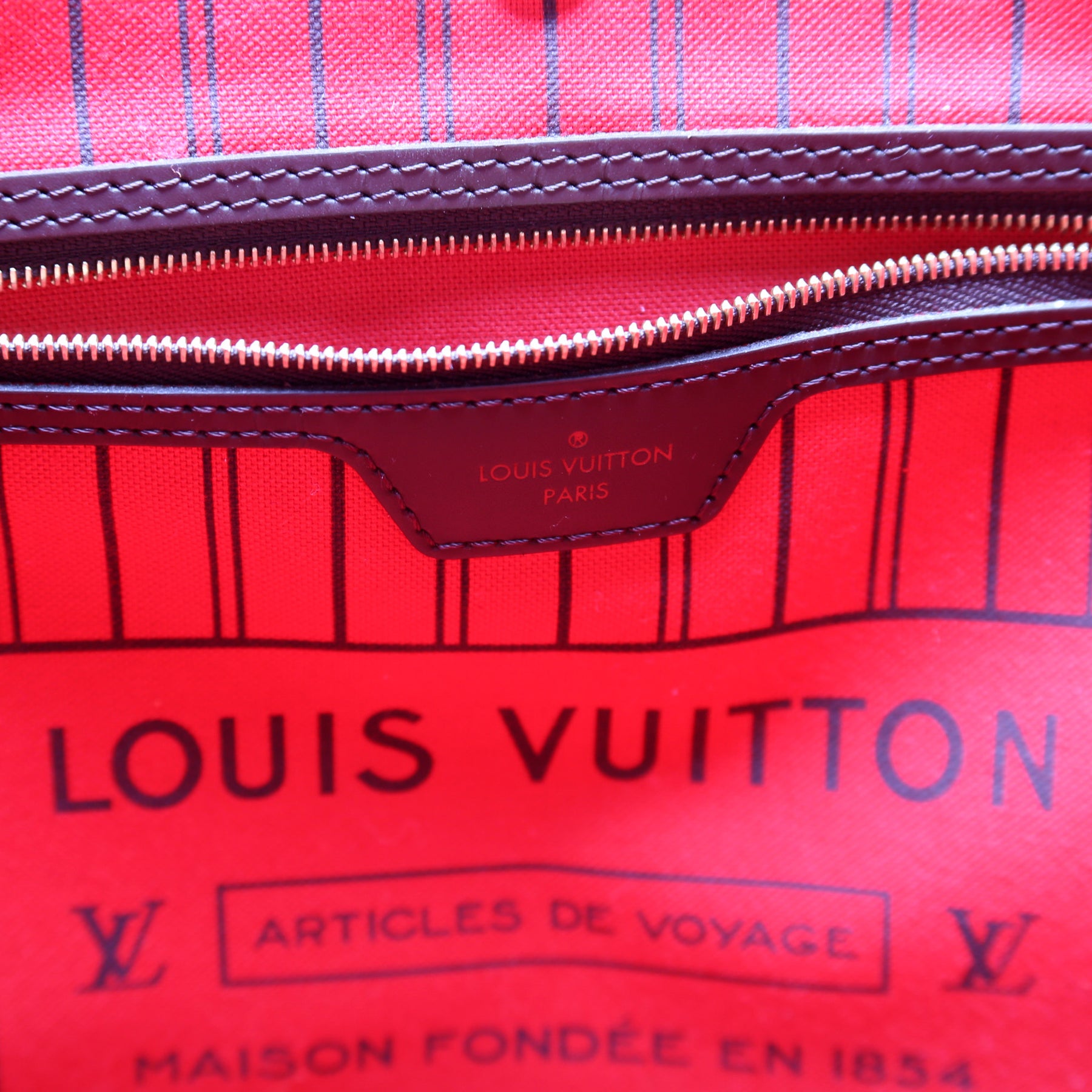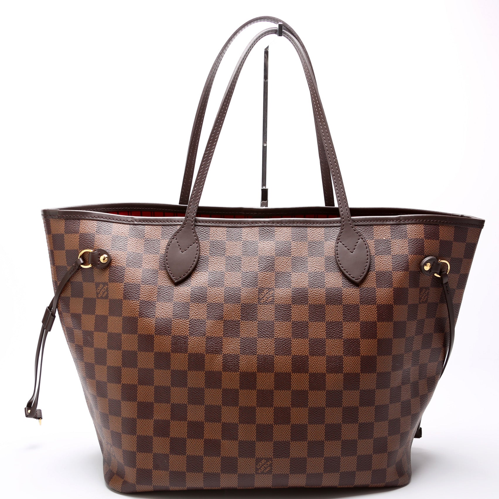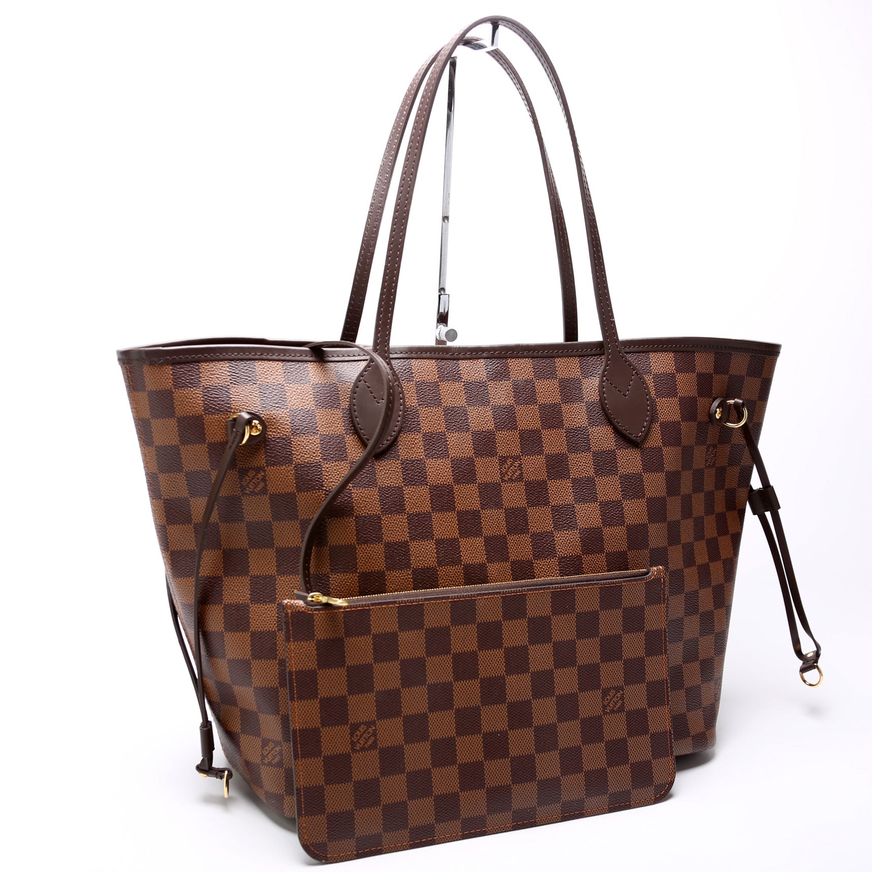 This pre-owned Louis Vuitton Neverfull W/Wallet MM is guaranteed 100% authentic. The exterior is in the classic Louis Vuitton Damier Ebene coated canvas.