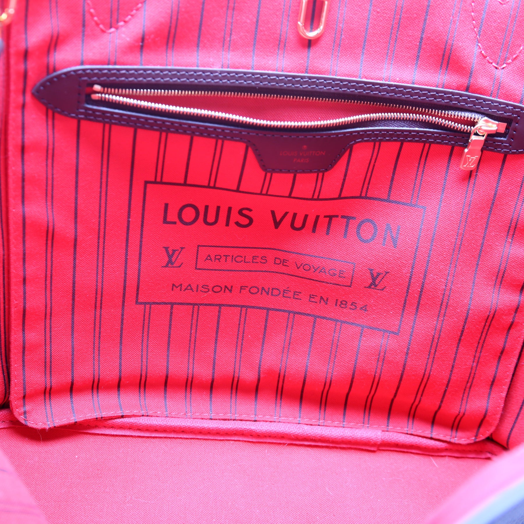 Interior: The interior is clean. The interior features one zip closure pocket and one removable zip pochette. The pochette shows light wear along the pipping.