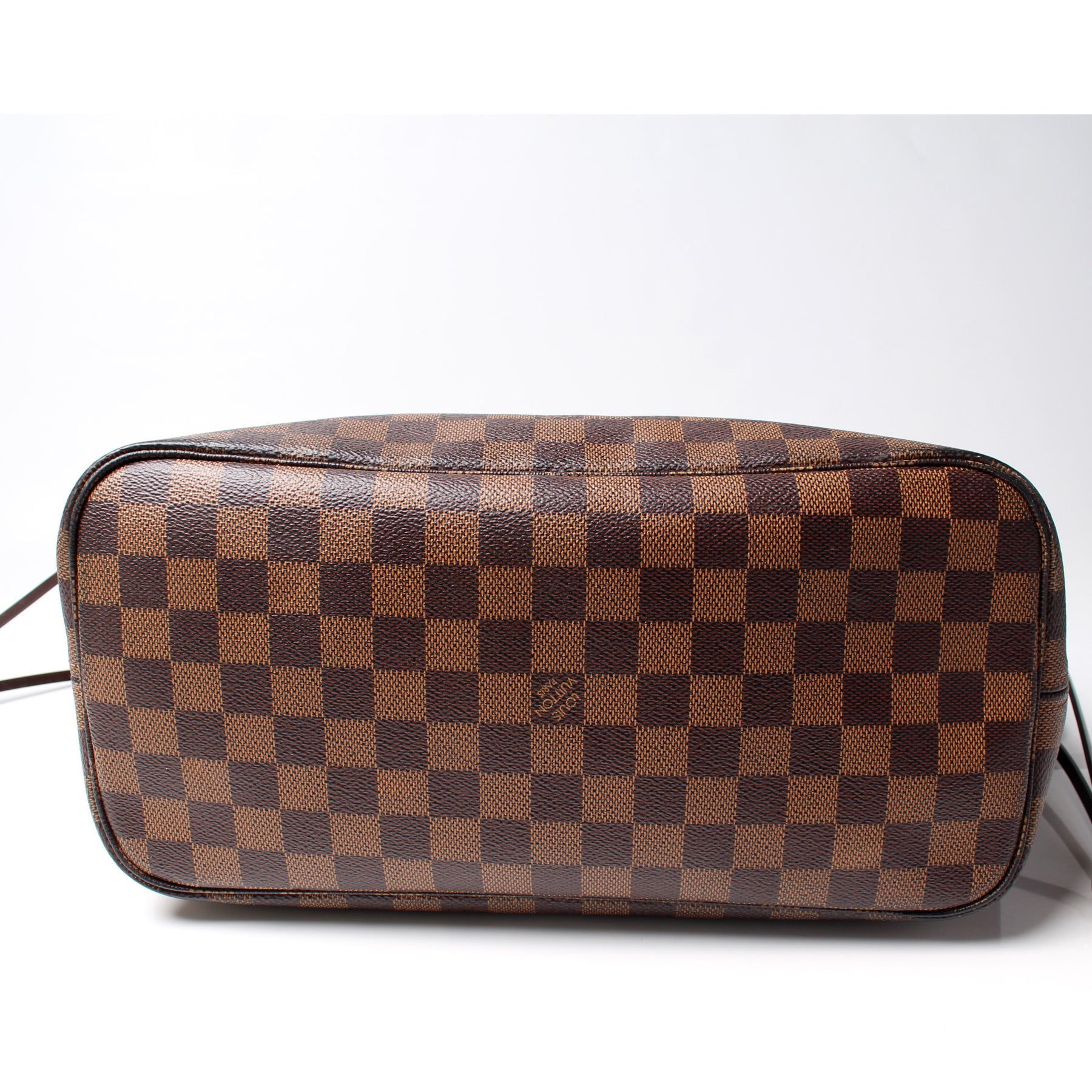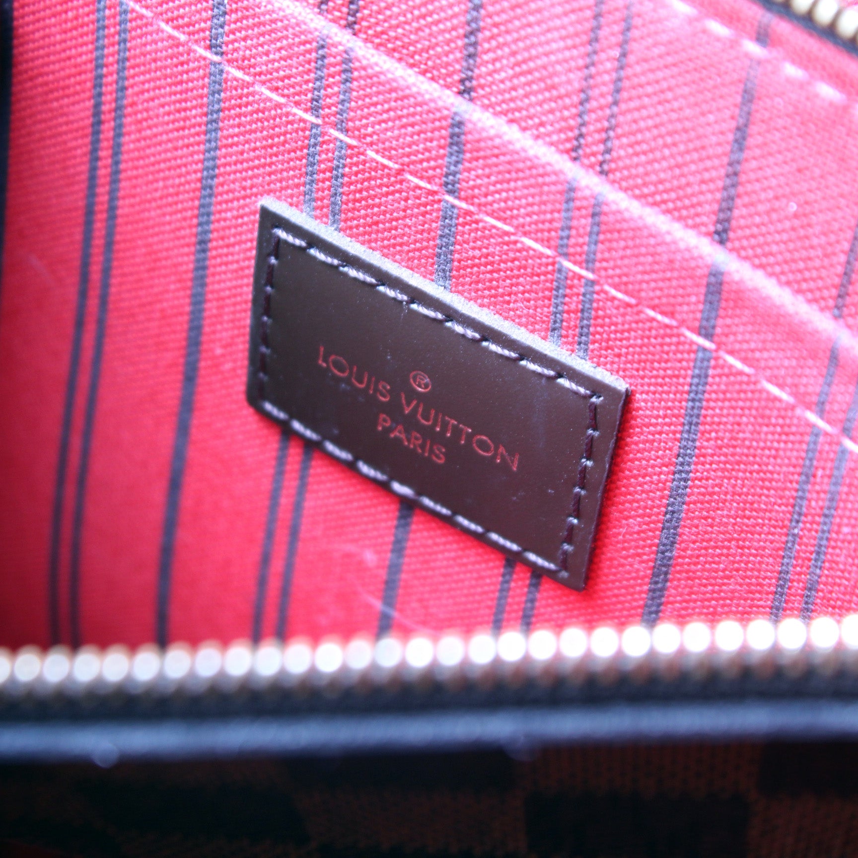 This pre-owned Louis Vuitton Neverfull MM W/ Wallet is guaranteed 100% authentic. The exterior is in the classic Louis Vuitton Damier Ebene coated canvas.