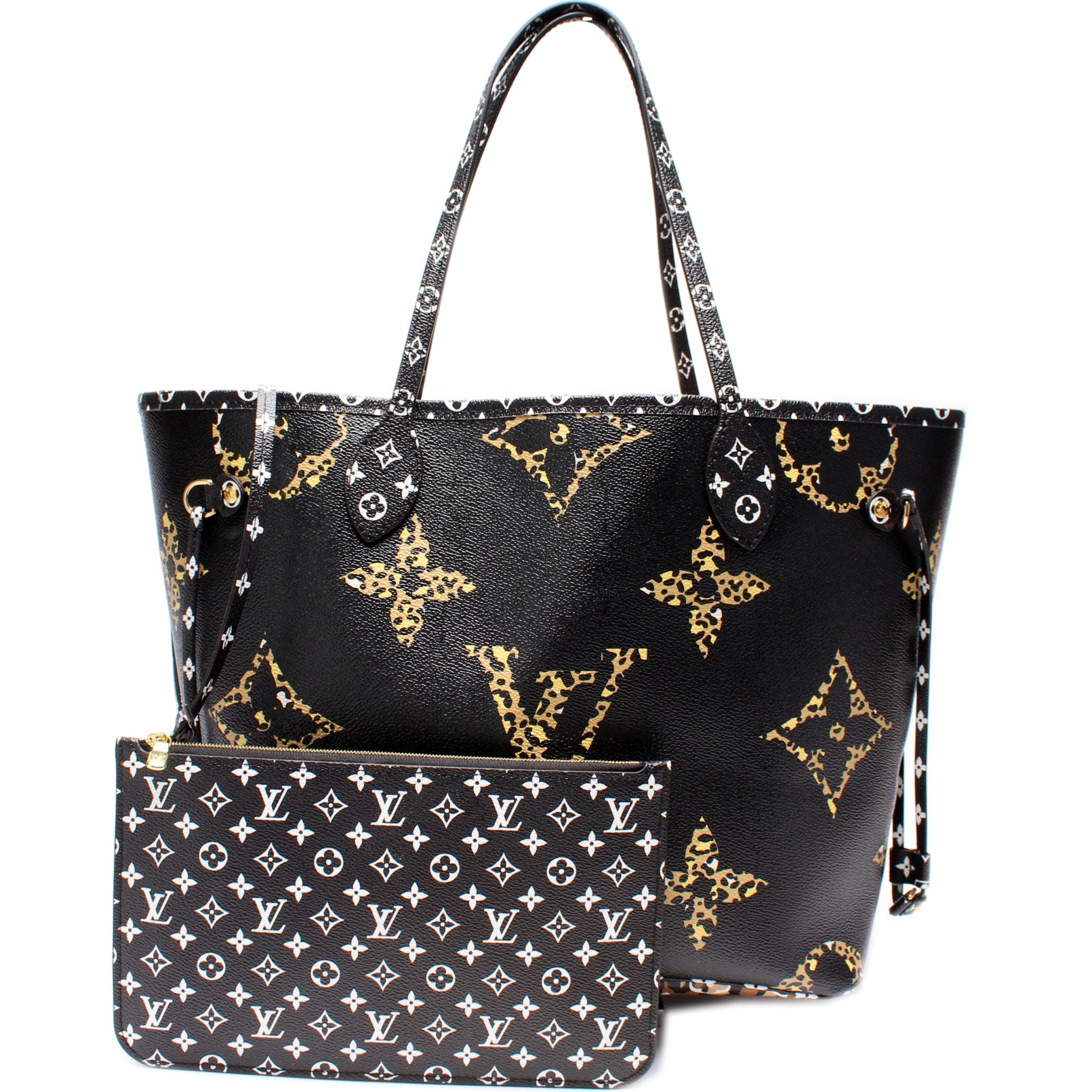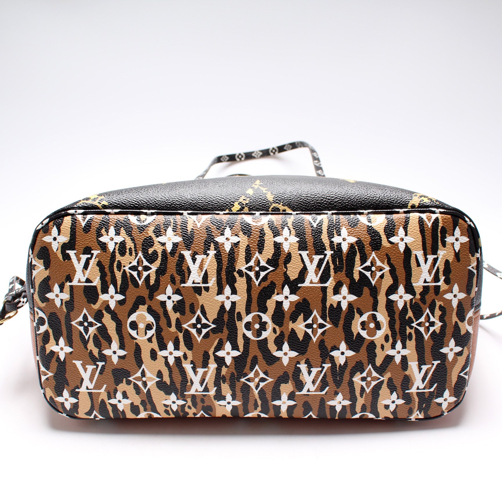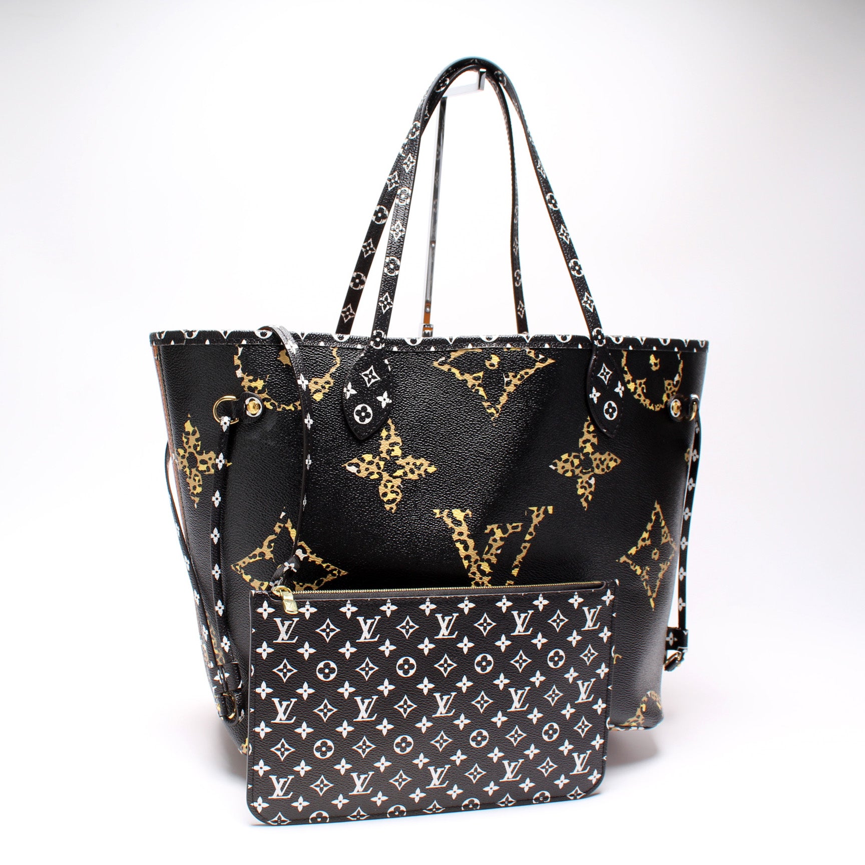 This pre-owned Louis Vuitton Neverfull MM W/ Wallet is guaranteed 100% authentic. The exterior is in the classic Louis Vuitton Jungle coated canvas.