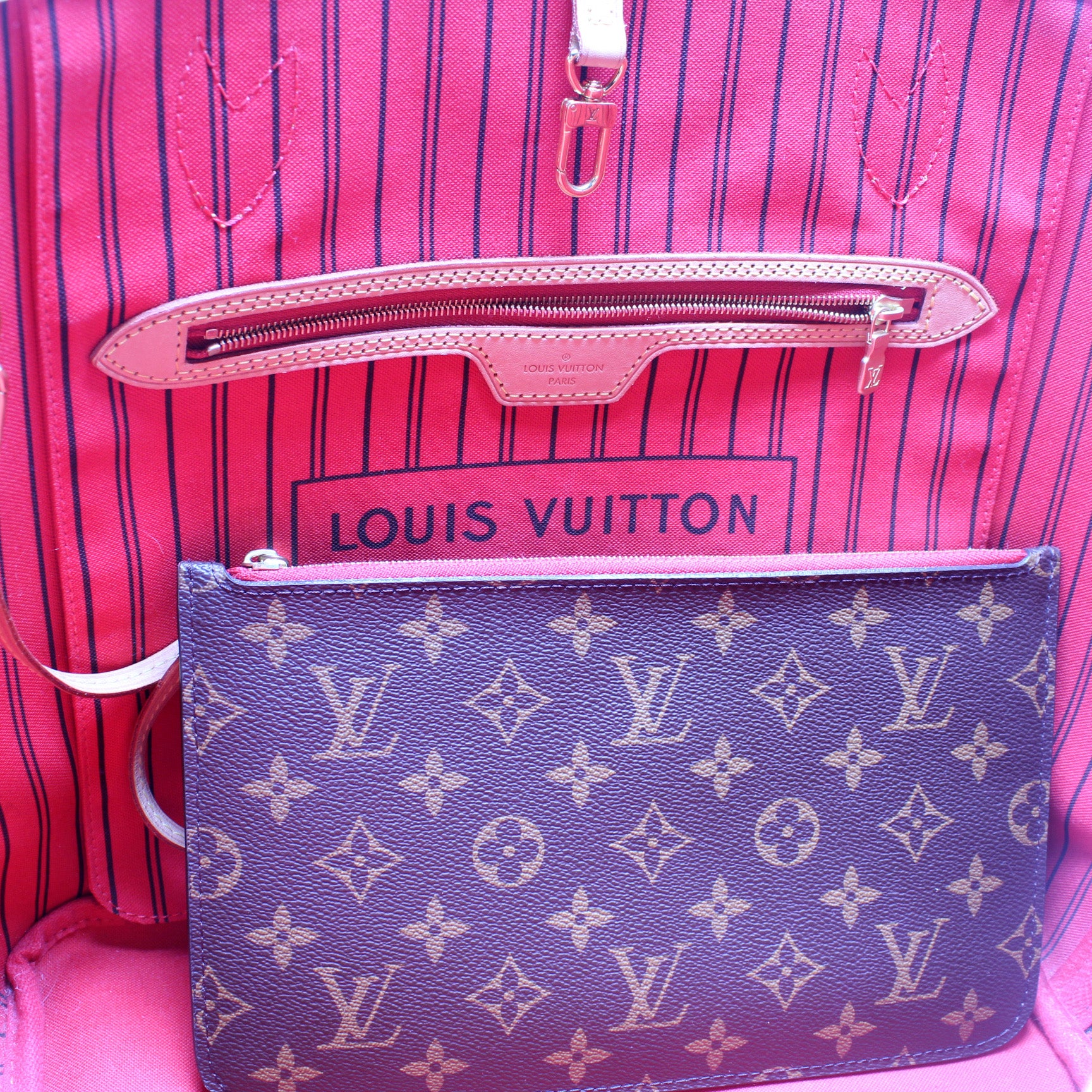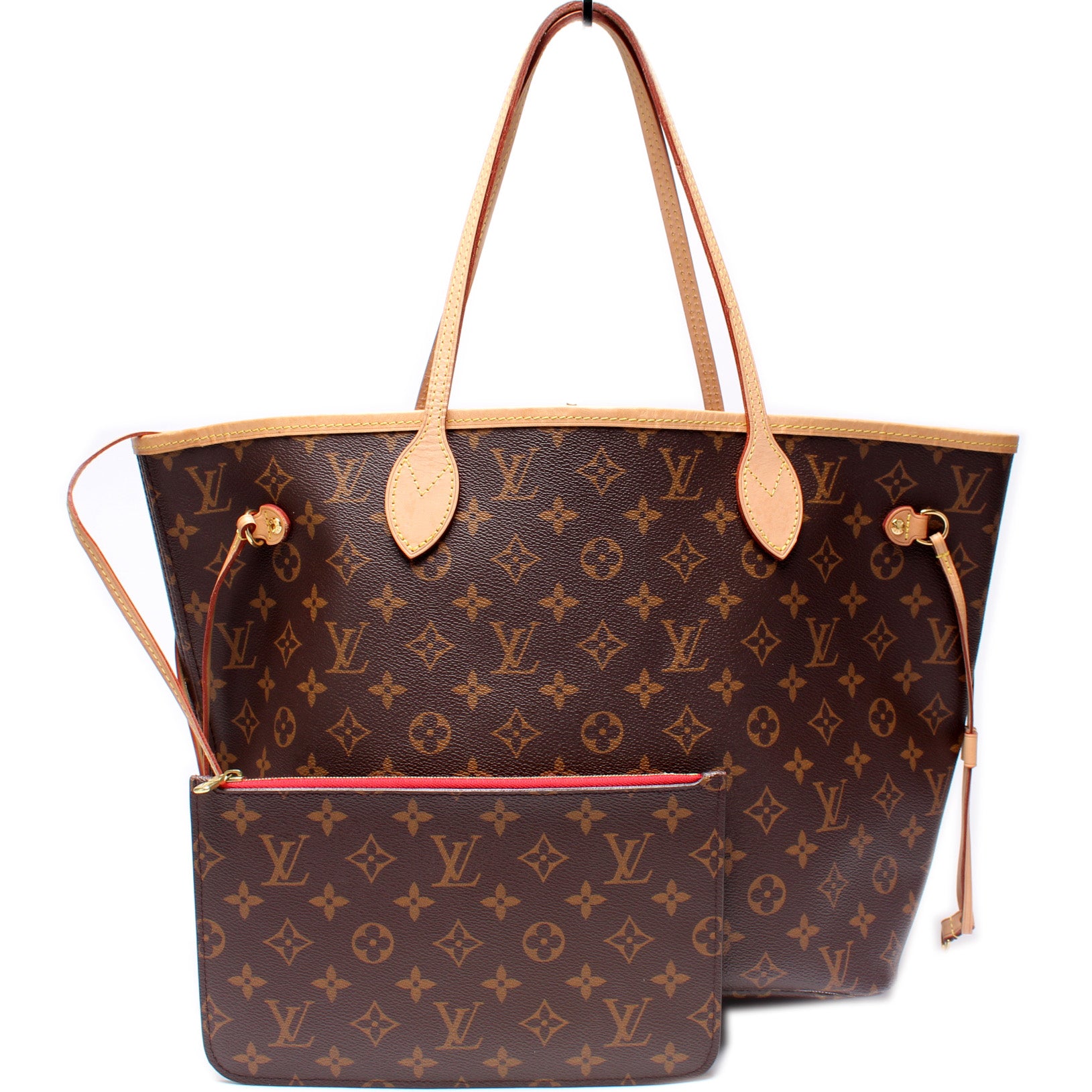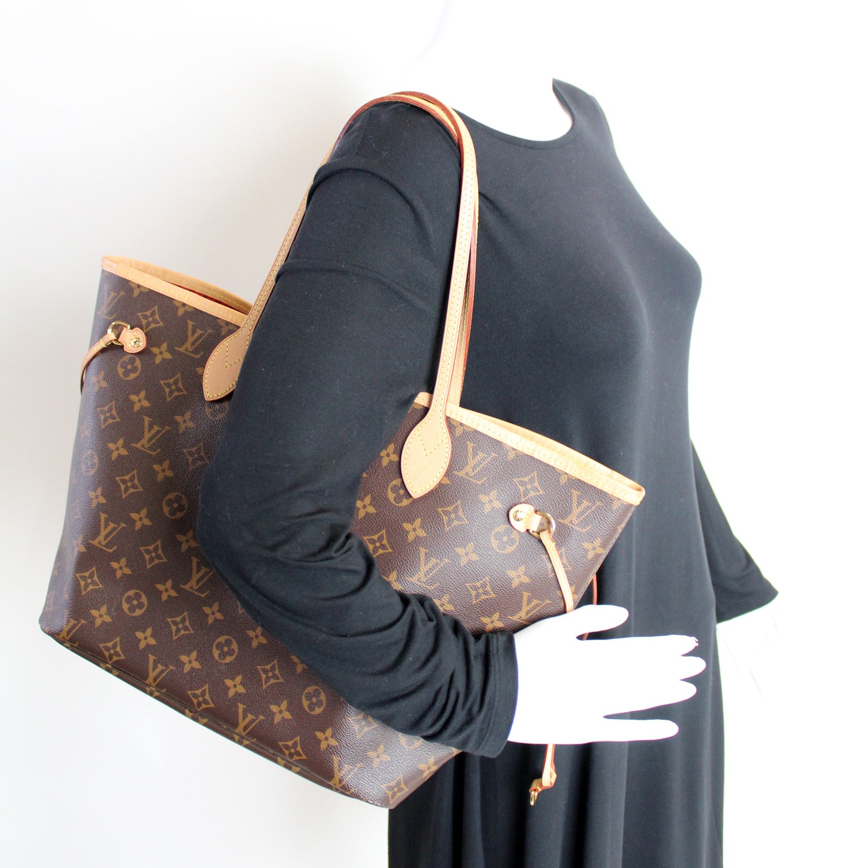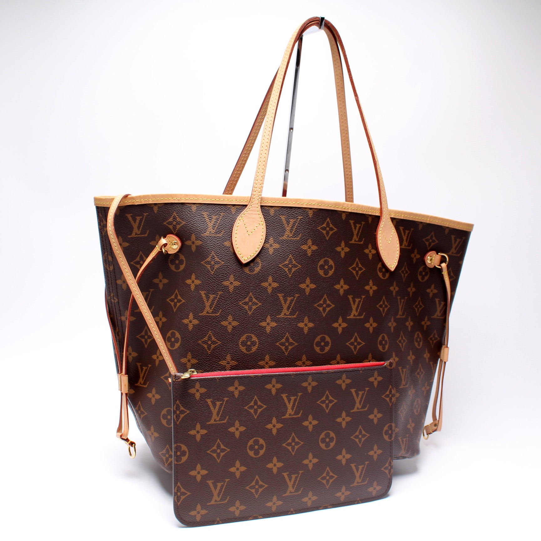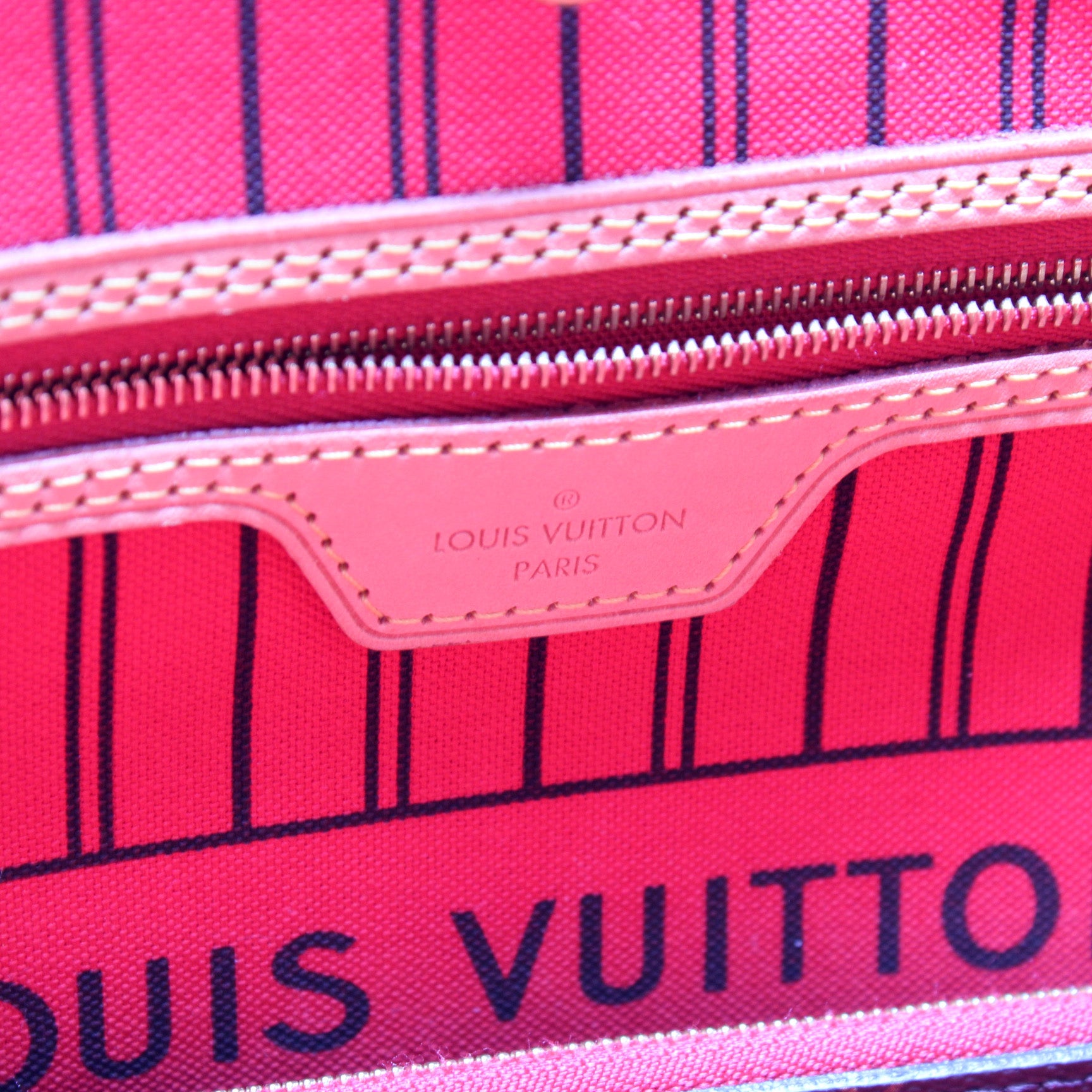 This pre-owned Louis Vuitton Neverfull MM W/ Wallet is guaranteed 100% authentic. The exterior is in the classic Louis Vuitton Monogram coated canvas.