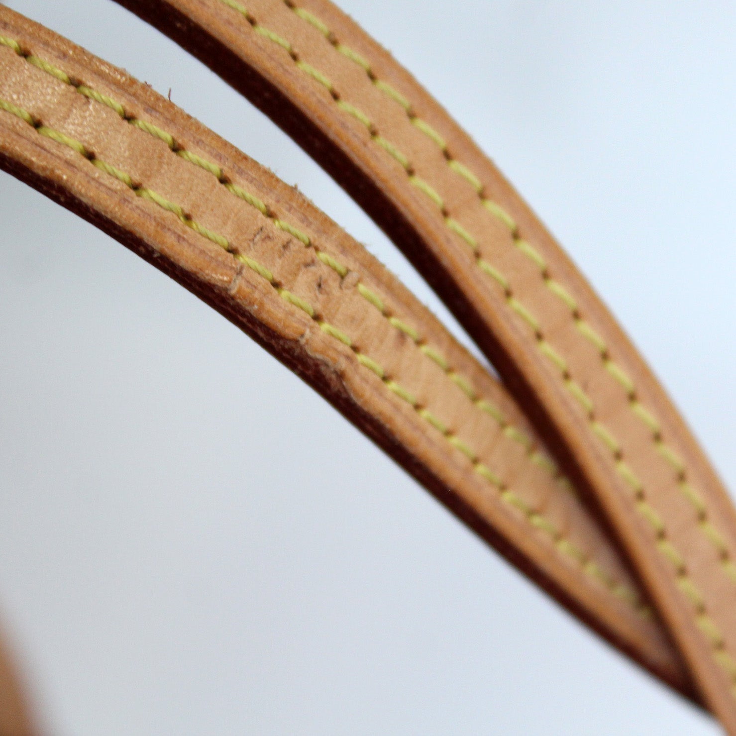 Exterior: The exterior coated canvas is free from any rips or cracks. The corners show light rubbing. The leather trim has light water stains throughout.
