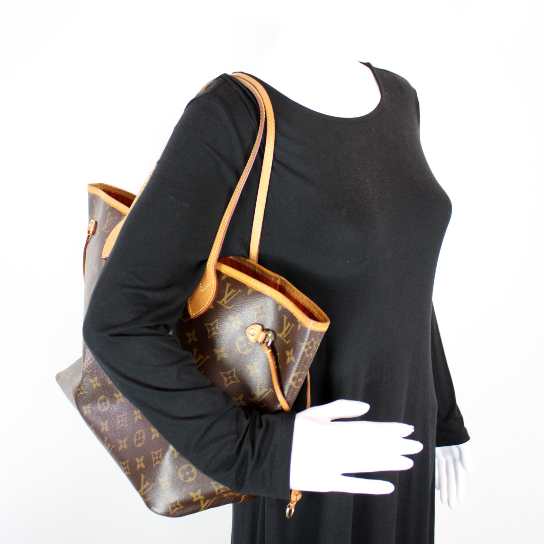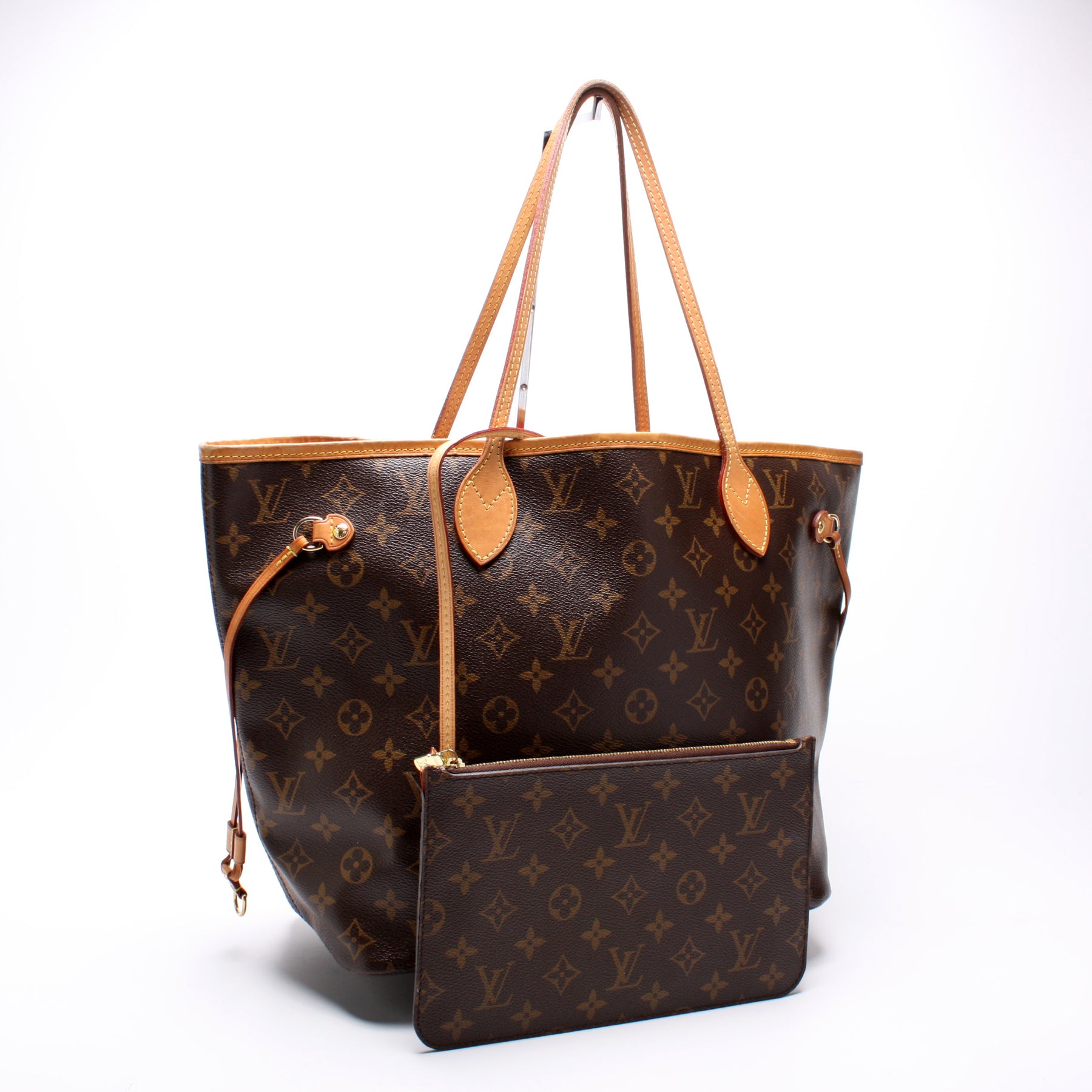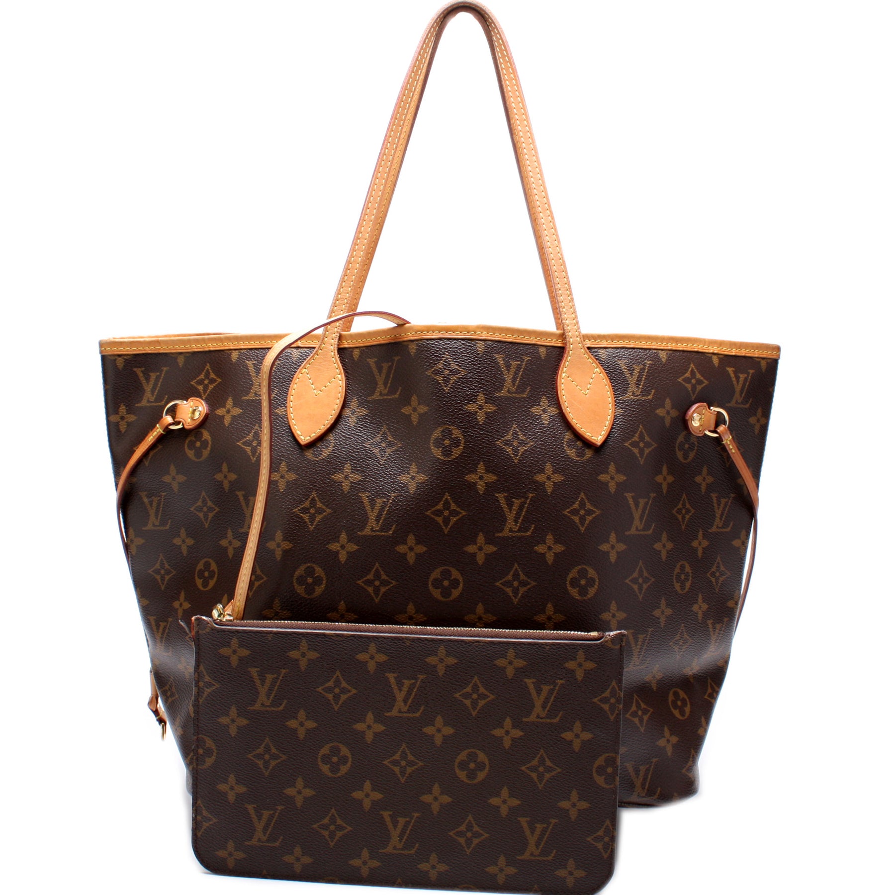 This pre-owned Louis Vuitton Neverfull MM W/Wallet is guaranteed 100% authentic. The exterior is in the classic Louis Vuitton Monogram coated canvas.
