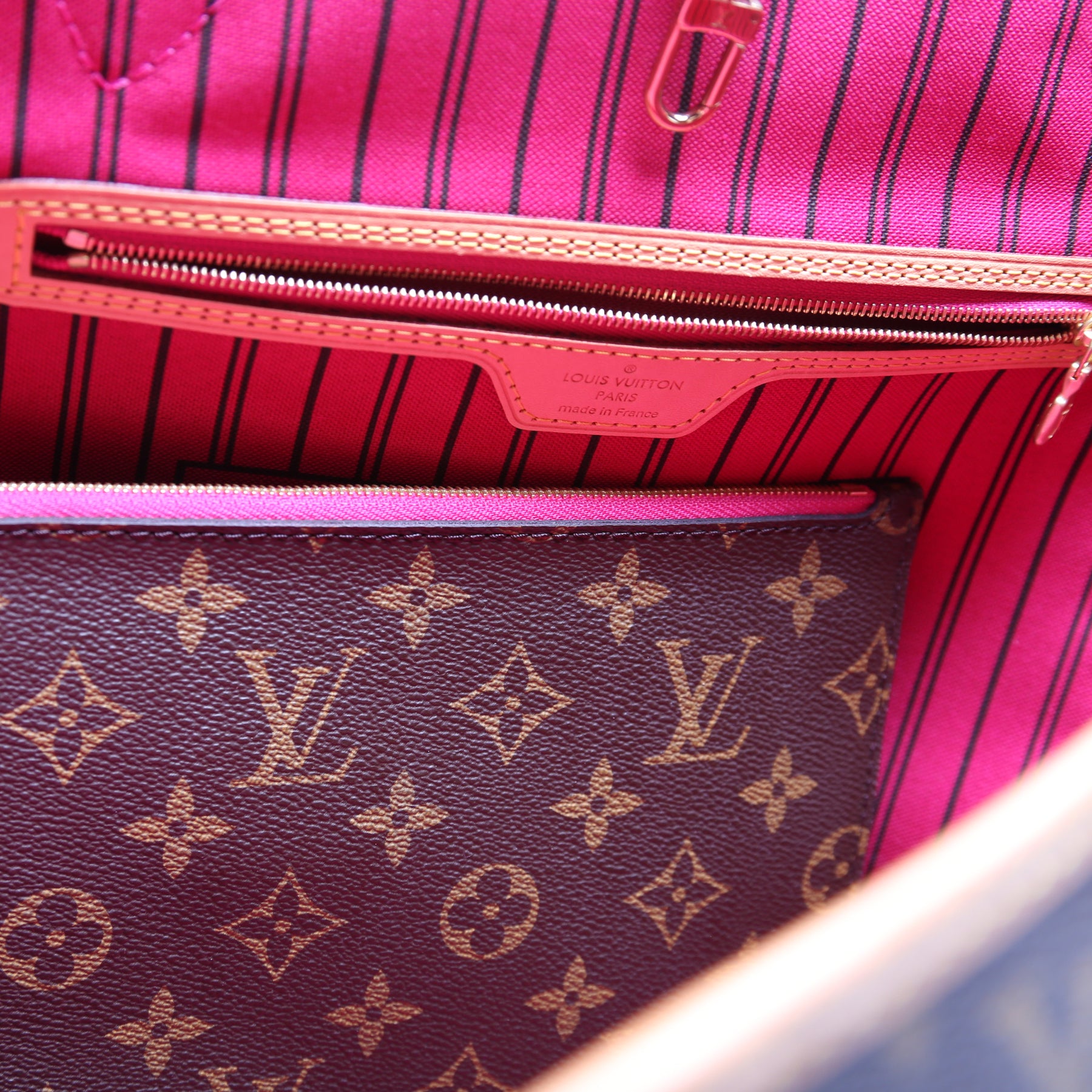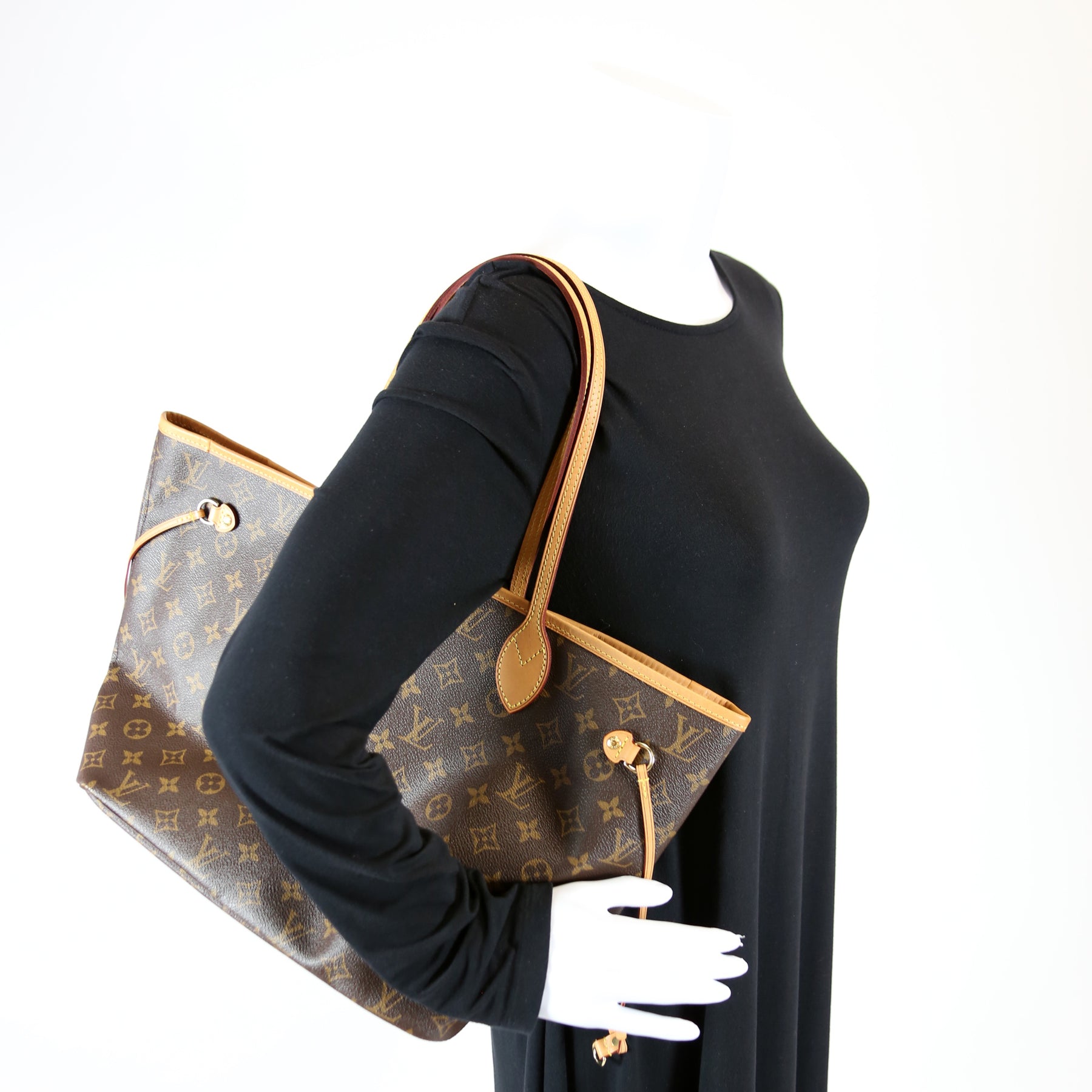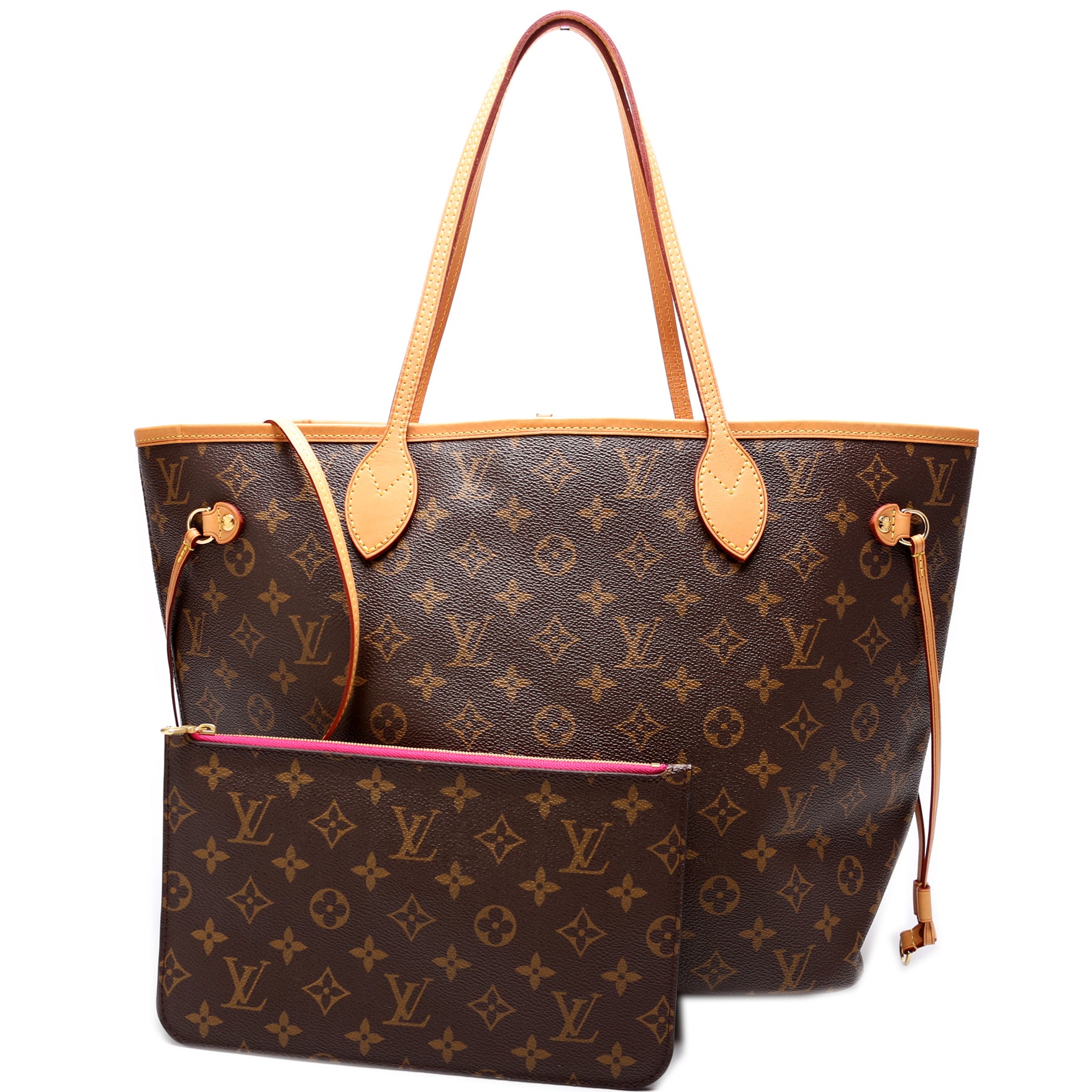 This pre-owned Louis Vuitton Neverfull MM W/Wallet is guaranteed 100% authentic. The exterior is in the classic Louis Vuitton Monogram coated canvas.