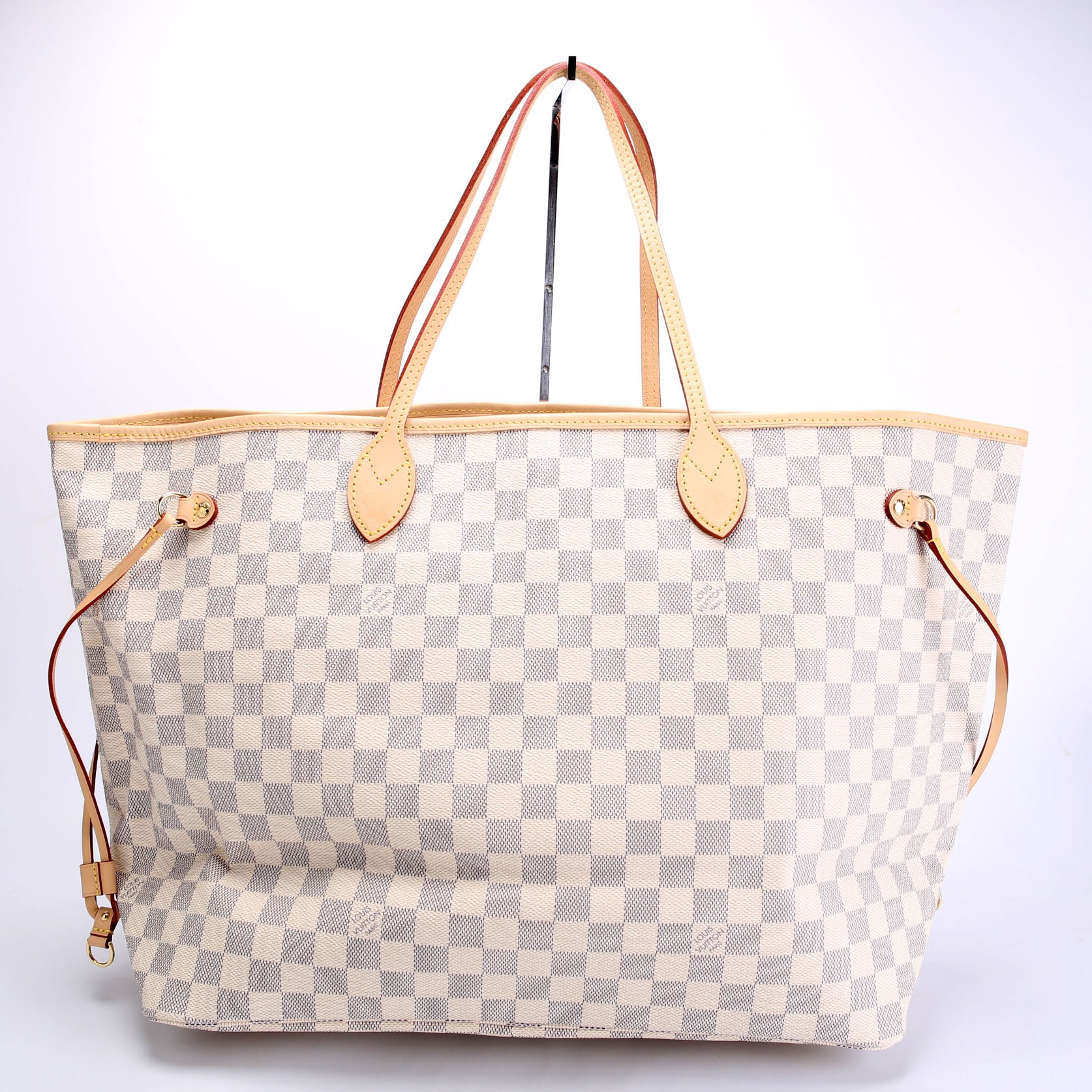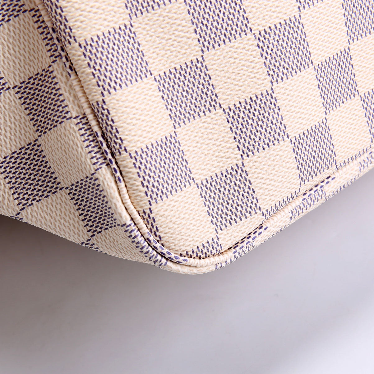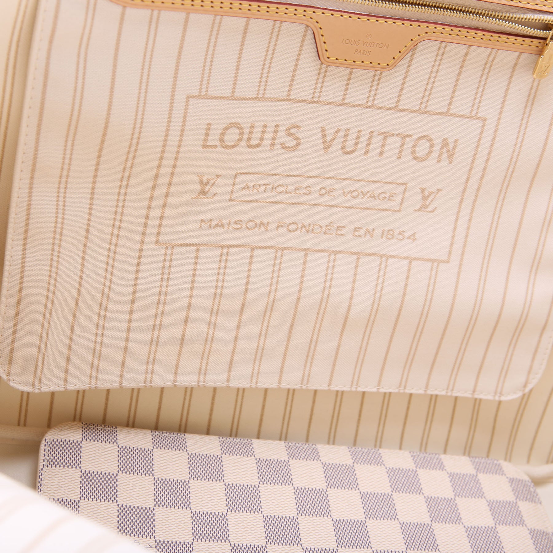 This pre-owned Louis Vuitton Neverfull GM With Wallet is guaranteed 100% authentic. The exterior is in the classic Louis Vuitton Damier Azur coated canvas.