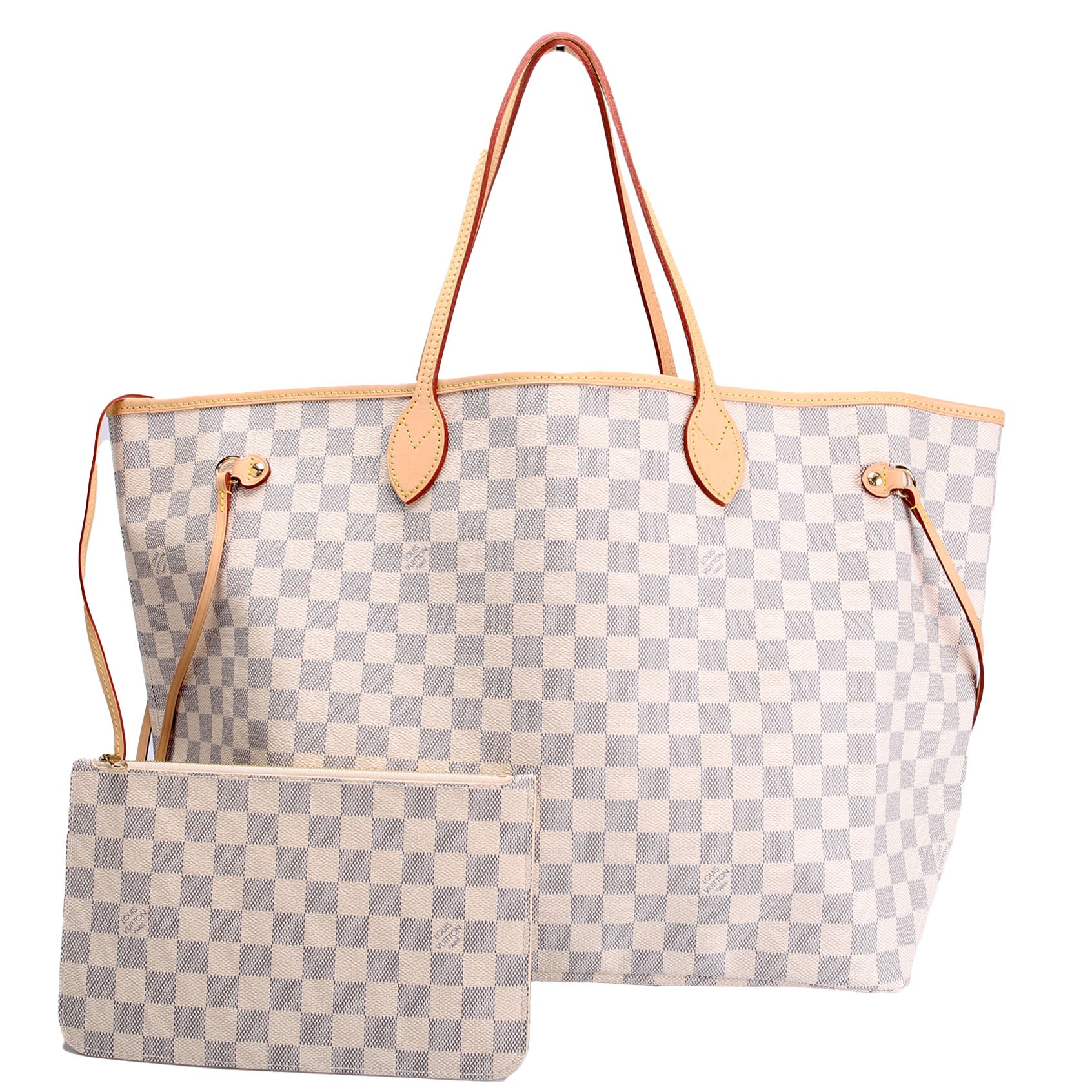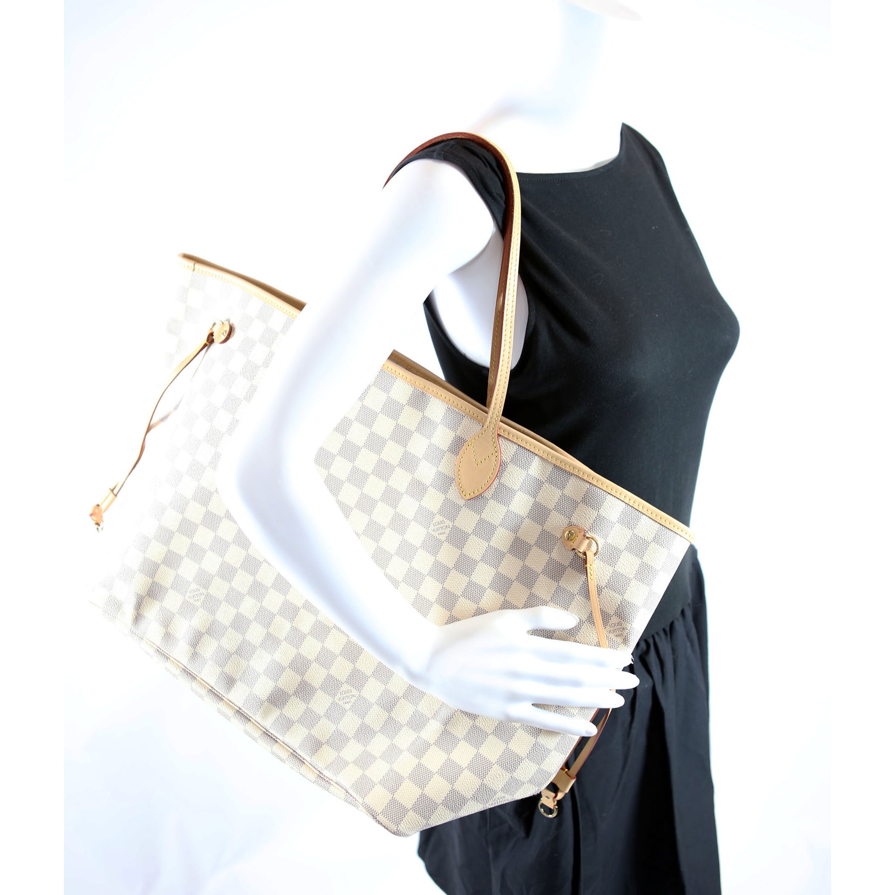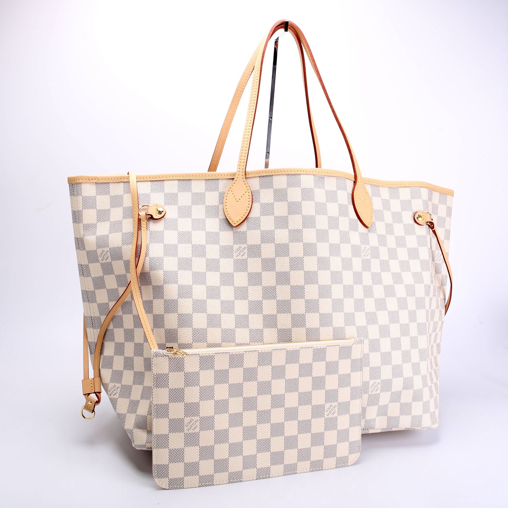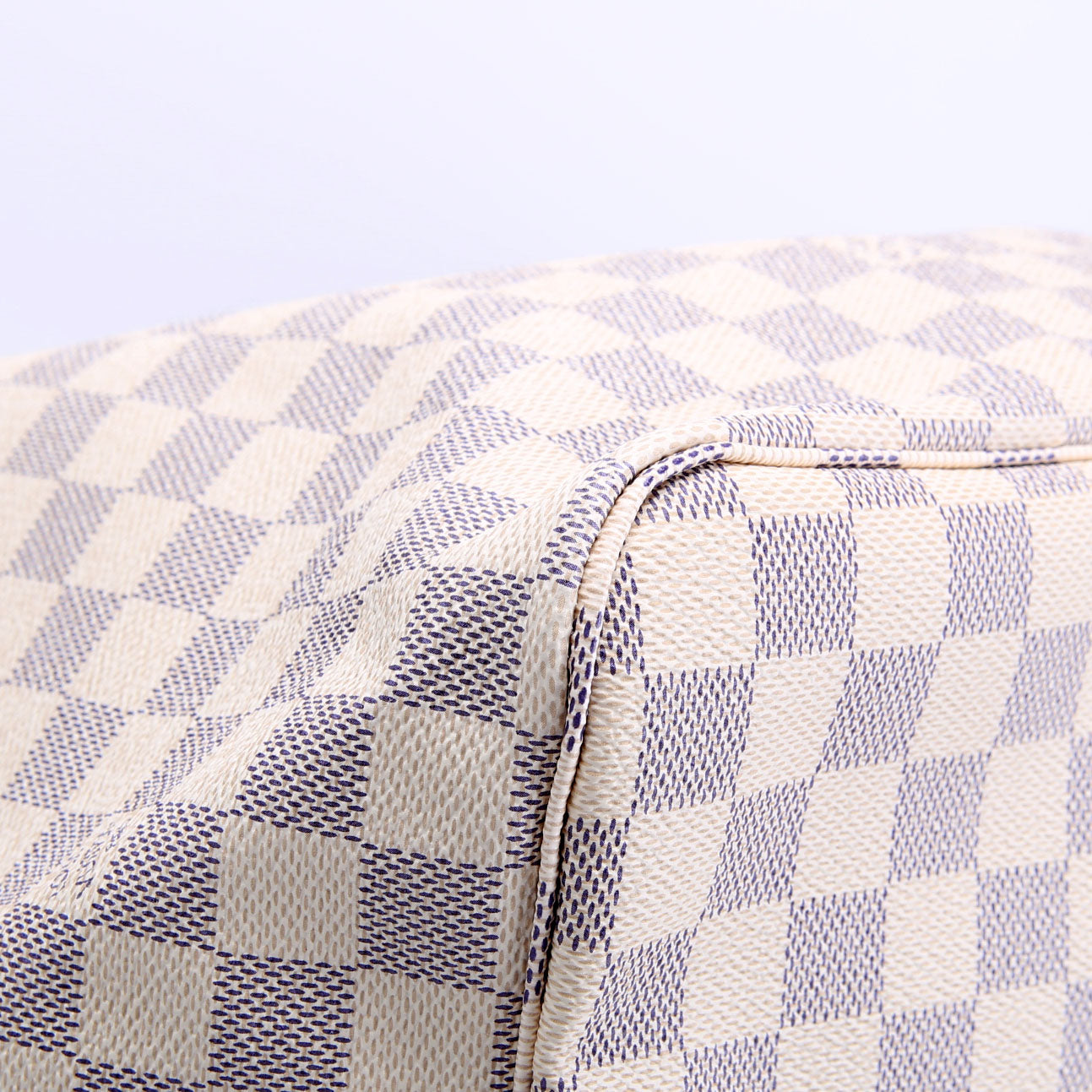 This pre-owned Louis Vuitton Neverfull GM With Wallet is guaranteed 100% authentic. The exterior is in the classic Louis Vuitton Damier Azur coated canvas.