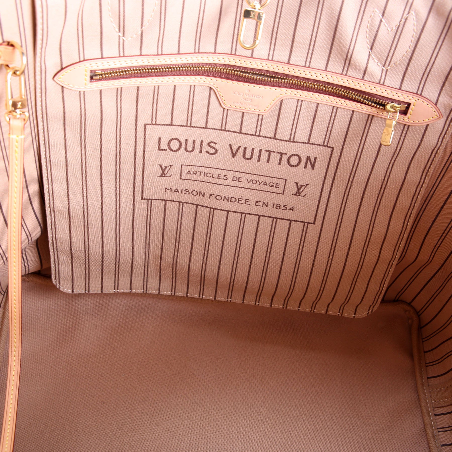 This pre-owned Louis Vuitton Neverfull with Wallet GM is guaranteed 100% authentic. The exterior is in the classic Louis Vuitton Coated Canvas Monogram