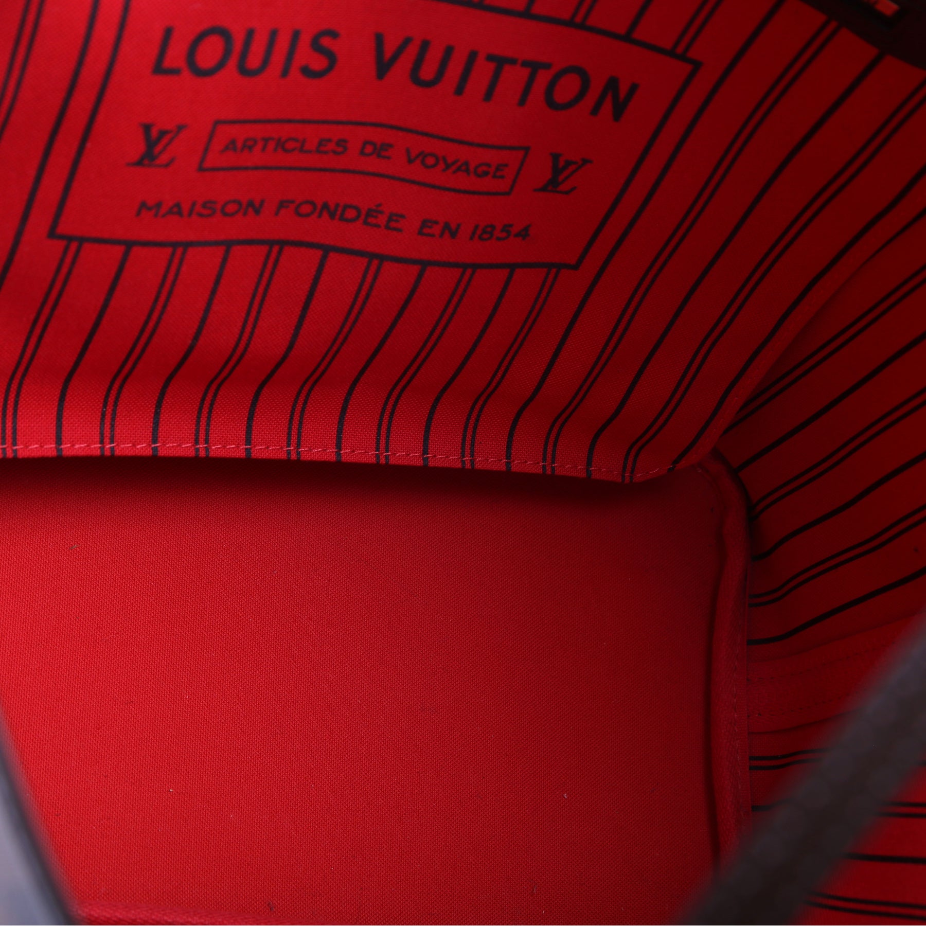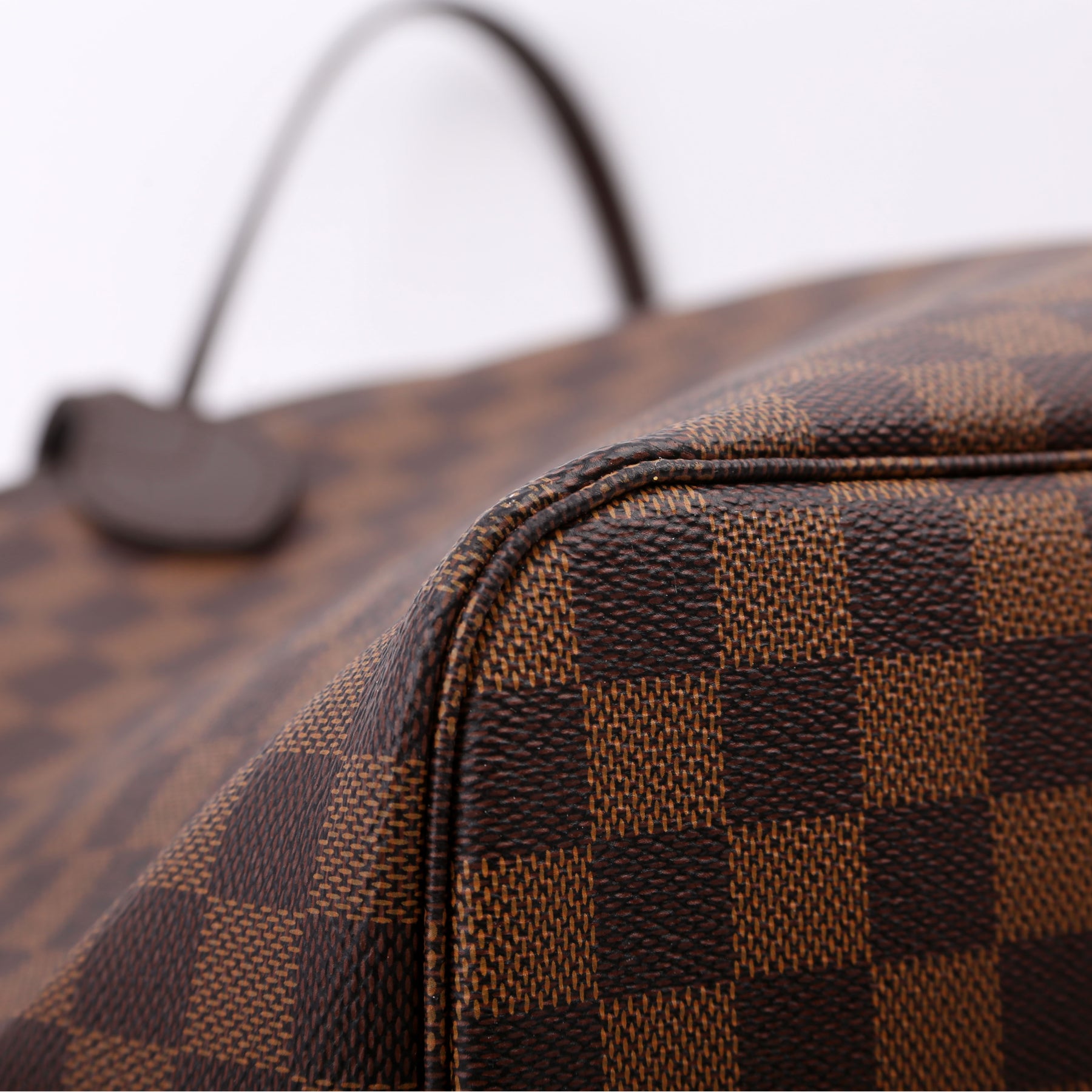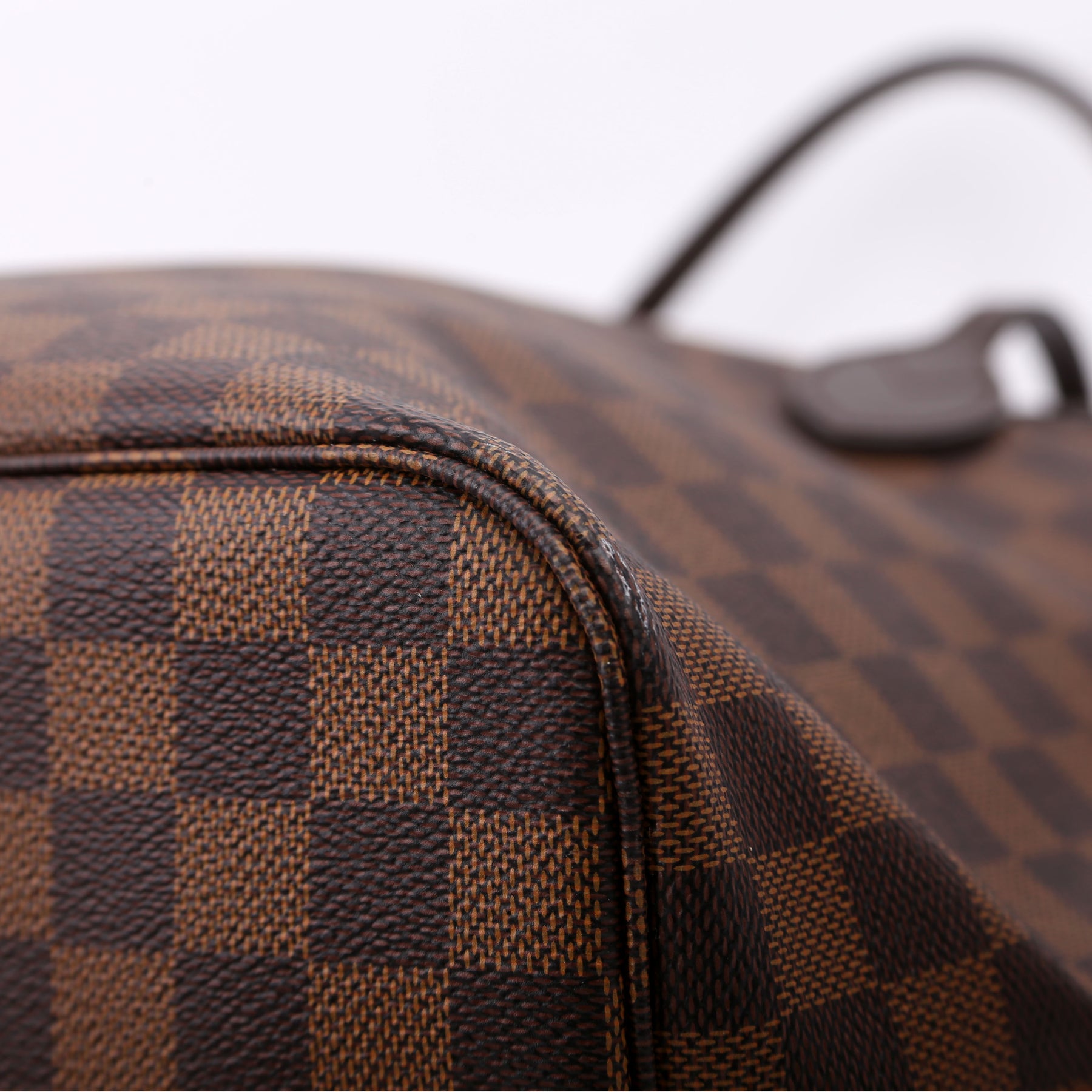 This pre-owned Louis Vuitton Neverfull MM W/Wallet is guaranteed 100% authentic. The exterior is in the classic Louis Vuitton Damier Ebene coated canvas.