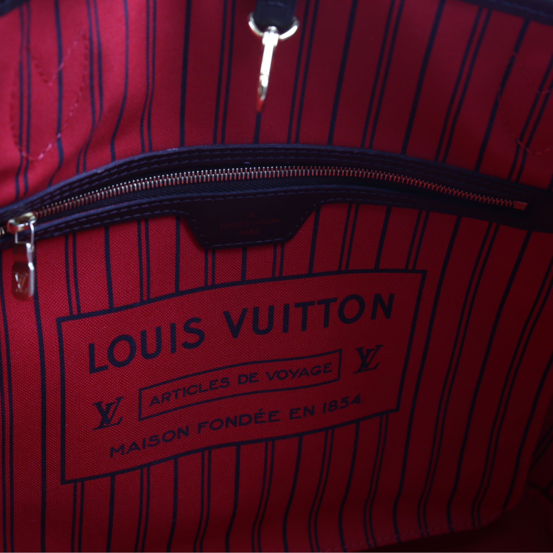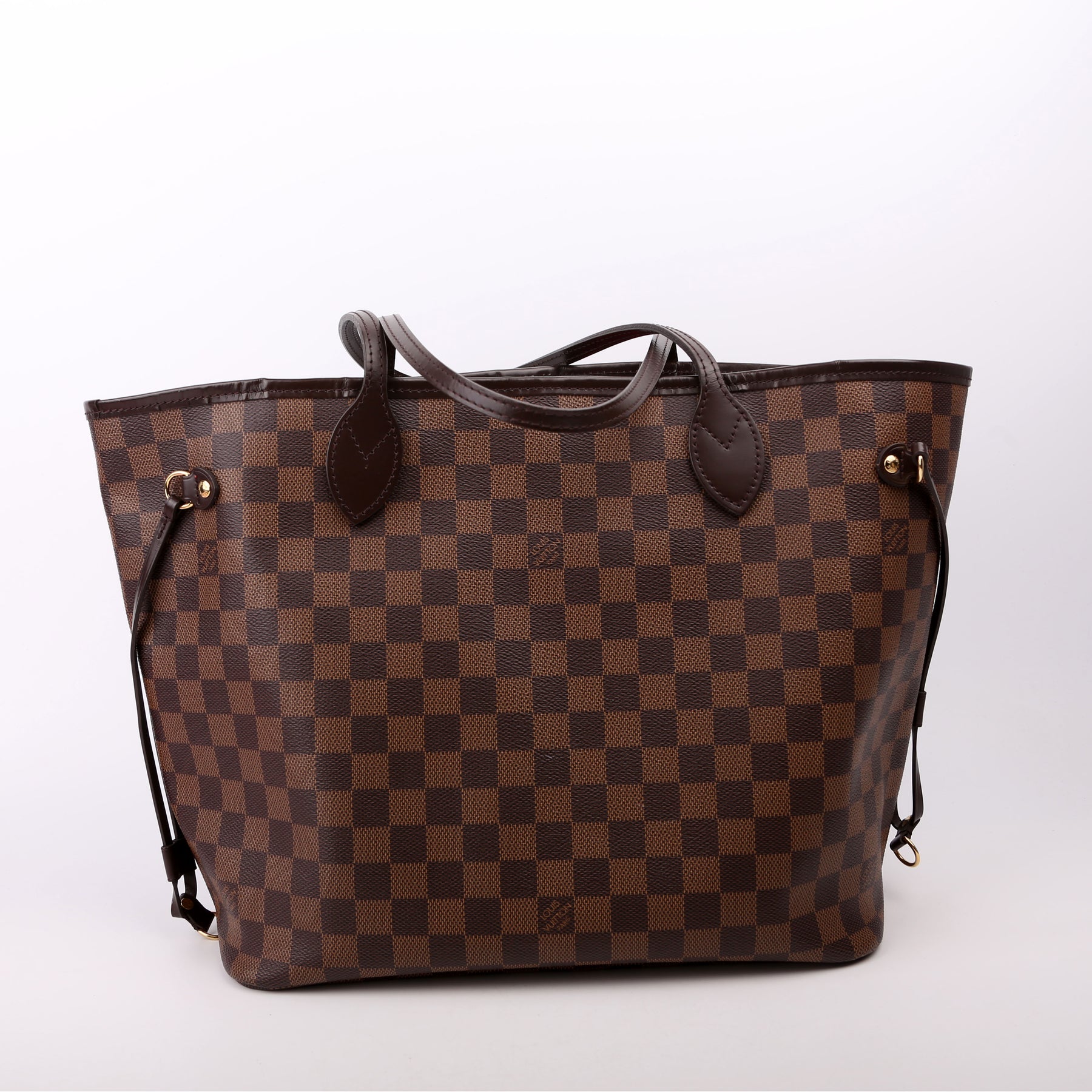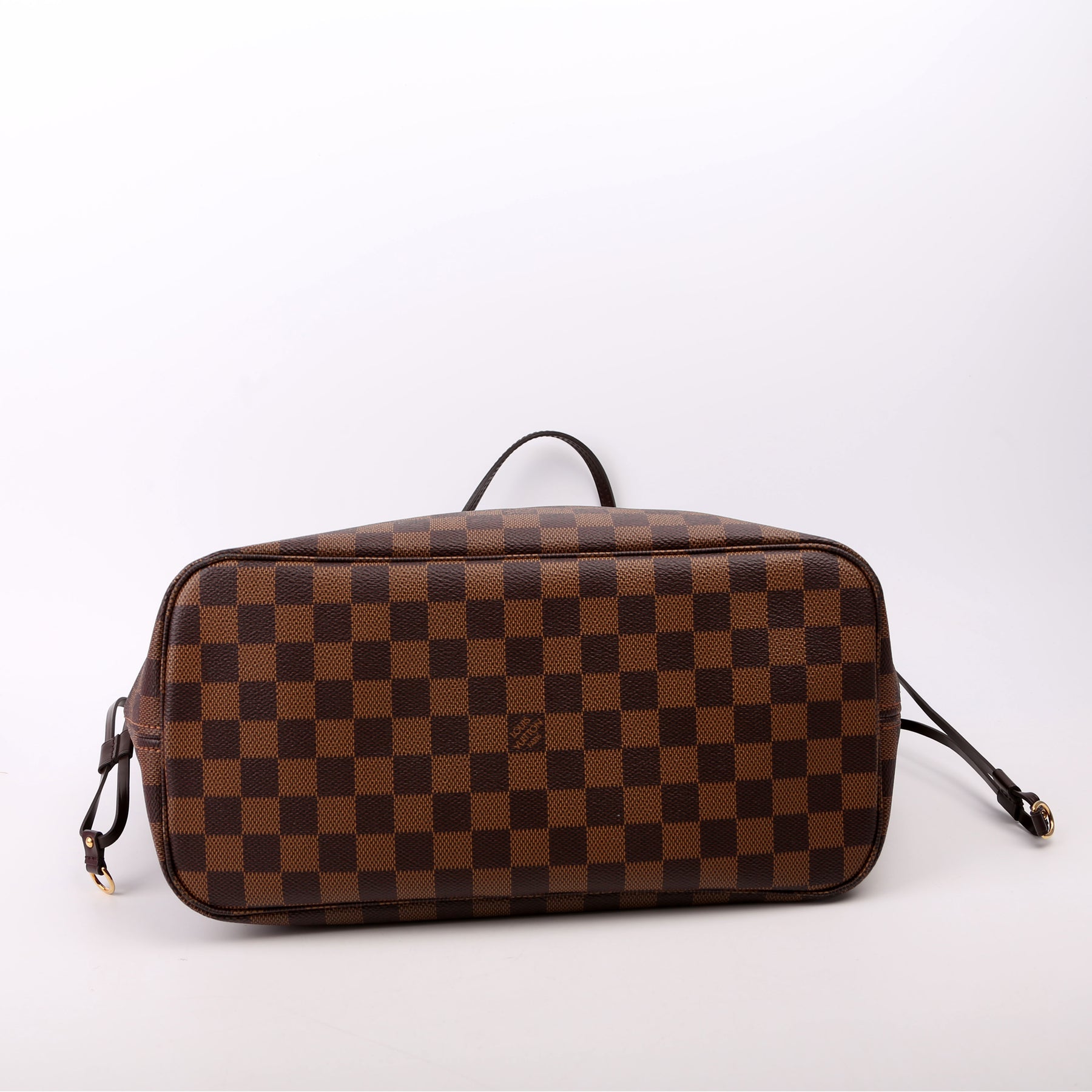This pre-owned Louis Vuitton Neverfull MM W/Wallet is guaranteed 100% authentic. The exterior is in the classic Louis Vuitton Damier Ebene coated canvas.