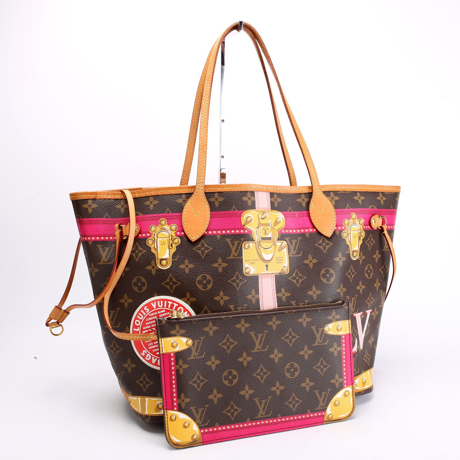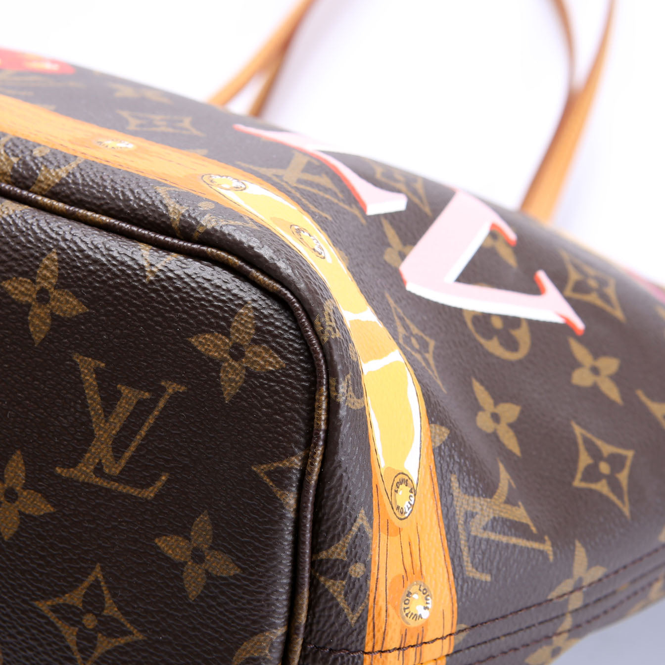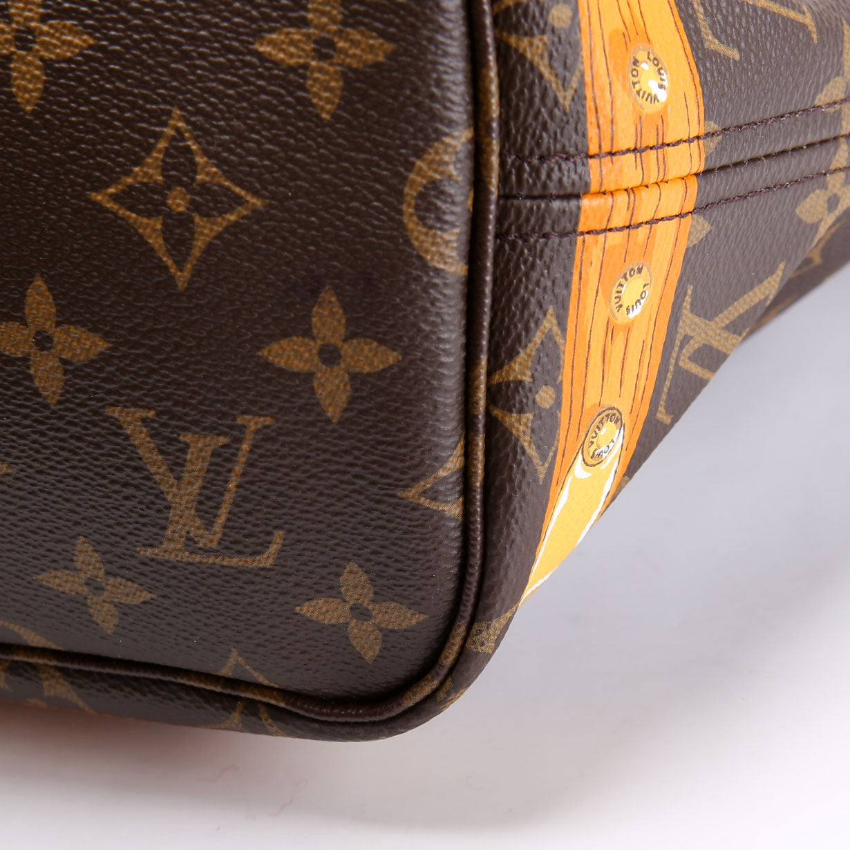 This pre-owned Louis Vuitton Neverfull With Wallet MM Summer Trunks is guaranteed 100% authentic. The exterior is in the classic Louis Vuitton Monogram coated canvas.
