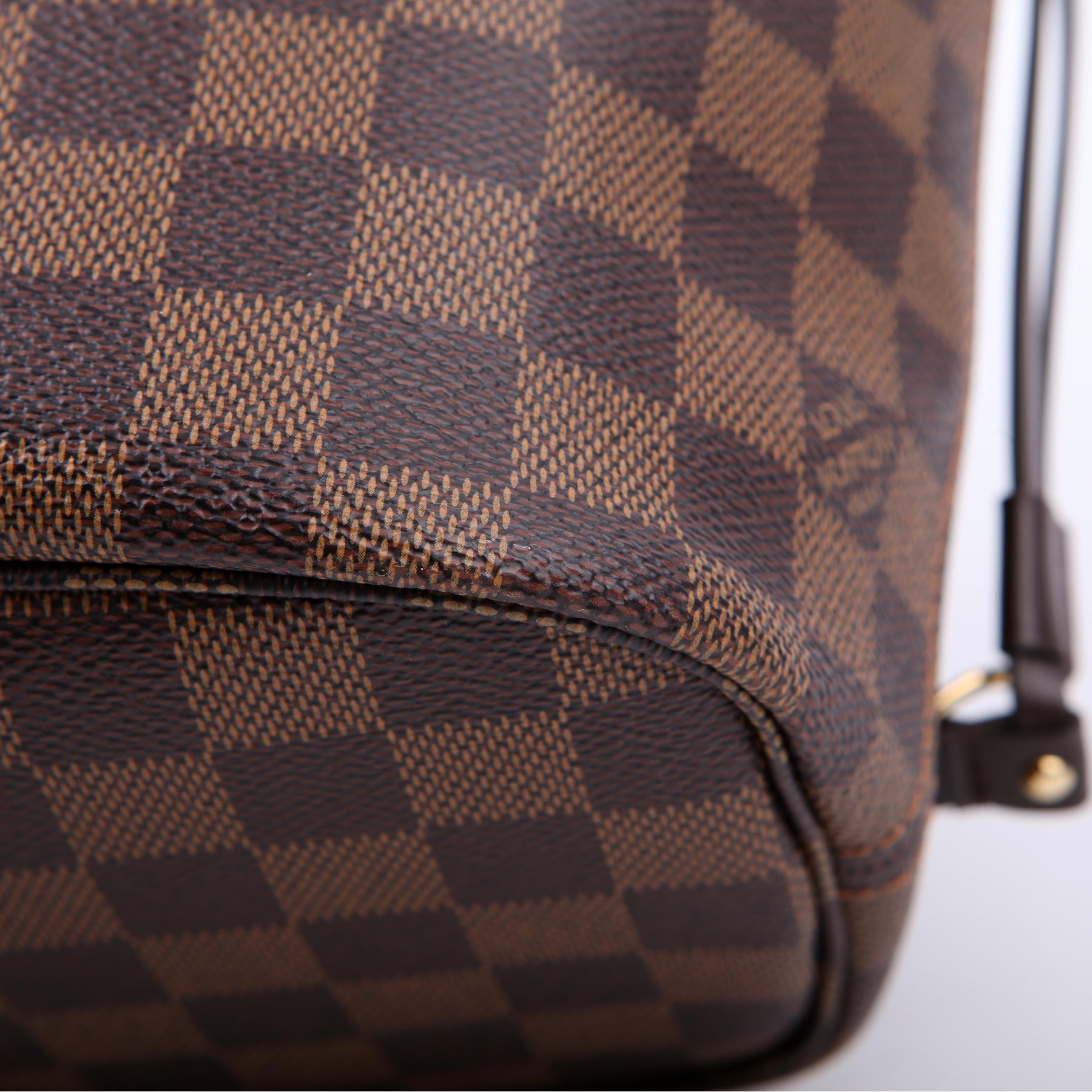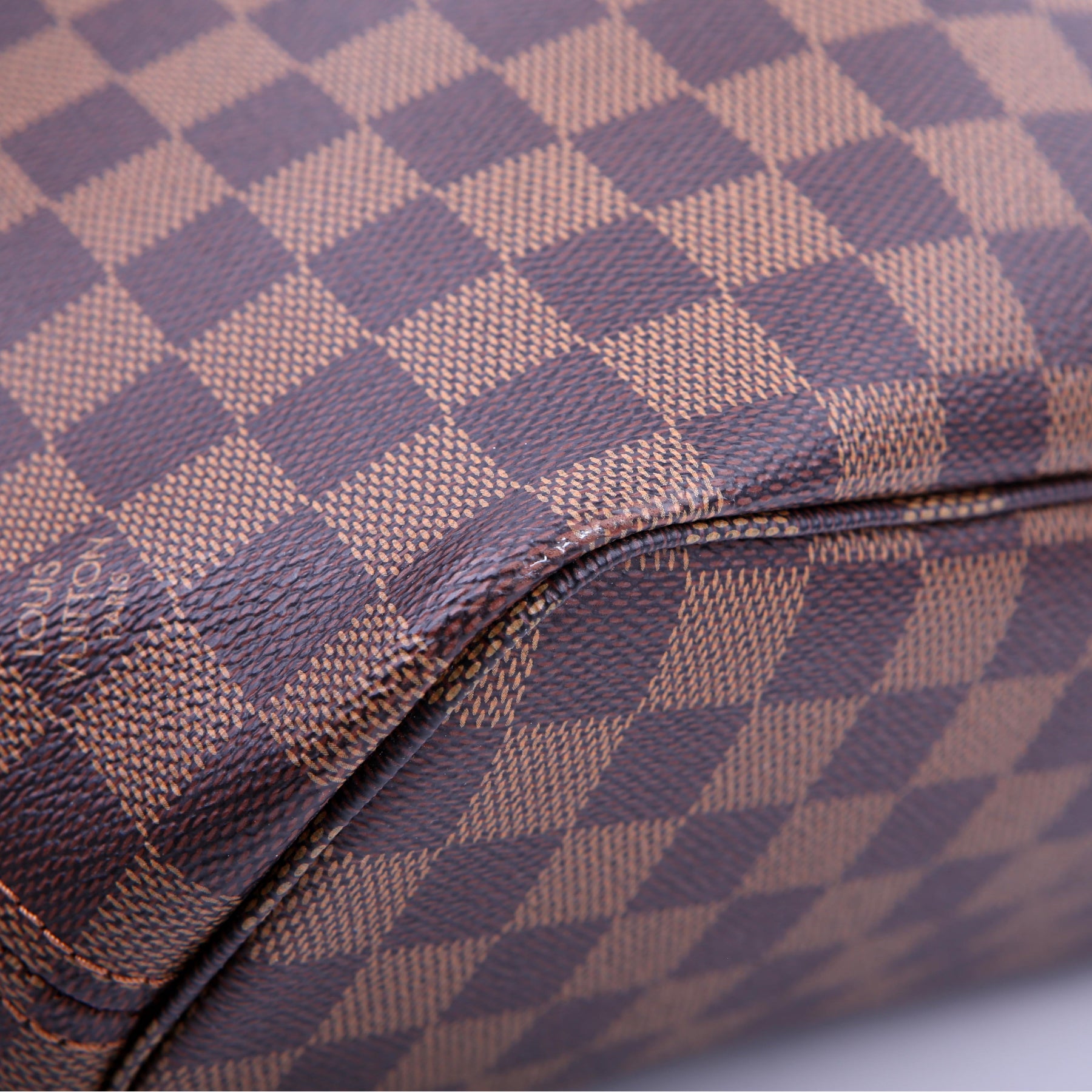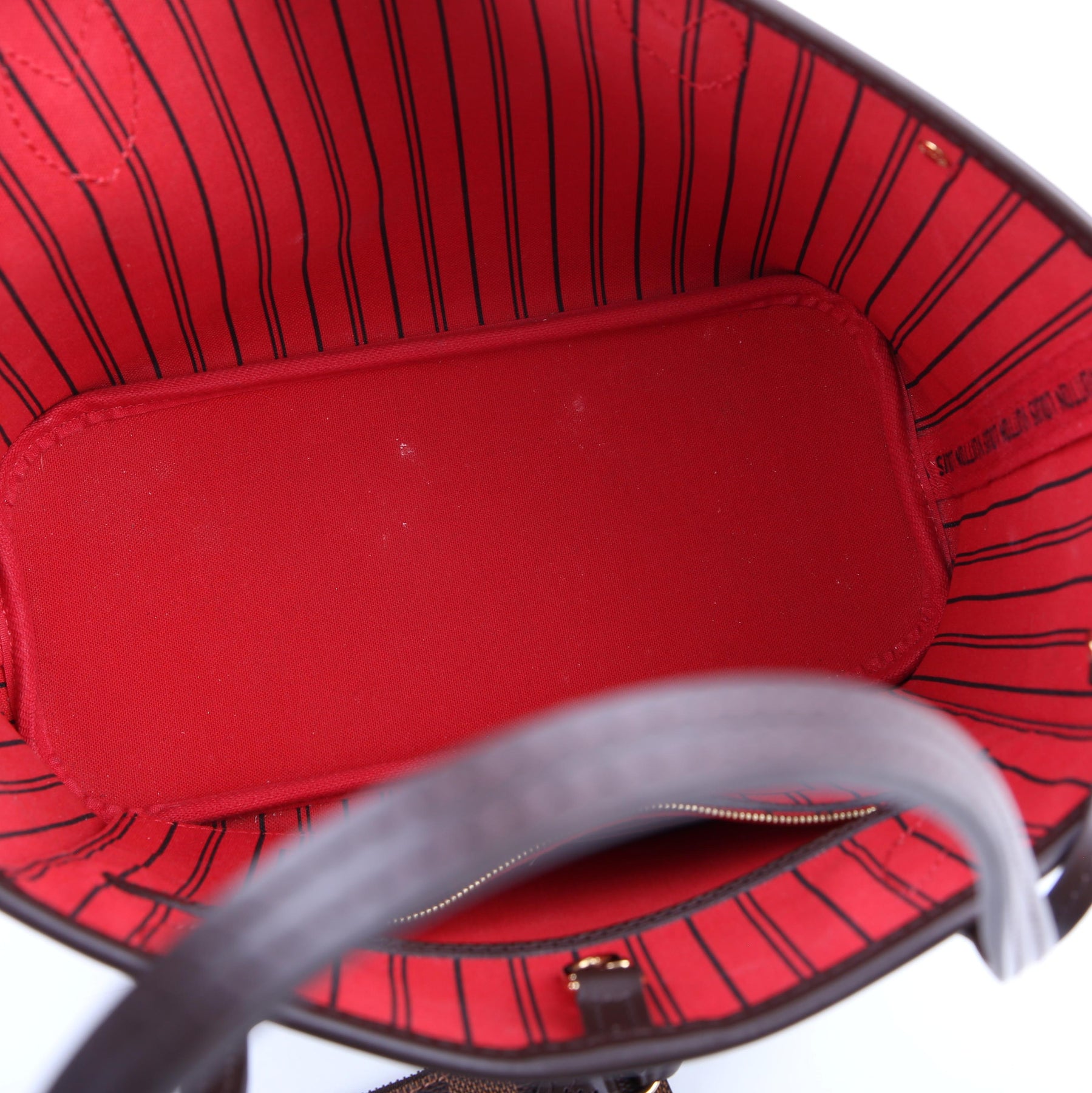 This pre-owned Louis Vuitton Neverfull with Wallet PM is guaranteed 100% authentic. The exterior is in the classic Louis Vuitton Damier Ebene coated canvas.