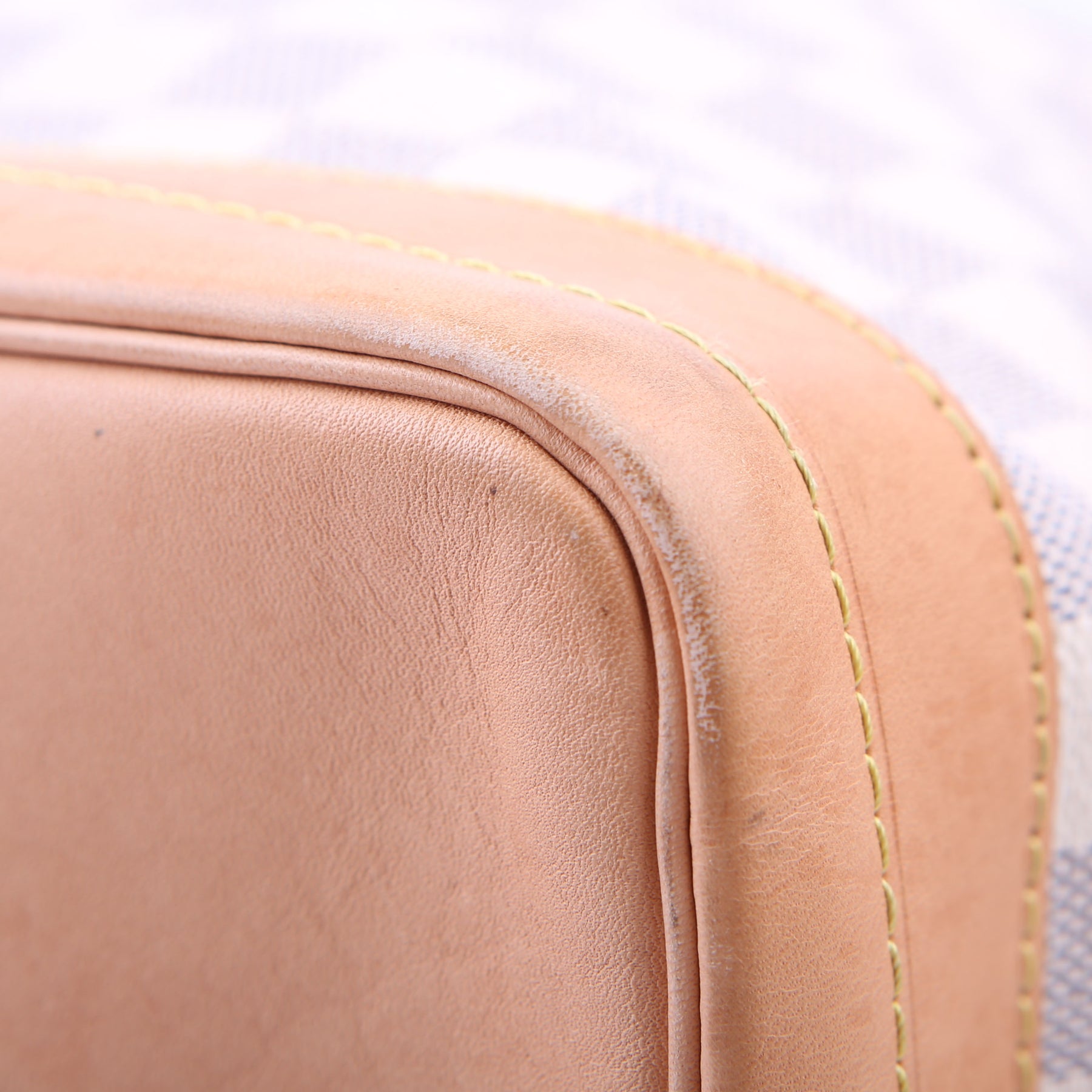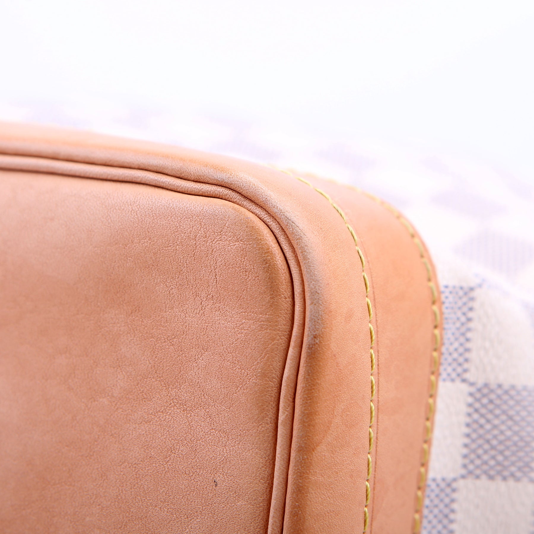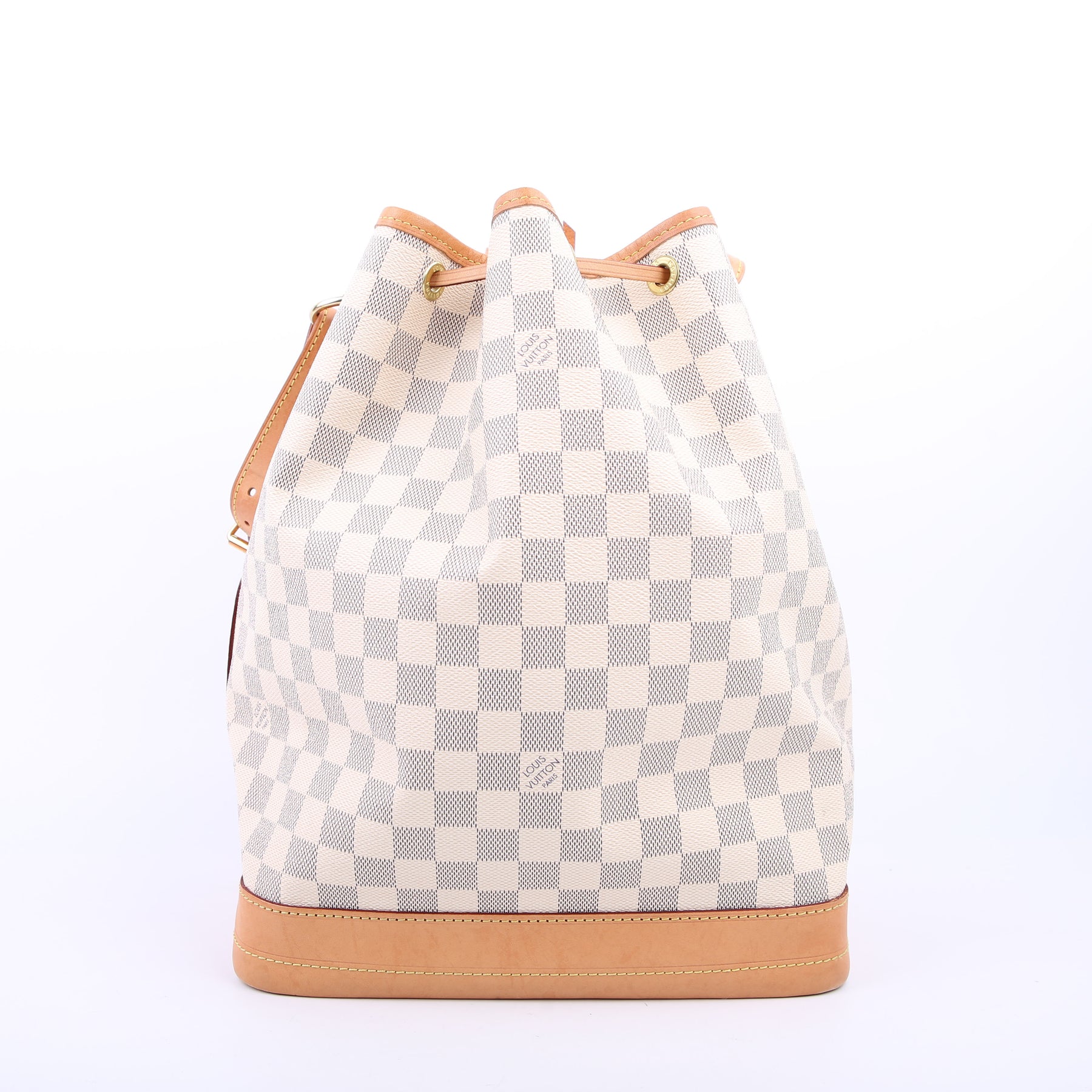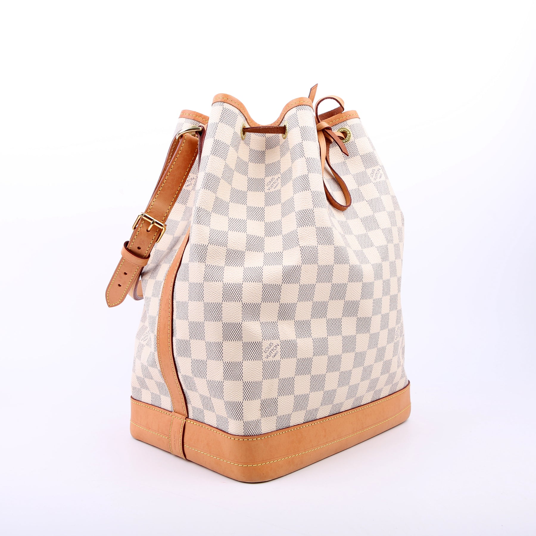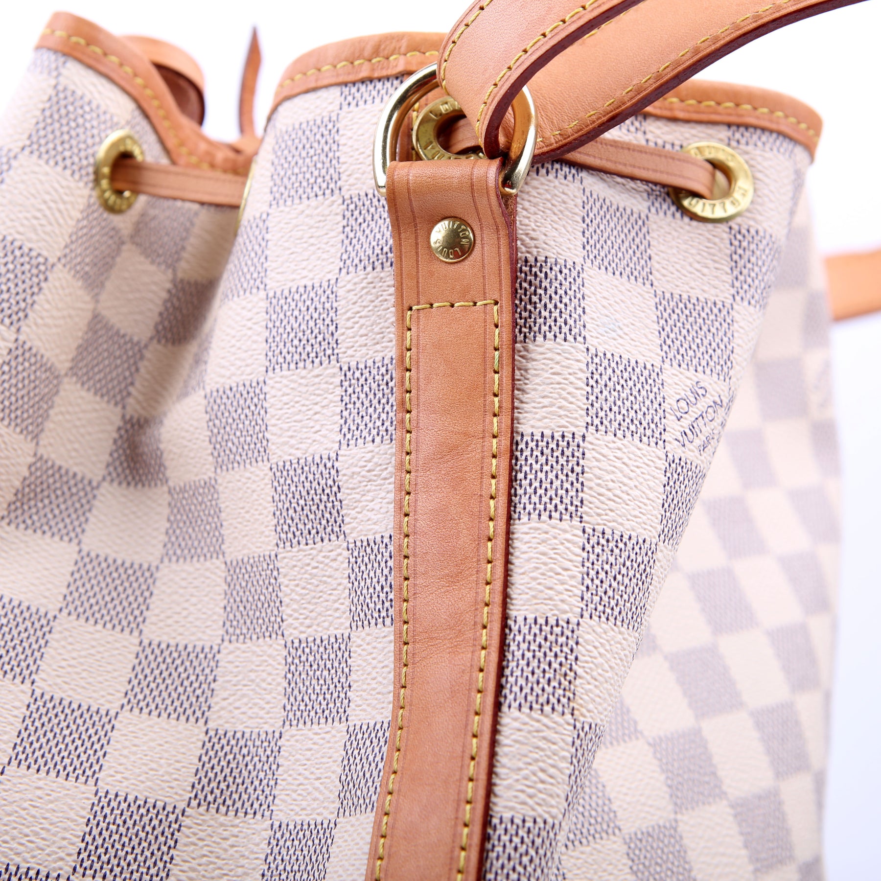 This pre-owned Louis Vuitton Noe is guaranteed 100% authentic. The exterior is in the classic Louis Vuitton Damier Azur coated canvas.
