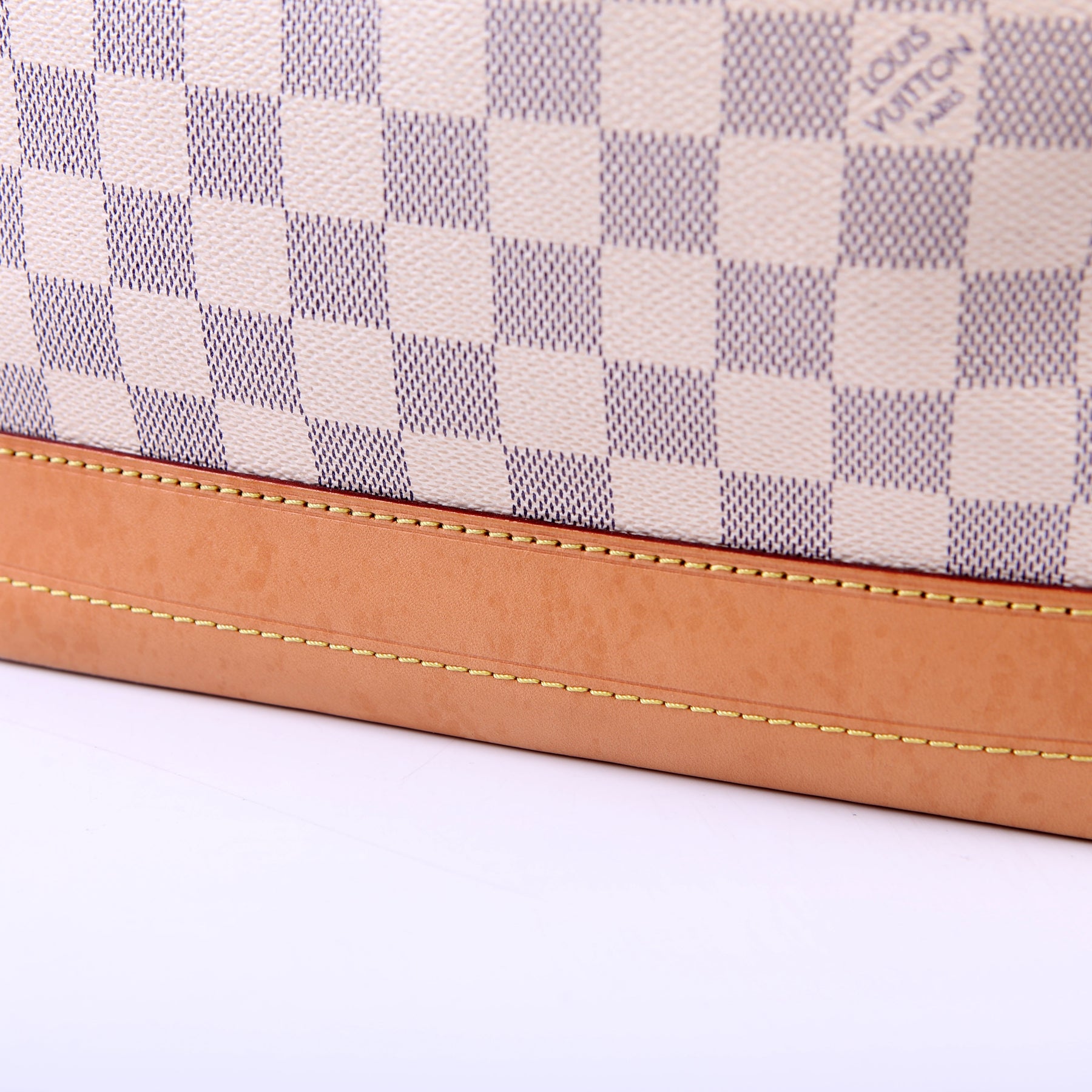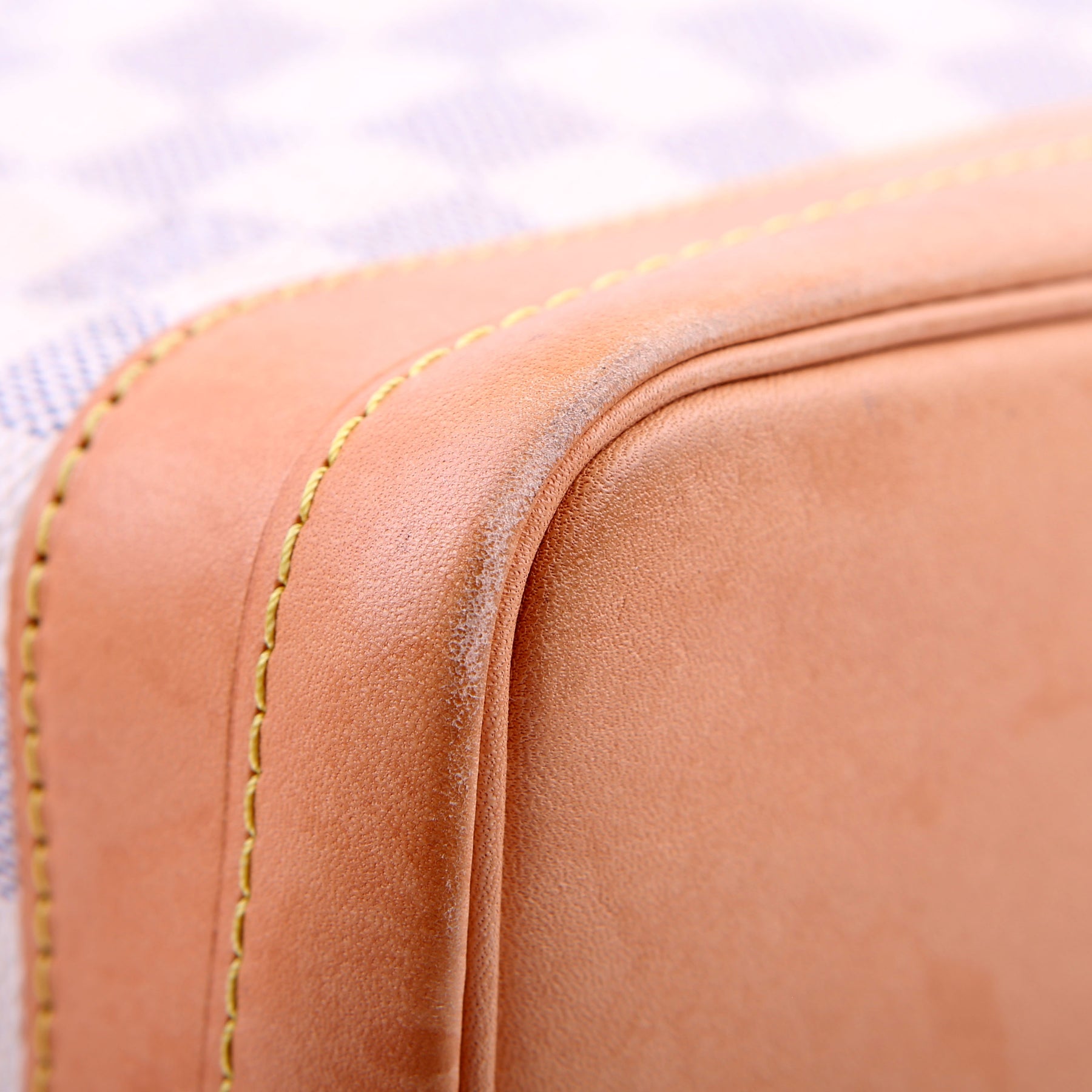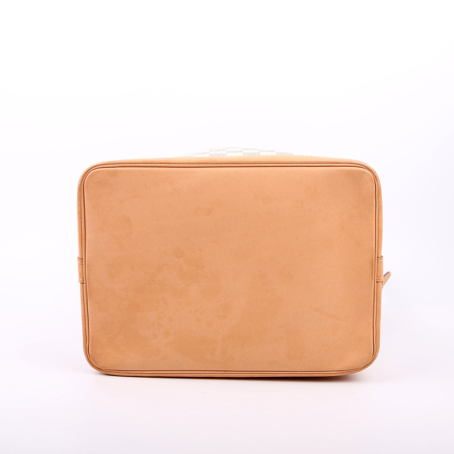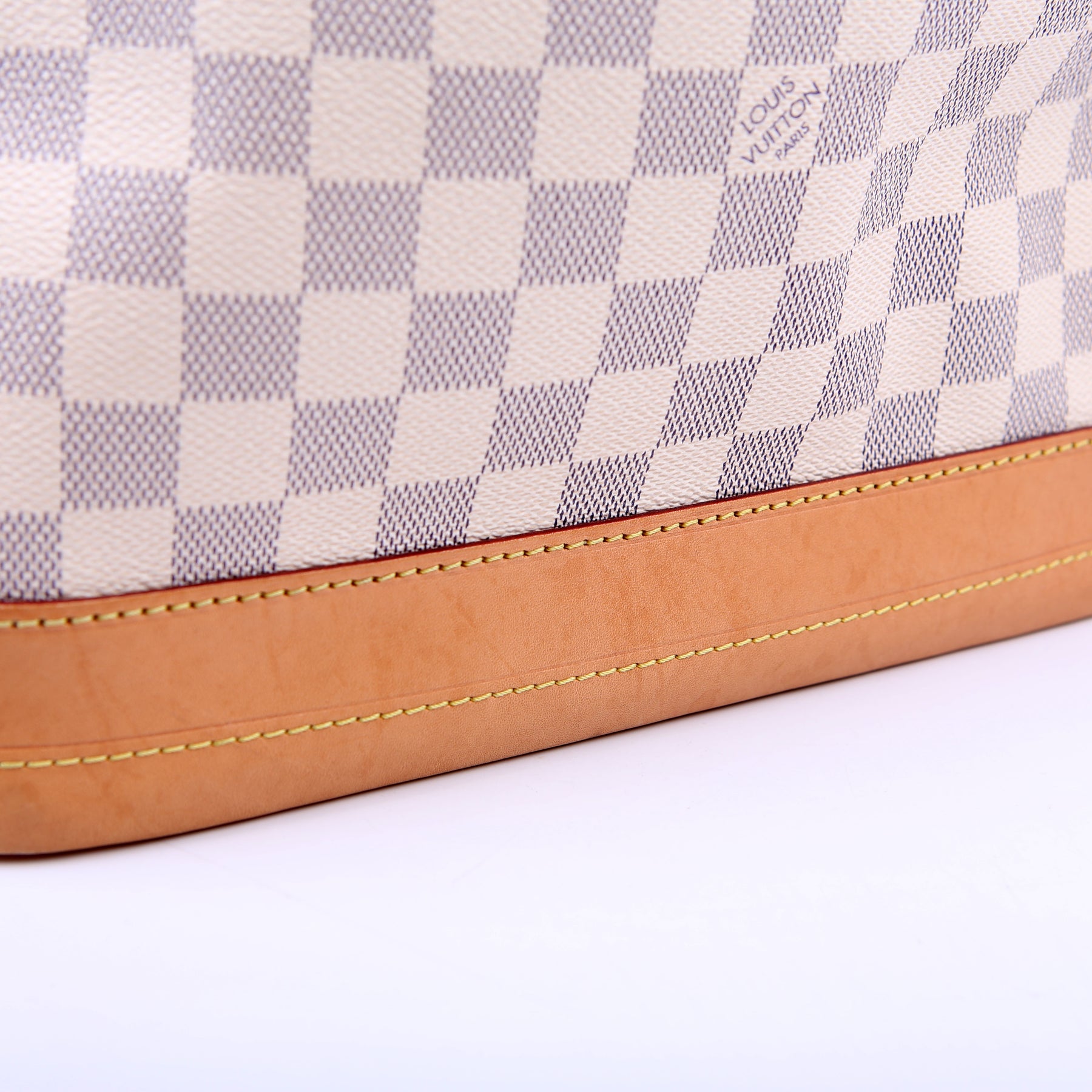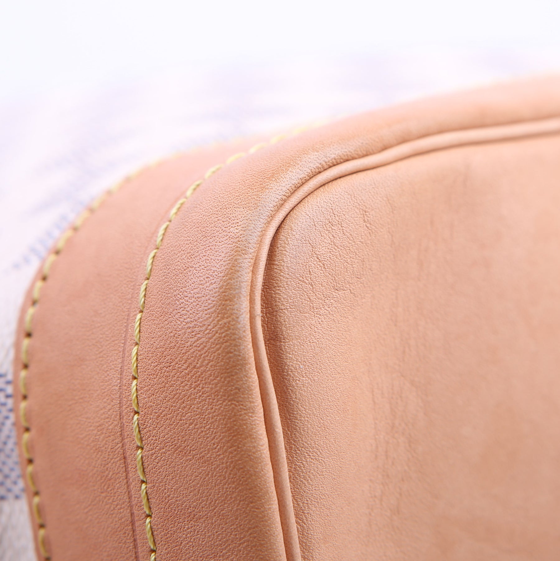 This pre-owned Louis Vuitton Noe is guaranteed 100% authentic. The exterior is in the classic Louis Vuitton Damier Azur coated canvas.