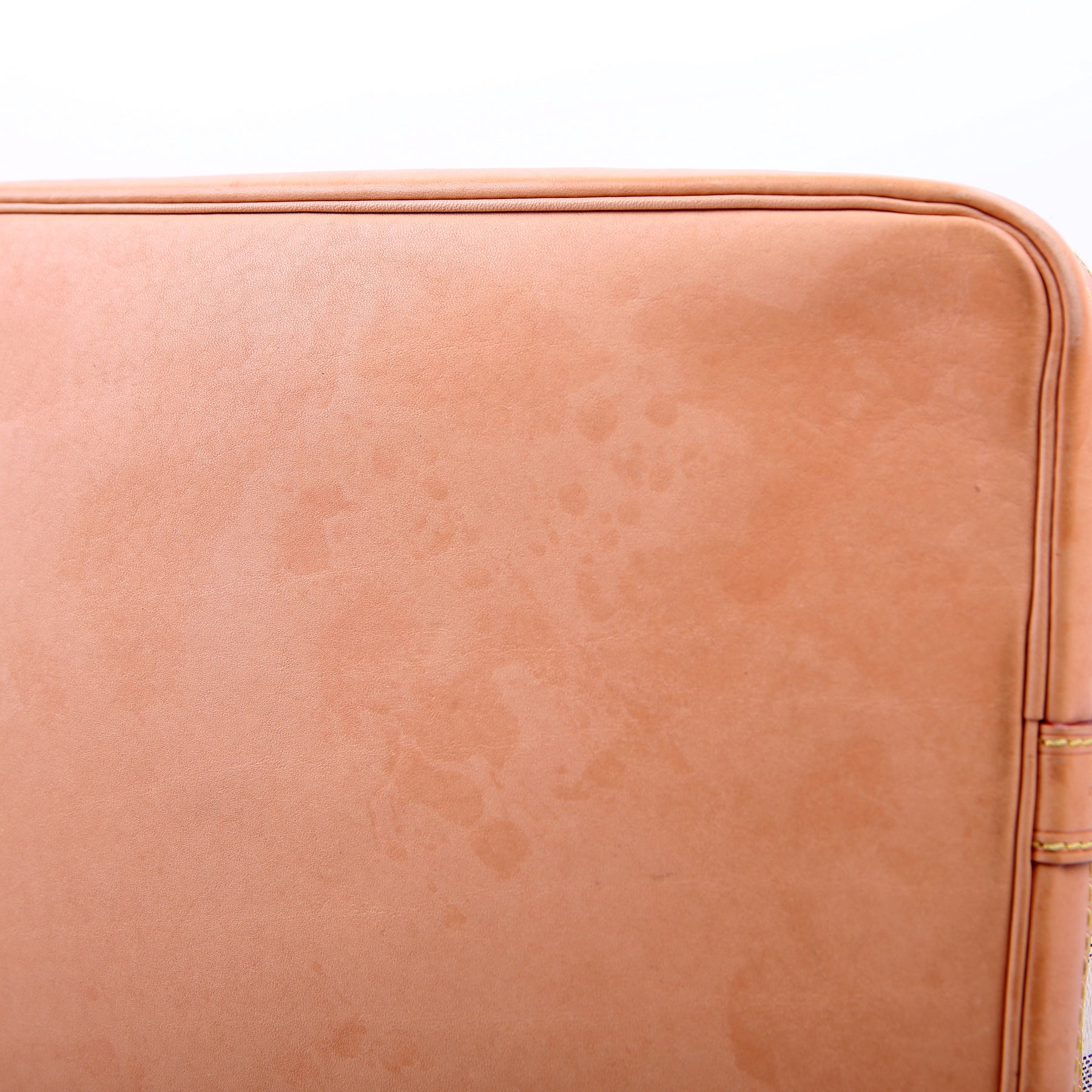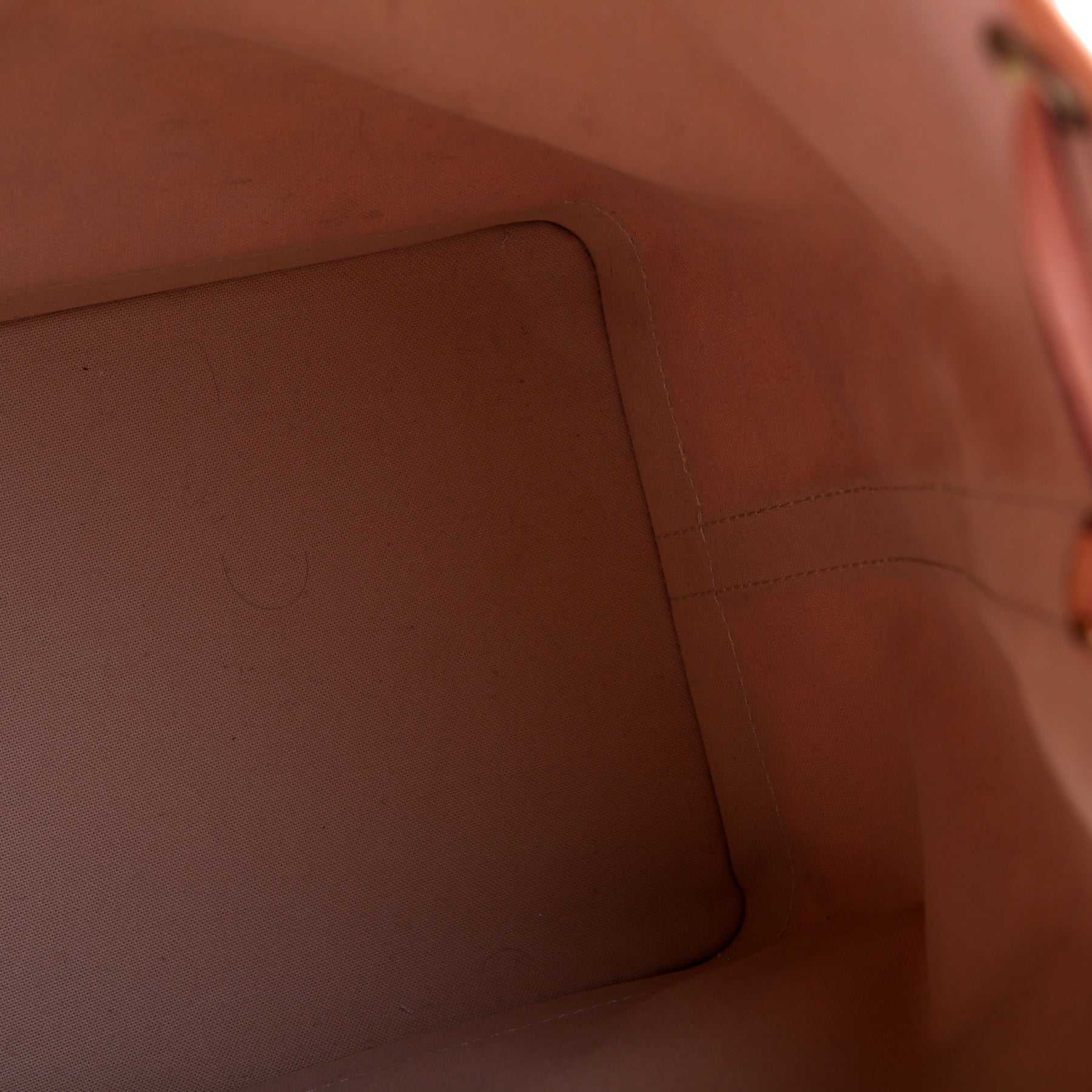 Exterior: The exterior coated canvas has light marks throughout. The corners show minor rubbing. The leather base and trim shows minor wear and discoloration.