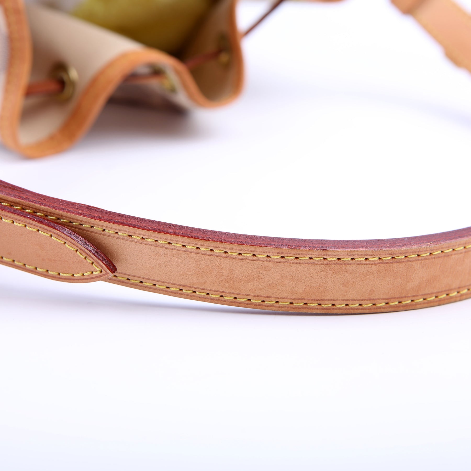 Hardware: The leather drawstring operates properly. The leather shows minor discoloration throughout.