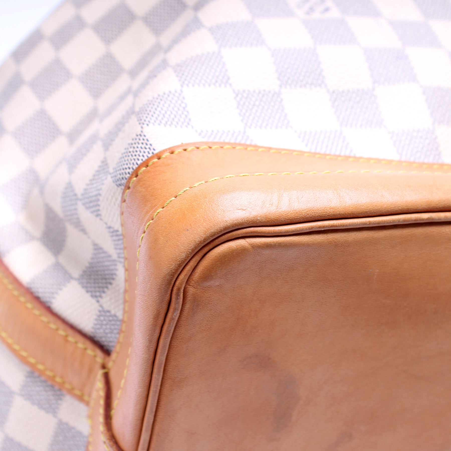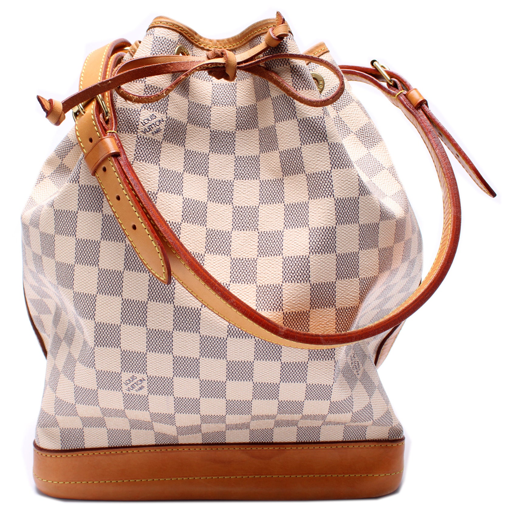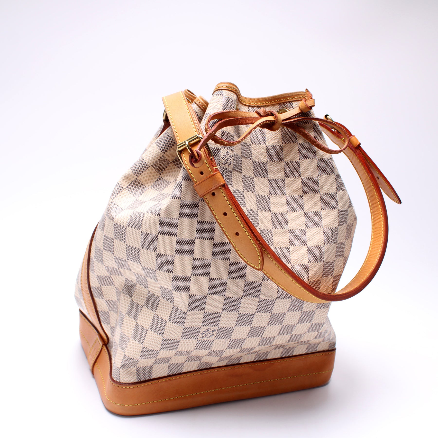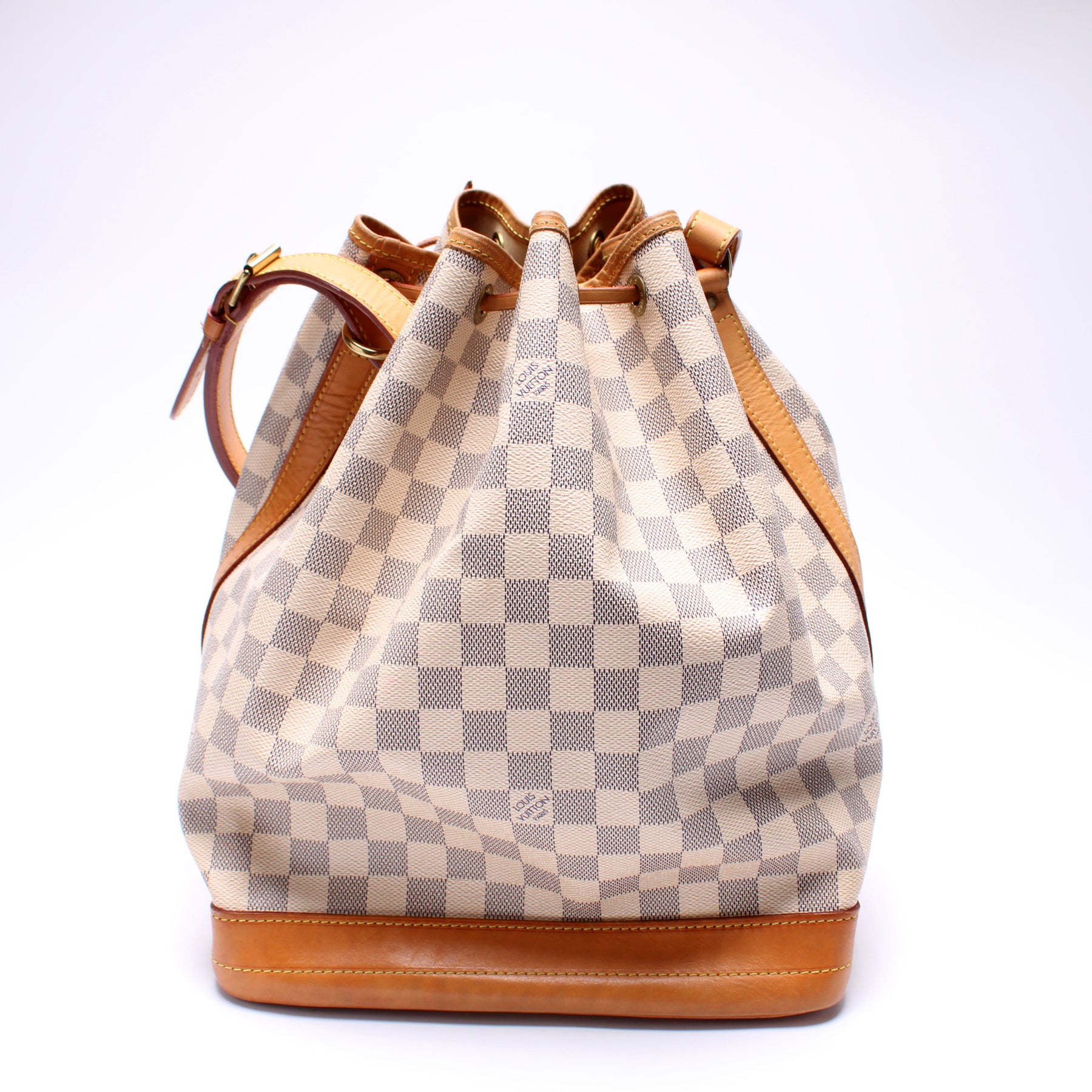 This pre-owned Louis Vuitton Noe is guaranteed 100% authentic. The exterior is in the classic Louis Vuitton Damier Azur coated canvas.