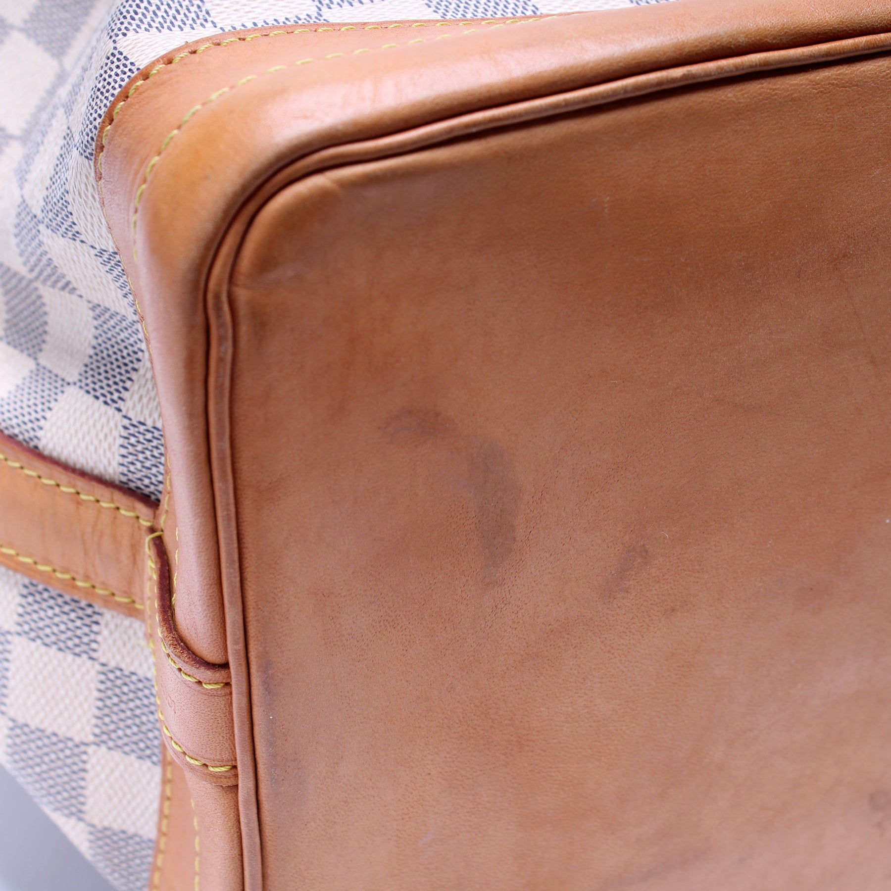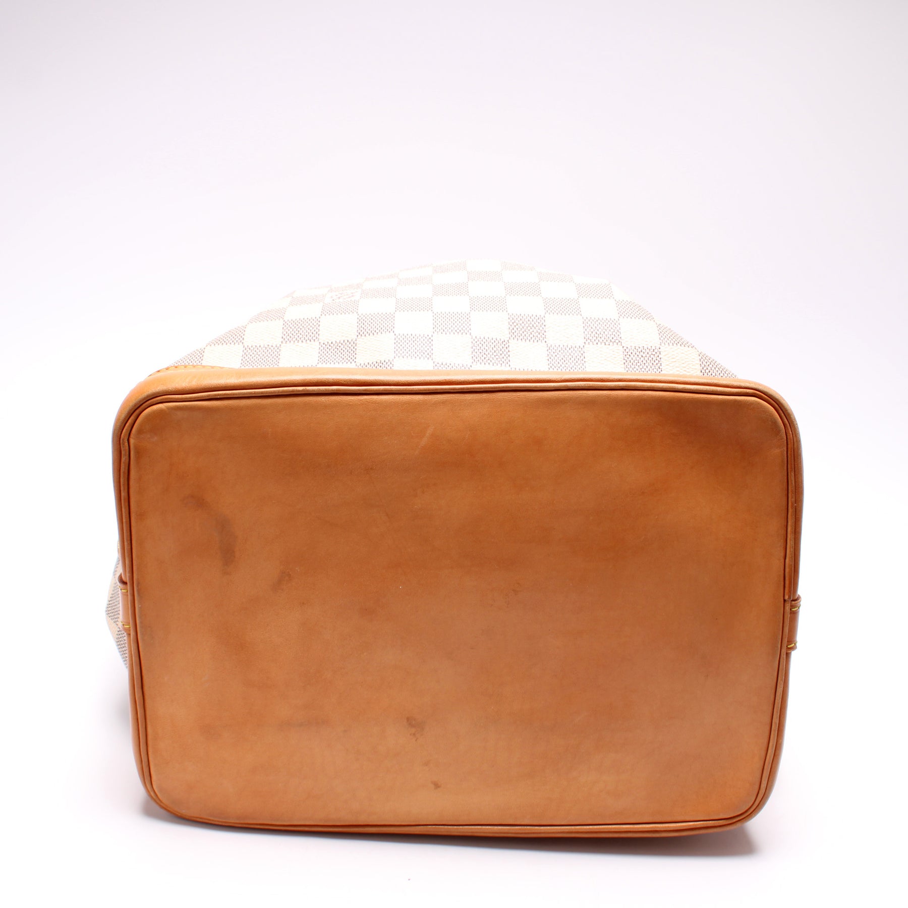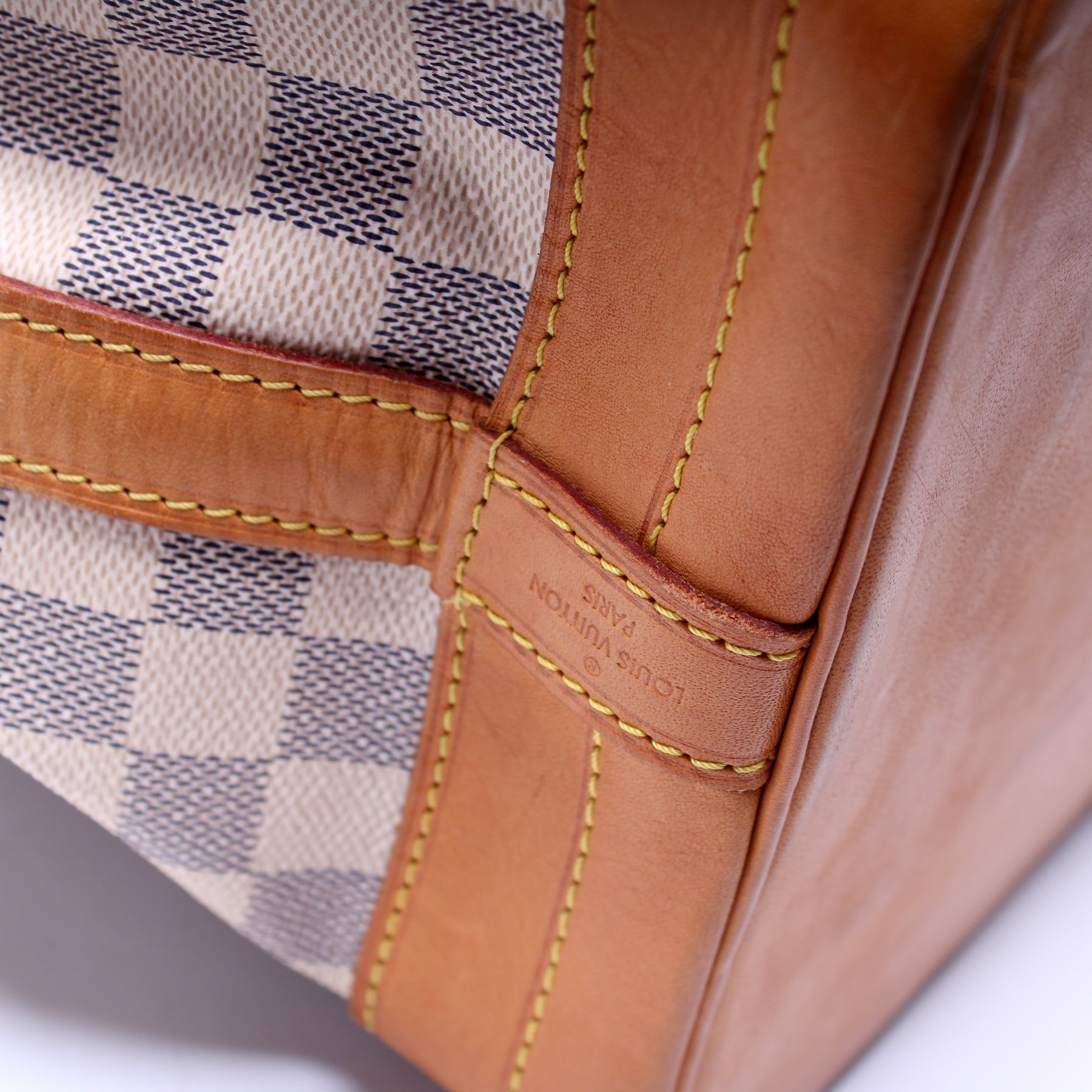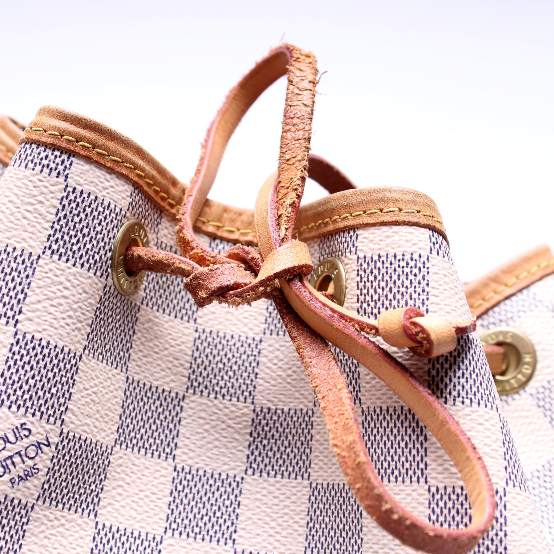 This pre-owned Louis Vuitton Noe is guaranteed 100% authentic. The exterior is in the classic Louis Vuitton Damier Azur coated canvas.