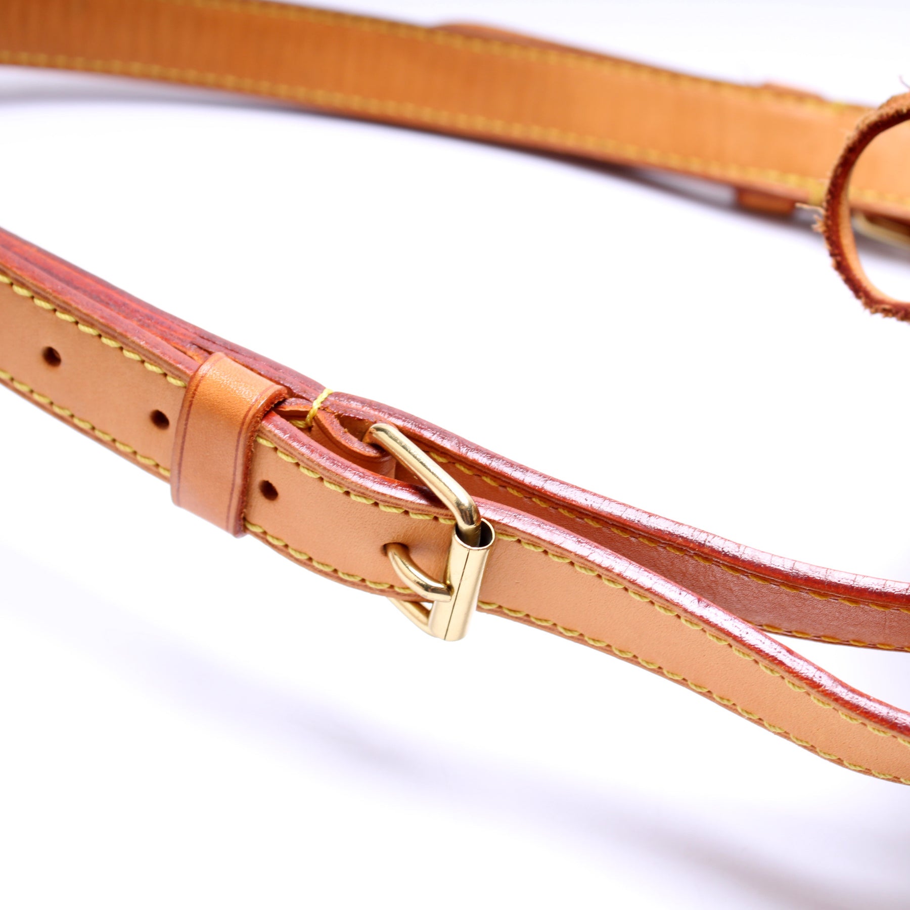 Hardware: The leather drawstring operates properly. The leather shows discoloration and wear throughout. The hardware shows discoloration and wear. 6