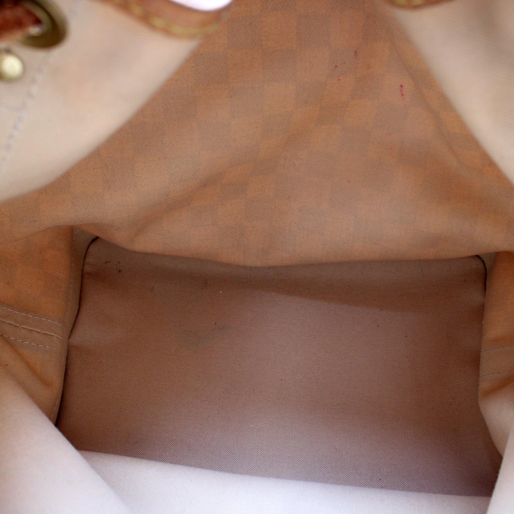 Exterior: The exterior coated canvas is free of any rips or cracks, there is minor discoloration throughout. The leather trim, base, and corners show discoloration and wear throughout. The pipping shows minor wear.