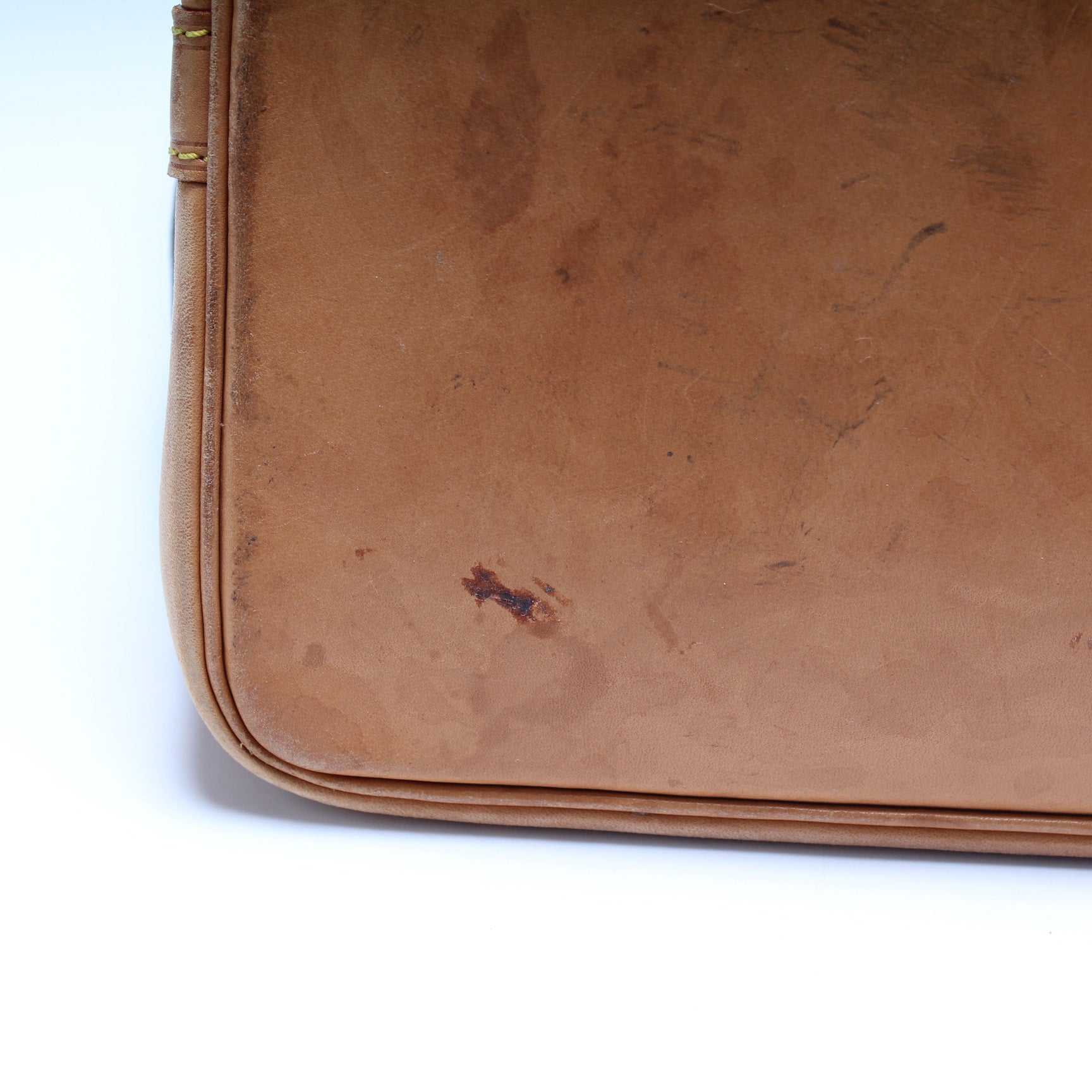 Exterior: The exterior coated canvas is free of any rips or cracks. The corners, leather trim, and leather base show discoloration and wear as pictured.