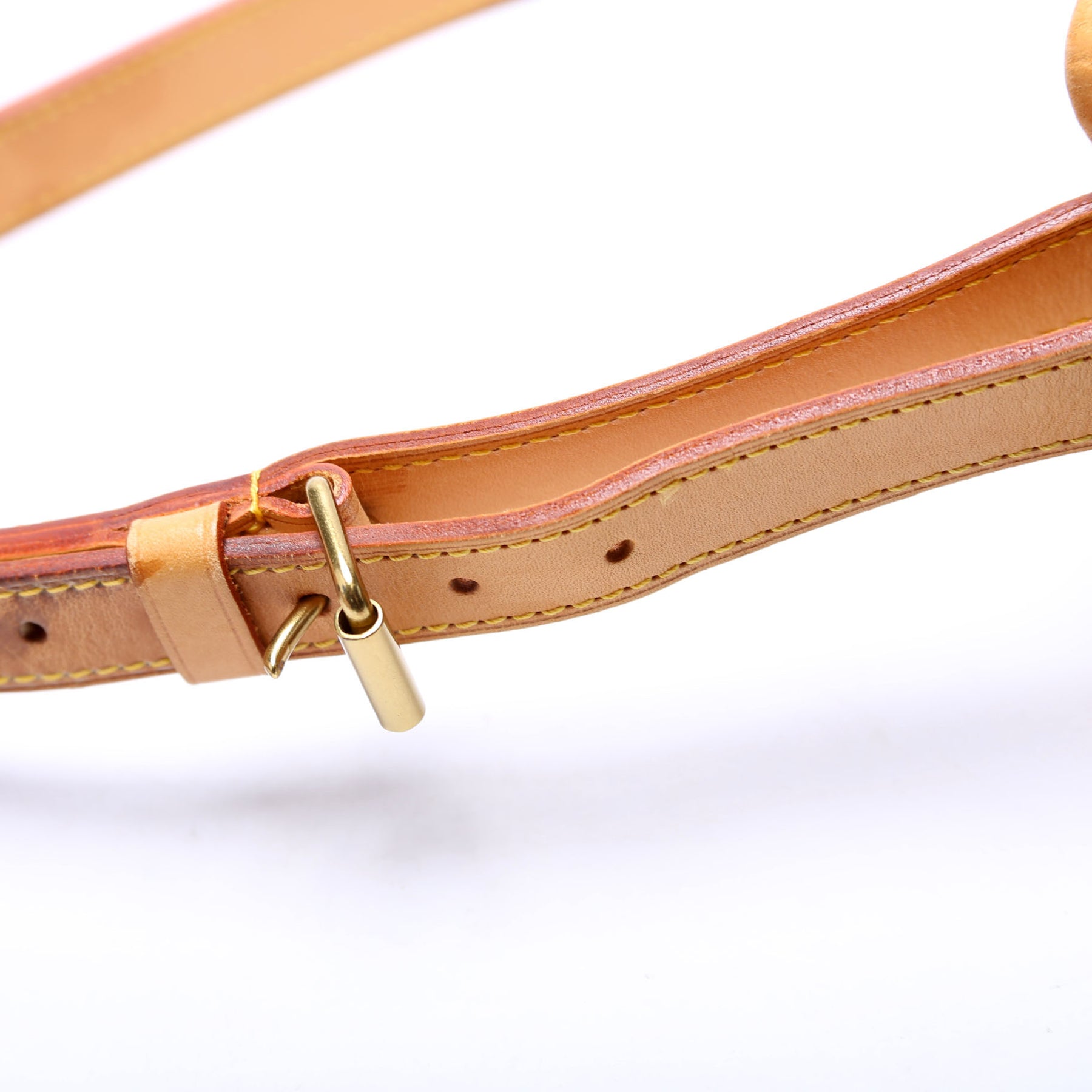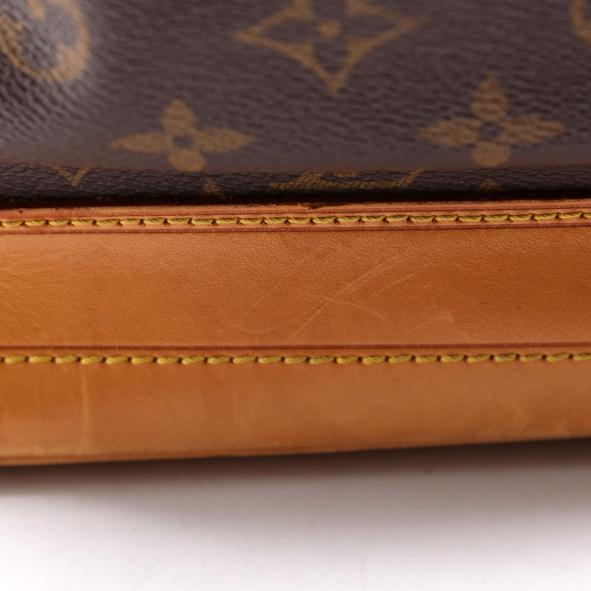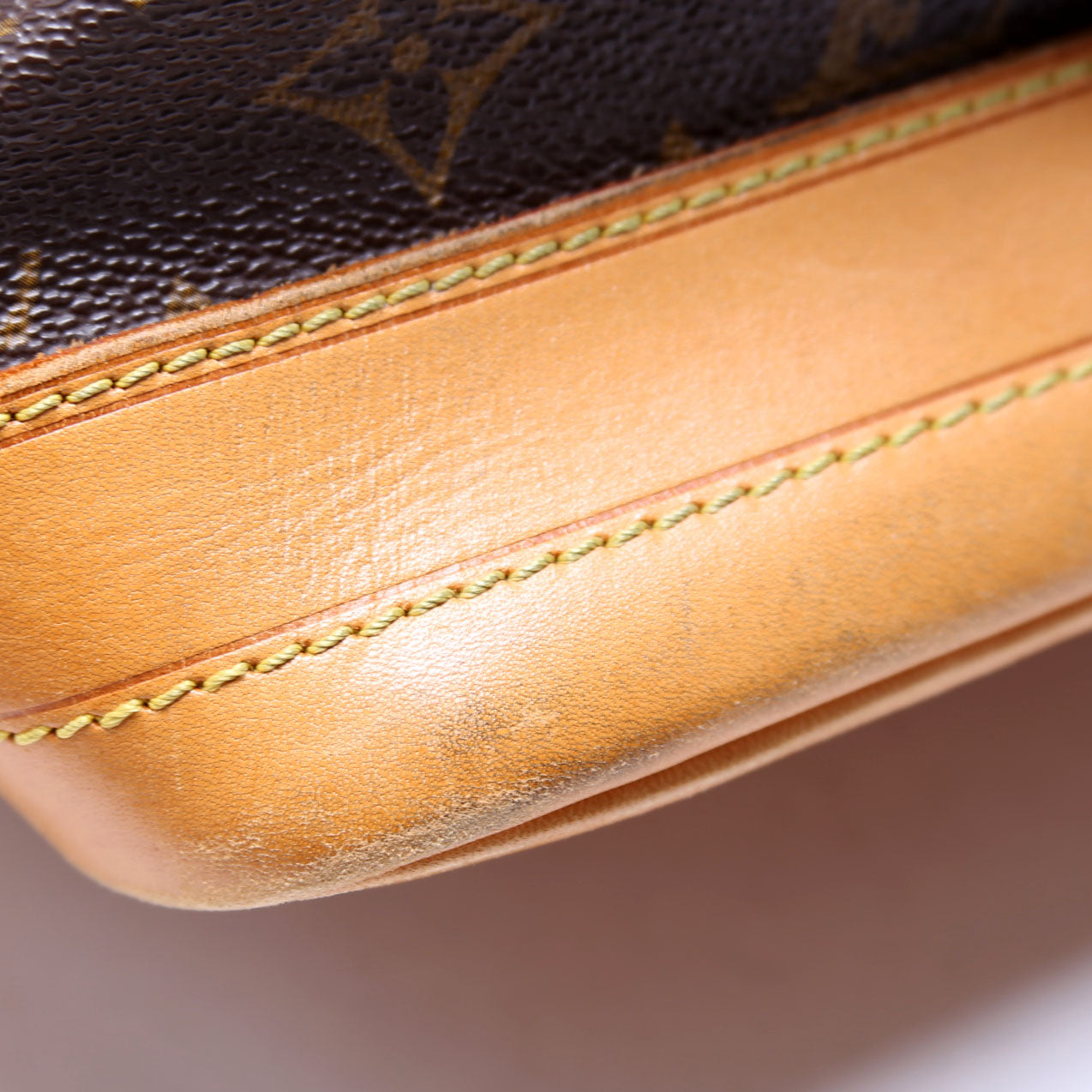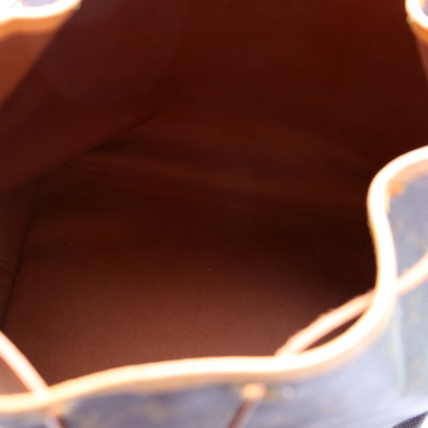 Hardware: The drawstring is fully intact and operates properly. The leather shows minor discoloration throughout.