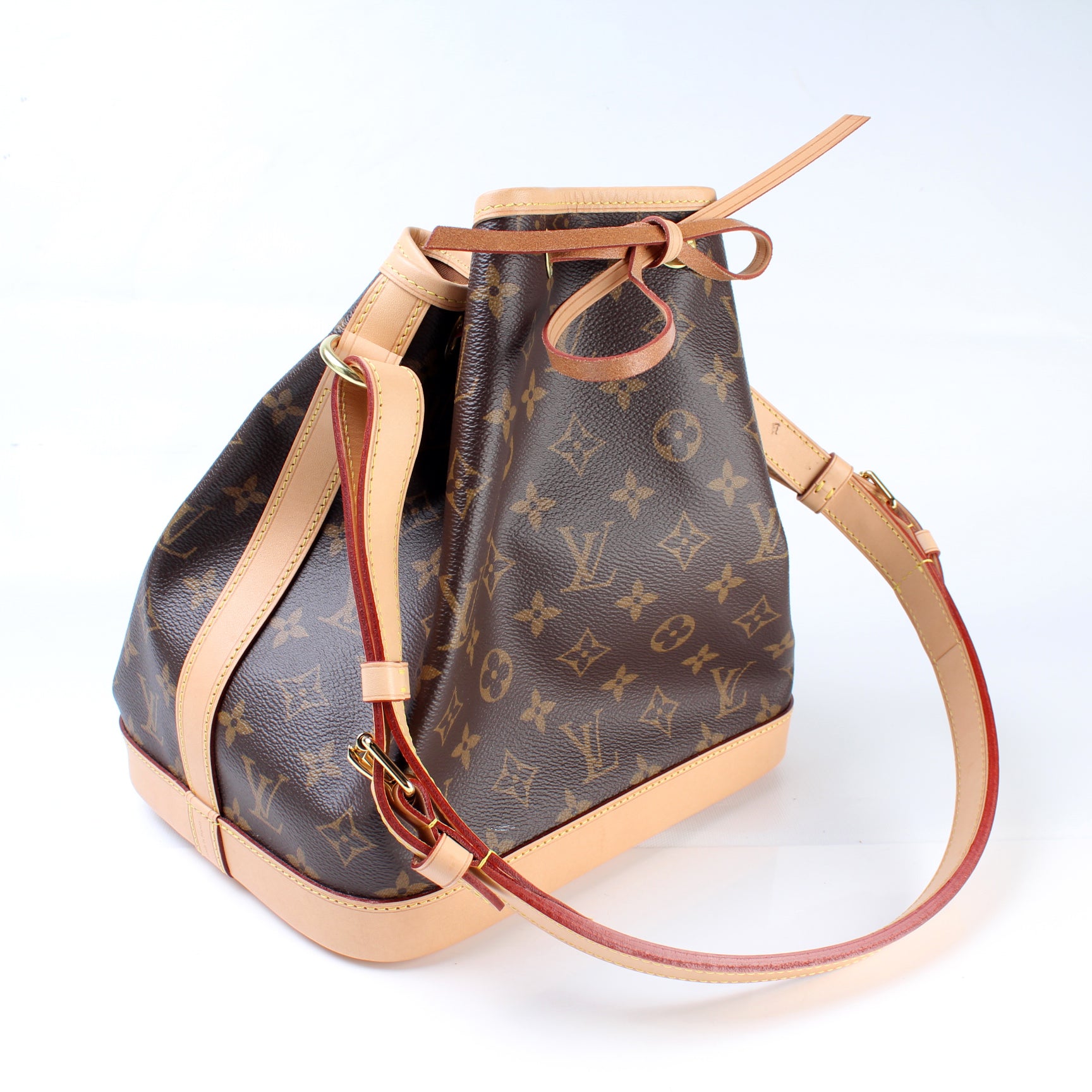 This pre-owned Louis Vuitton Noe Petit NM is guaranteed 100% authentic. The exterior is in the classic Louis Vuitton Monogram coated canvas.