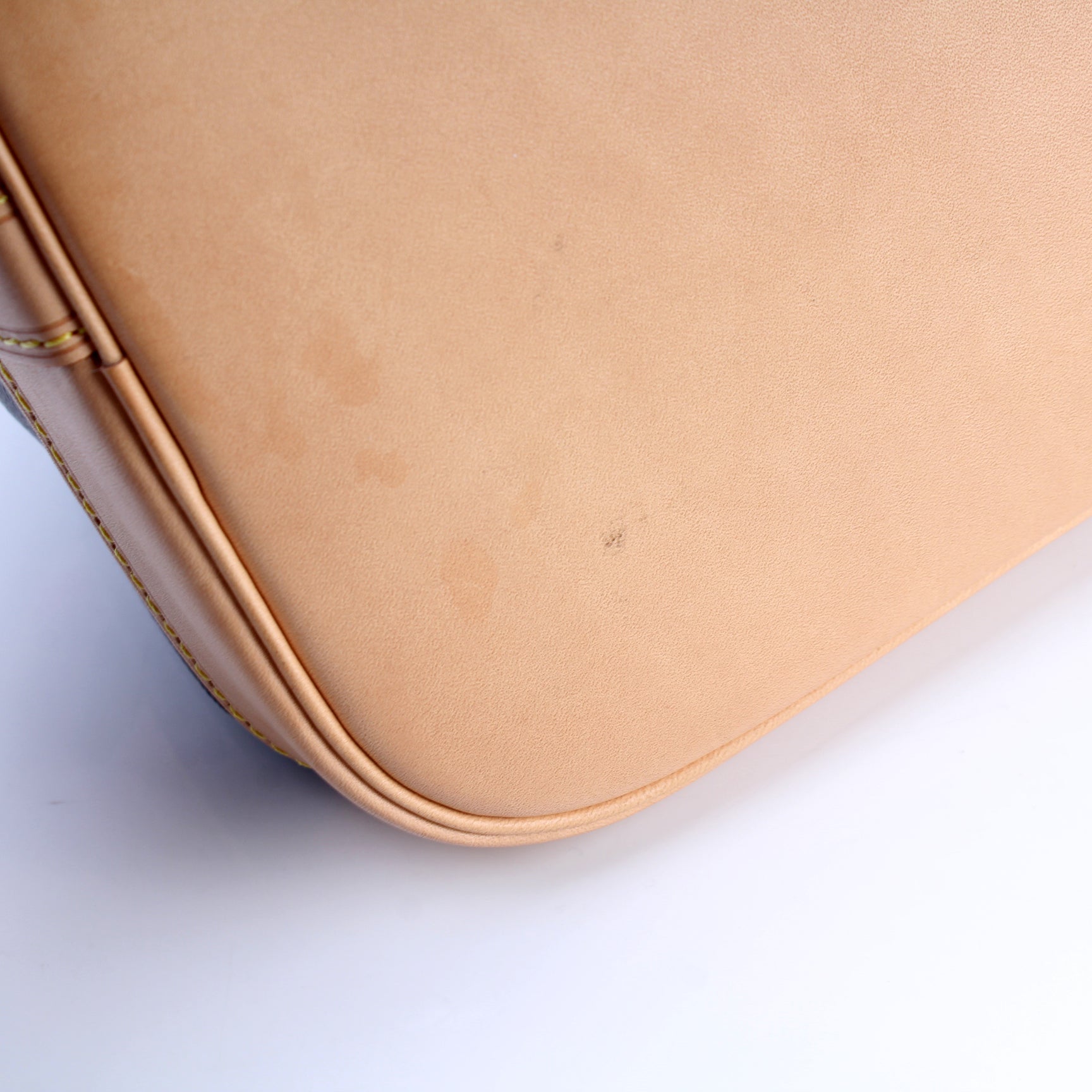 Exterior: The exterior coated canvas is free of any rips or cracks. The leather base shows minor discoloration.