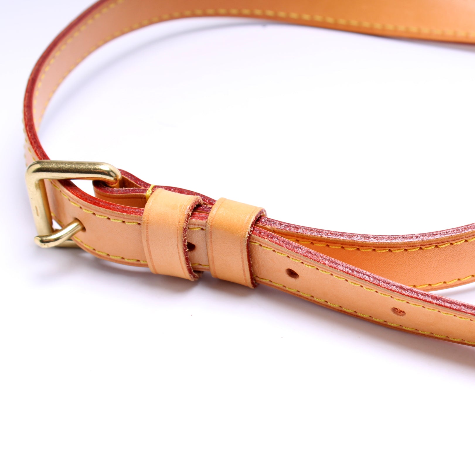Strap: The leather shoulder strap shows some wear and discoloration. The pipping shows minor wear throughout.