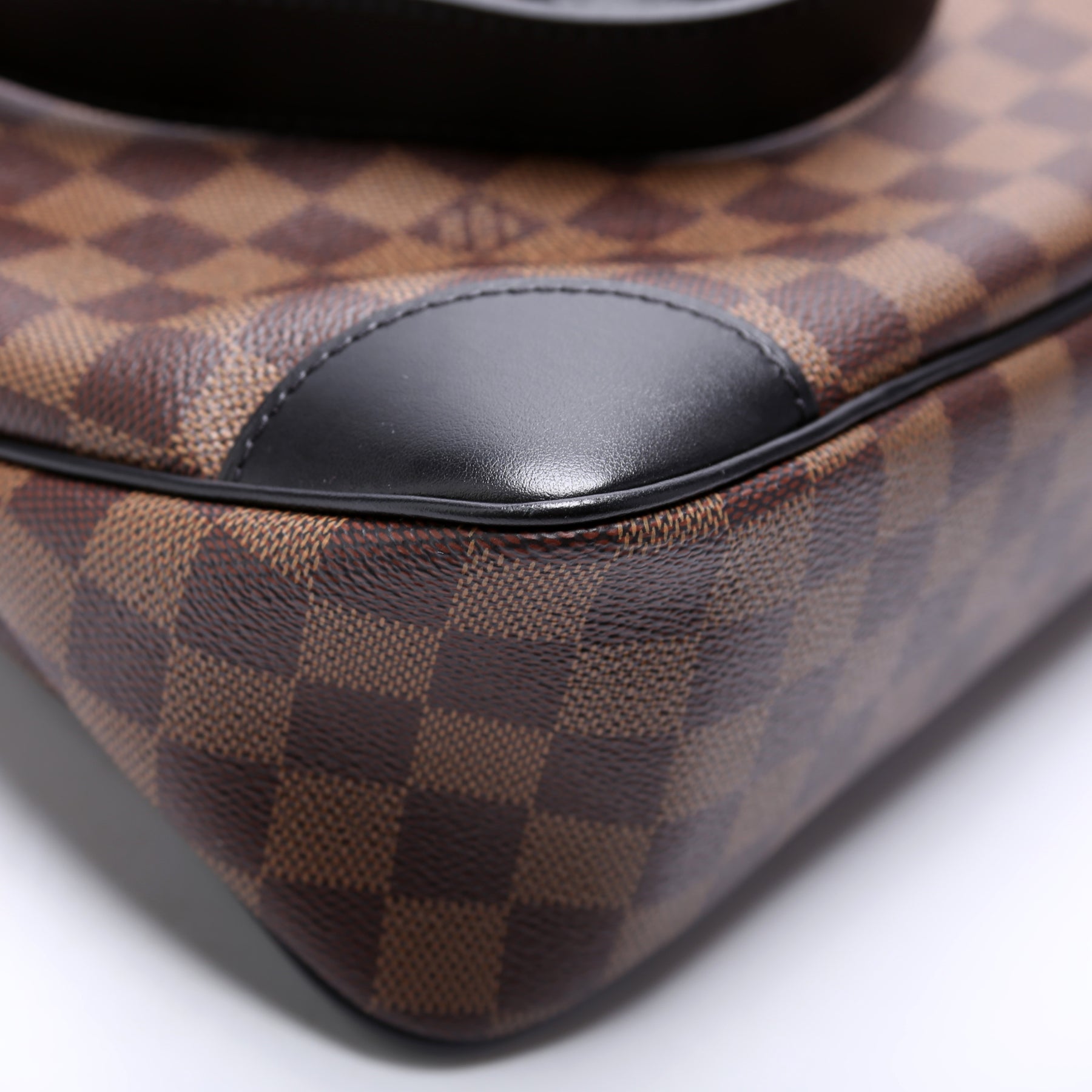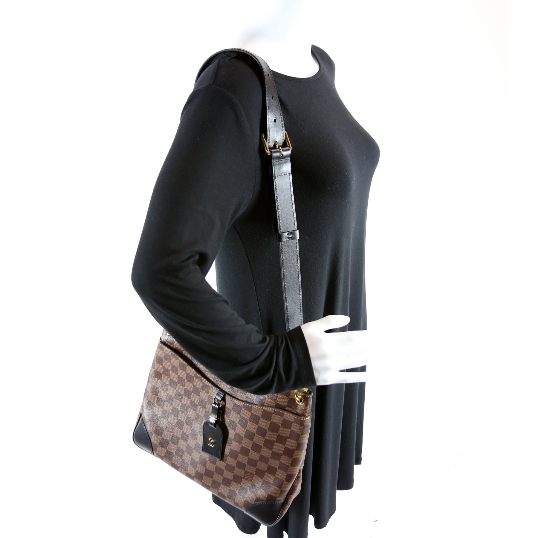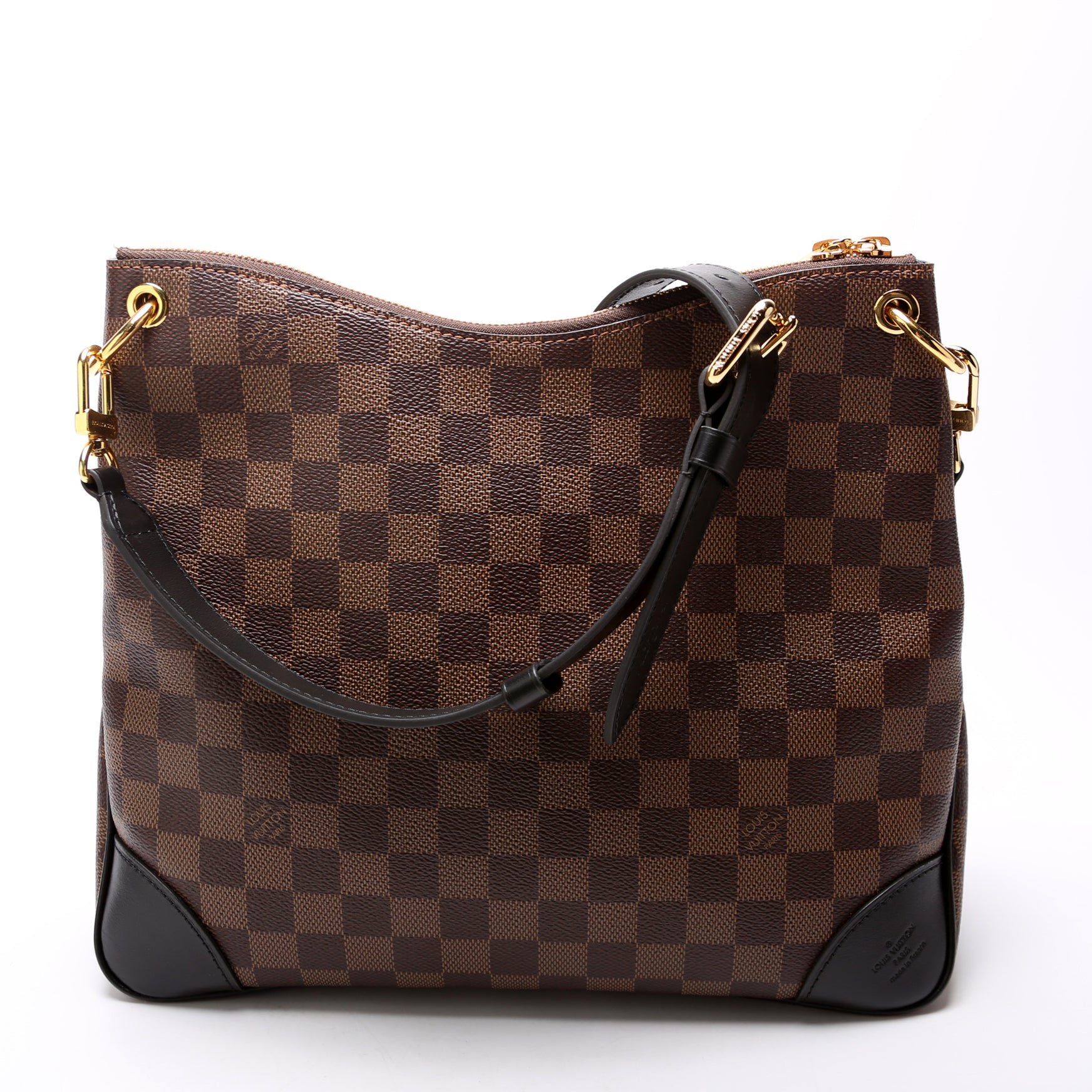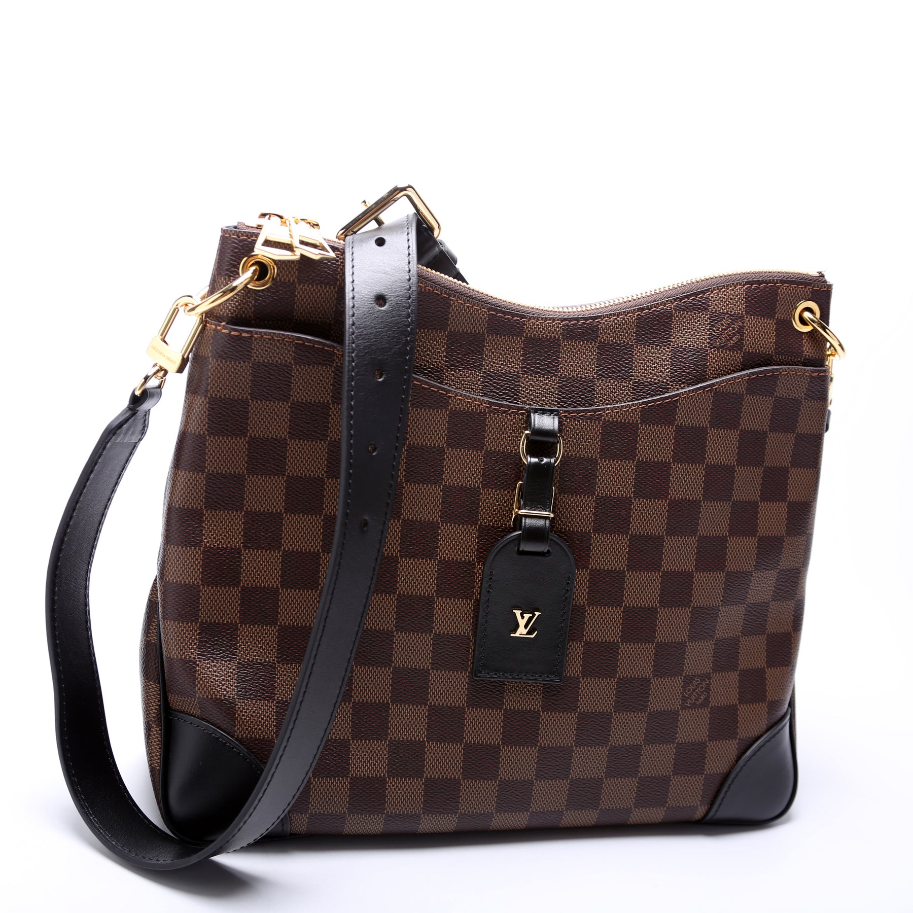 This pre-owned Louis Vuitton Odeon PM NM is guaranteed 100% authentic. The exterior is in the classic Louis Vuitton Damier Ebene coated canvas.