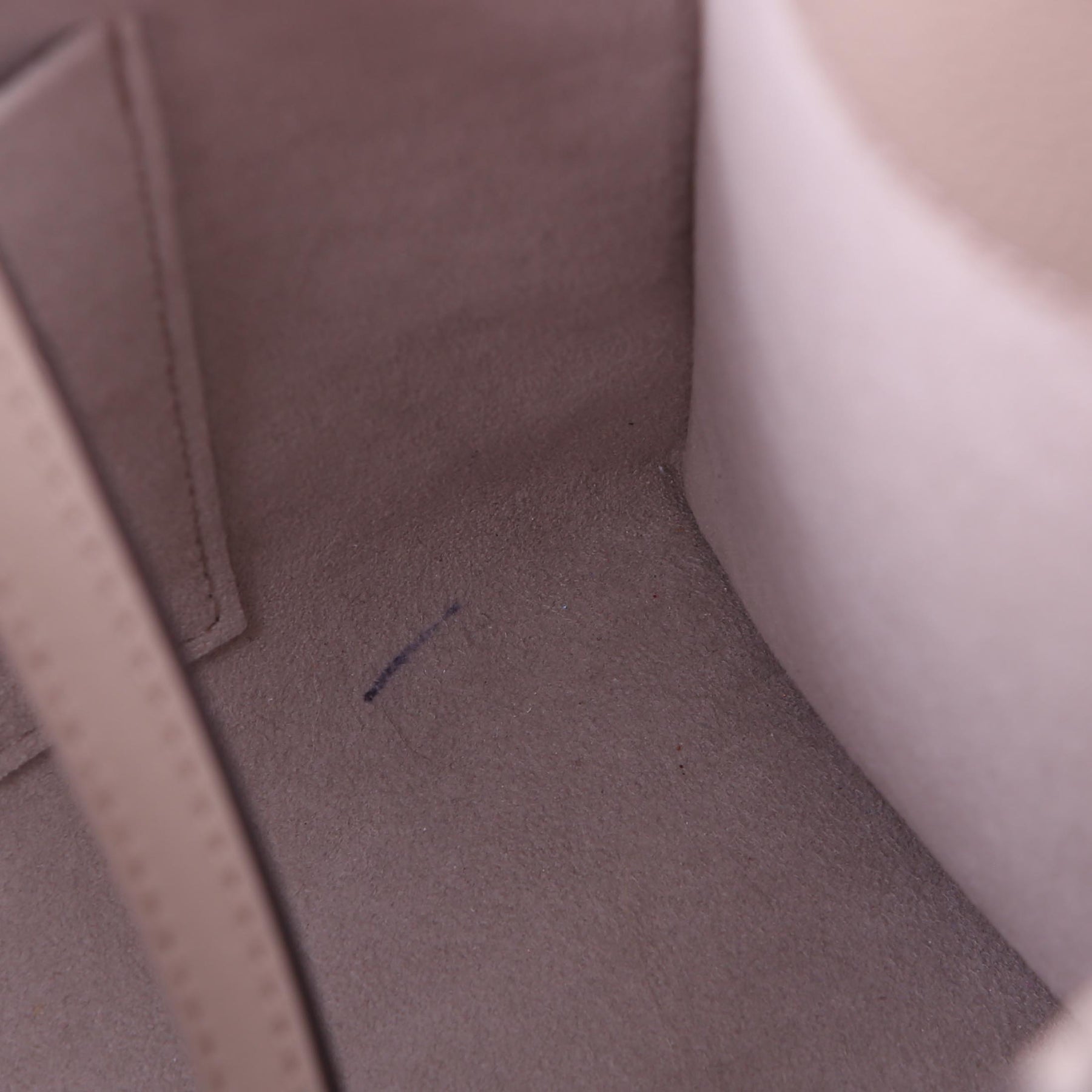 Interior: The interior features one zip closure pocket and two open pockets. There is a small pen mark to one corner of the interior.