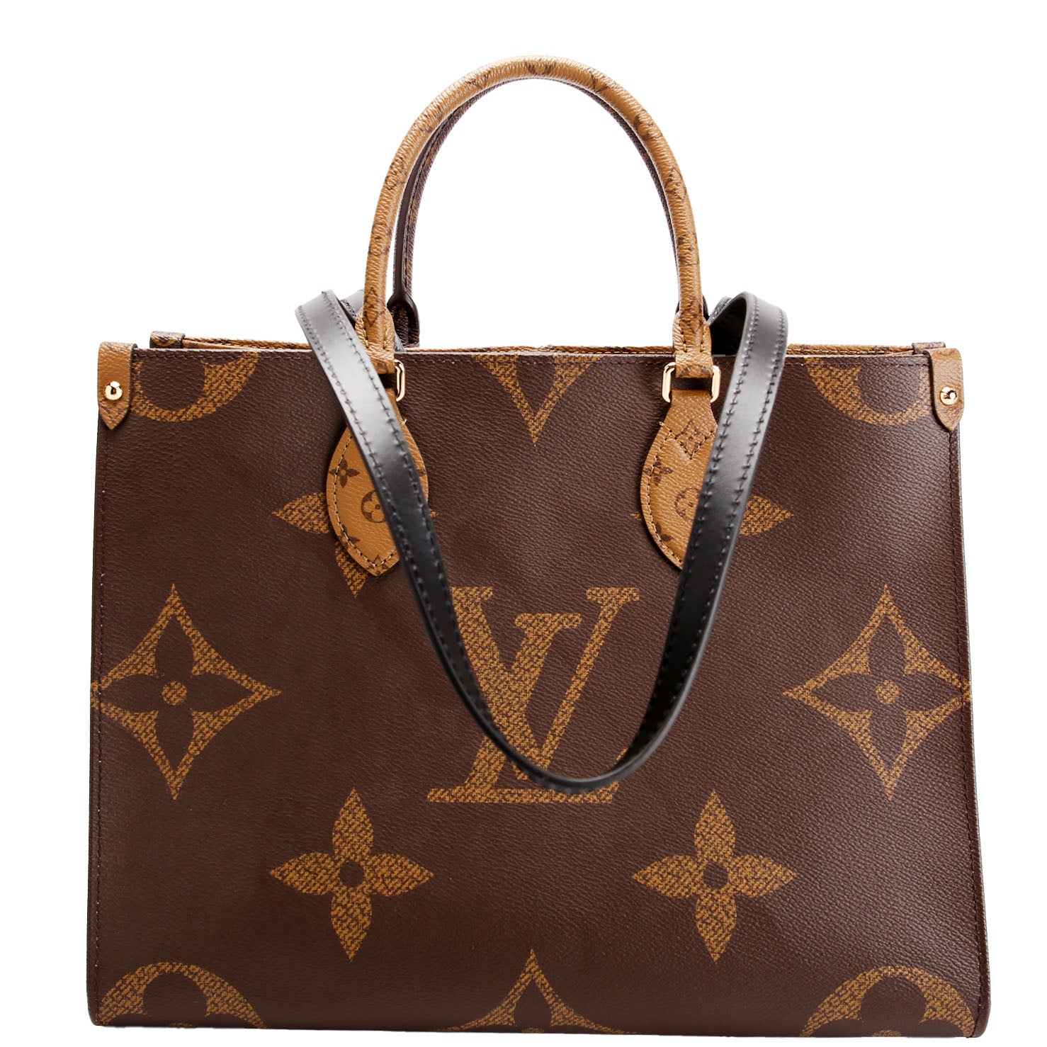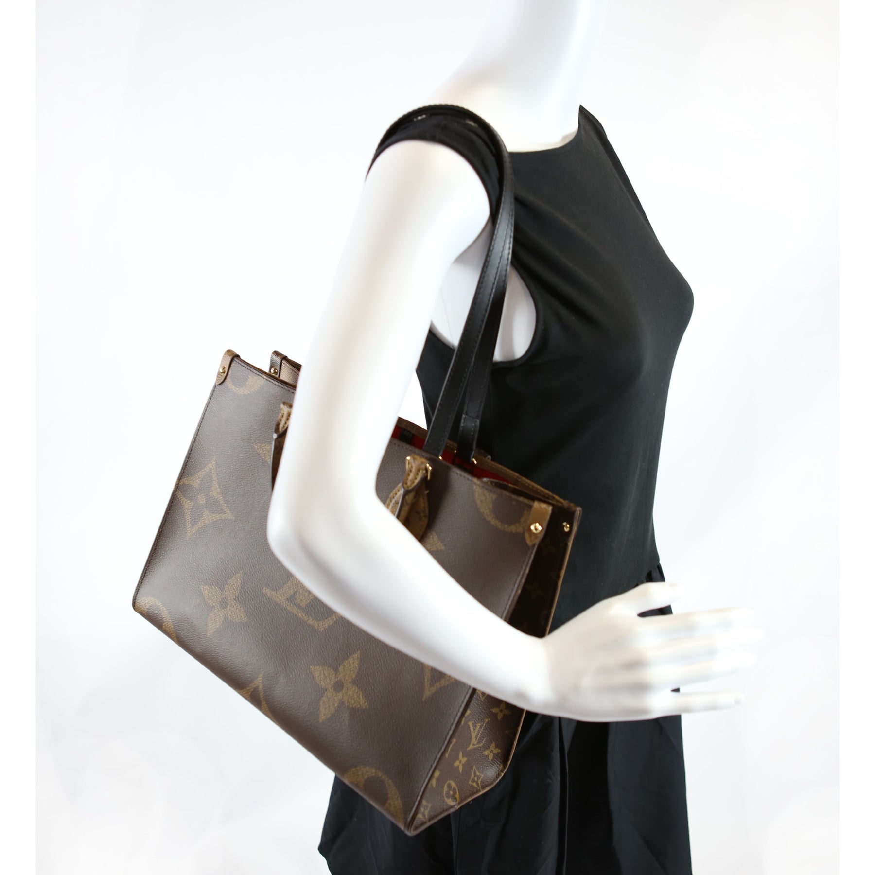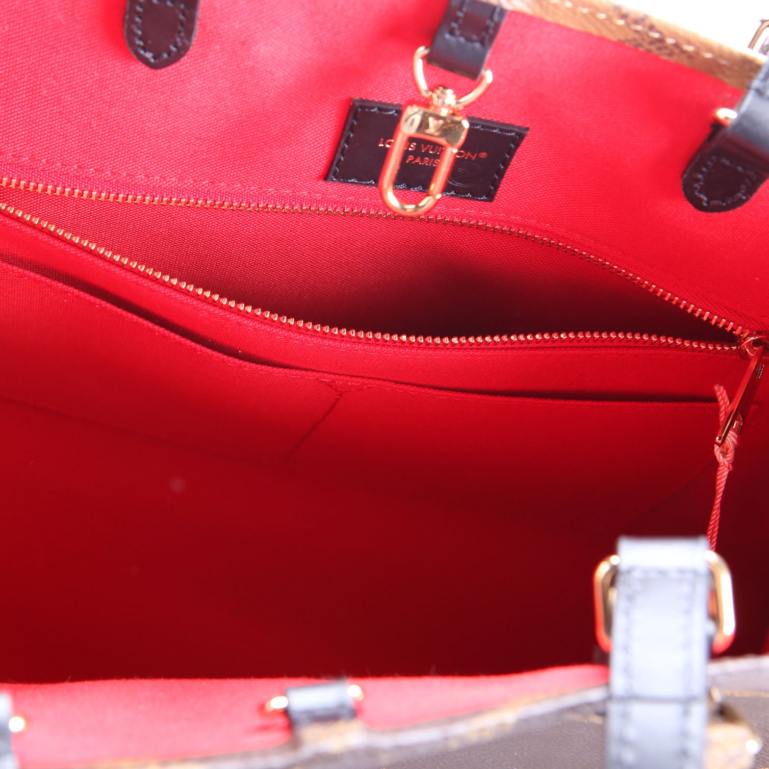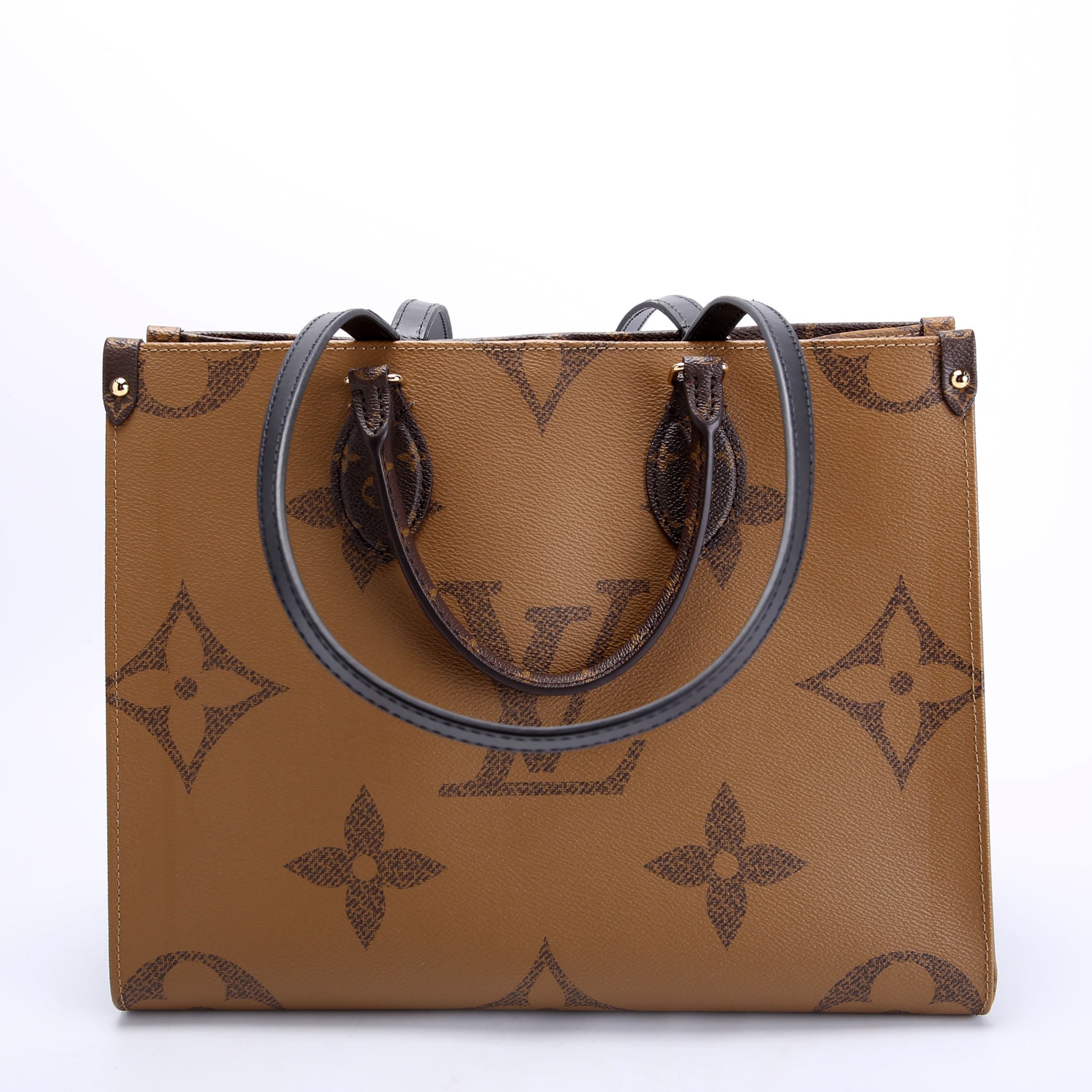 This pre-owned Louis Vuitton ONTHEGO MM is guaranteed 100% authentic. The exterior is in the classic Reversed Monogram coated canvas.