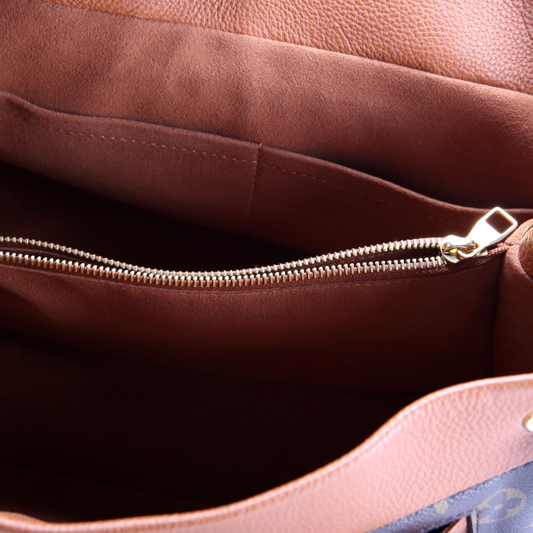 Interior: The interior suede is free from stains or rips. The interior features two open sections four small pockets, and one zip closure pocket.