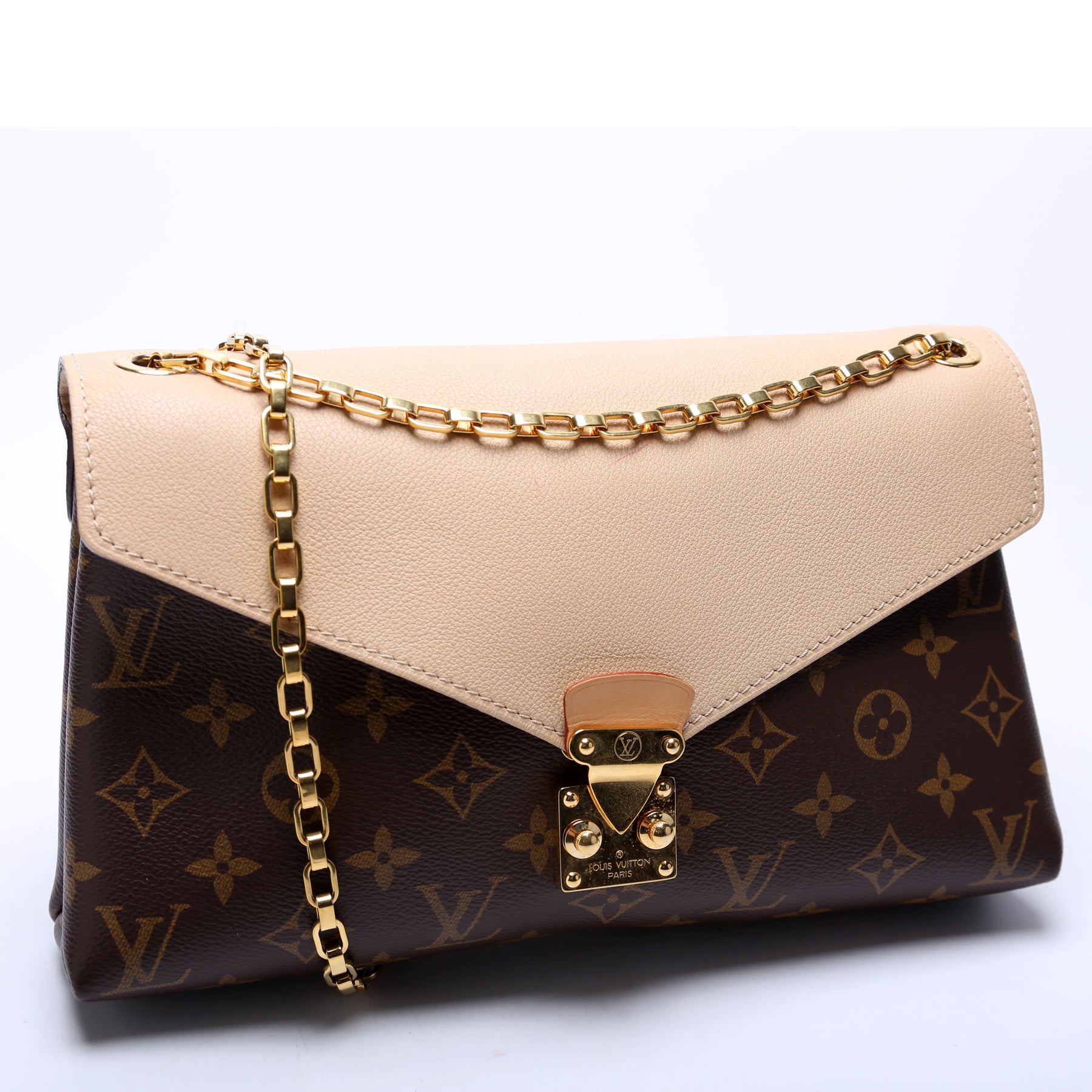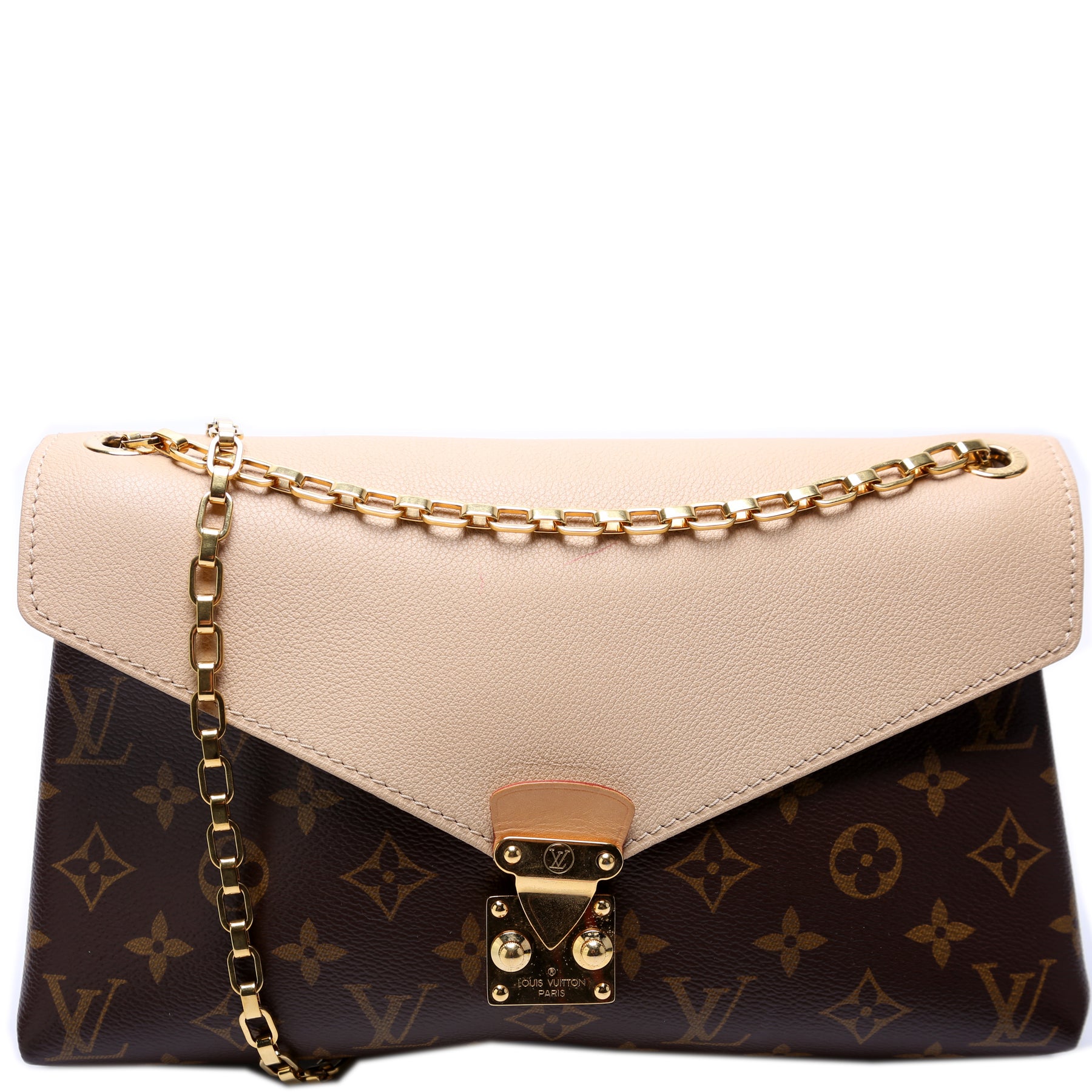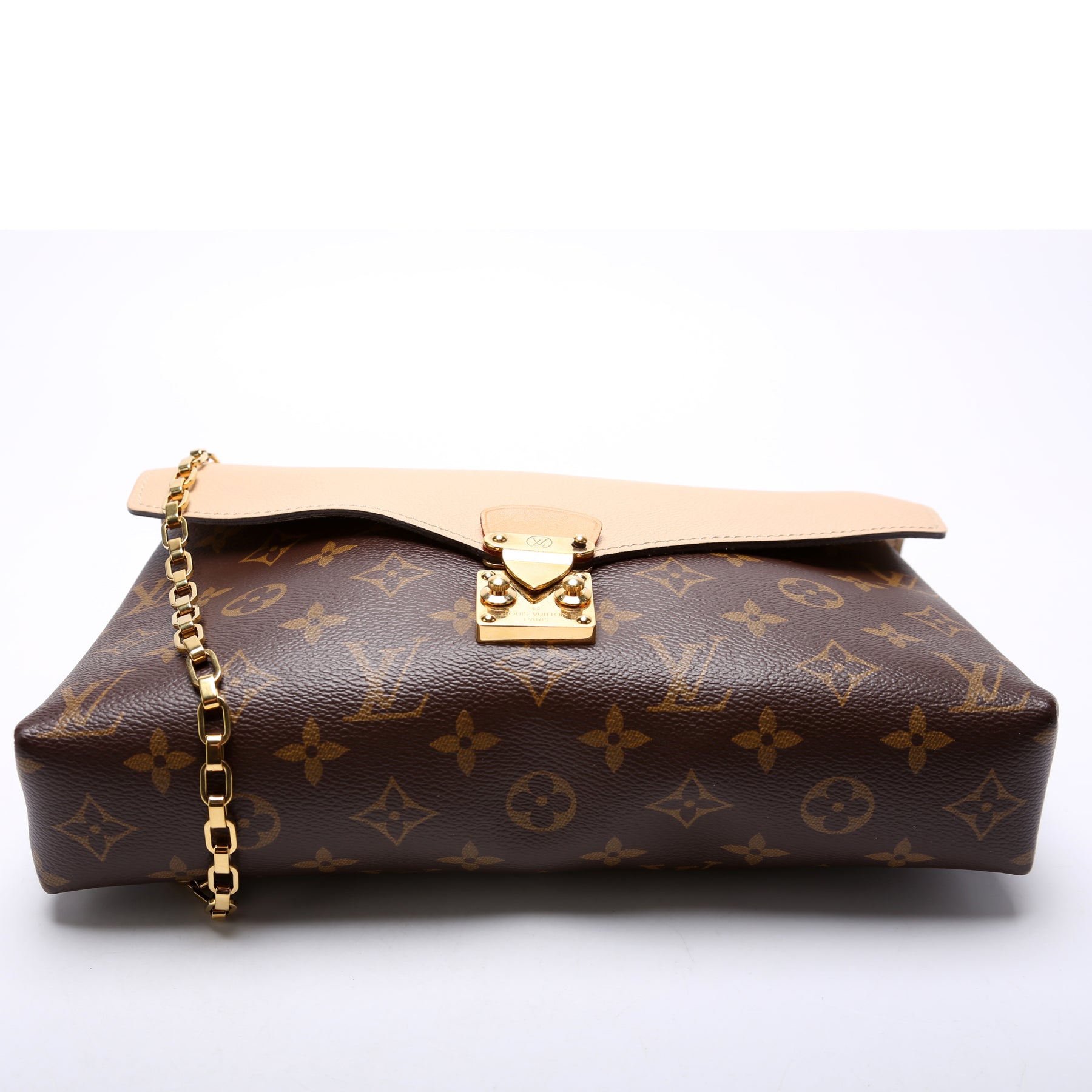 This pre-owned Louis Vuitton Pallas Chain is guaranteed 100% authentic. The exterior is in the classic Louis Vuitton Monogram coated canvas.