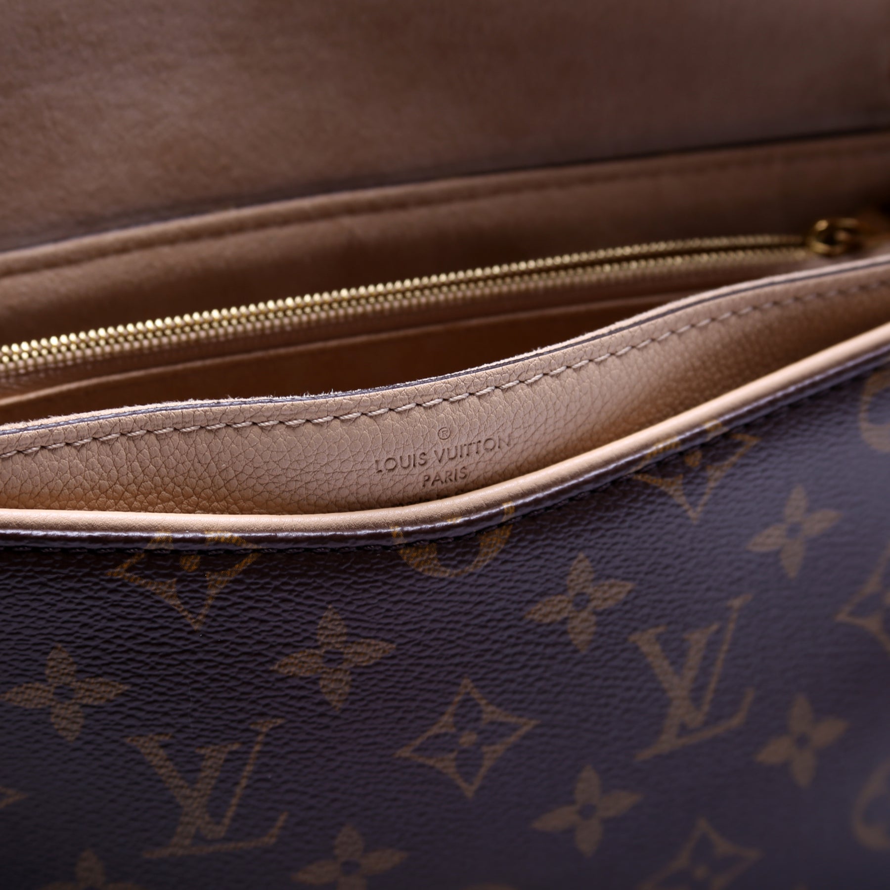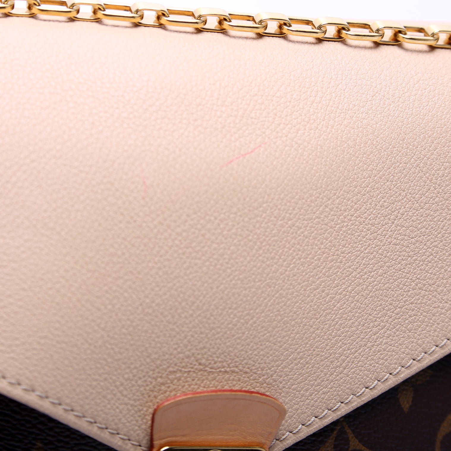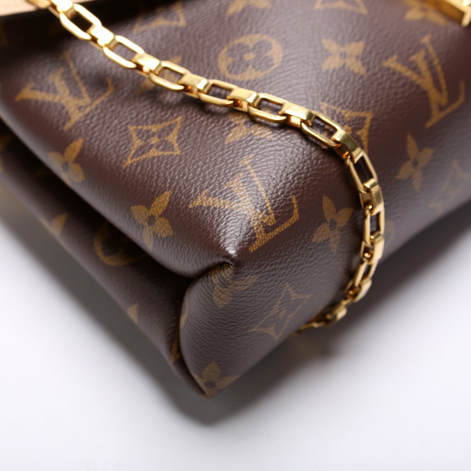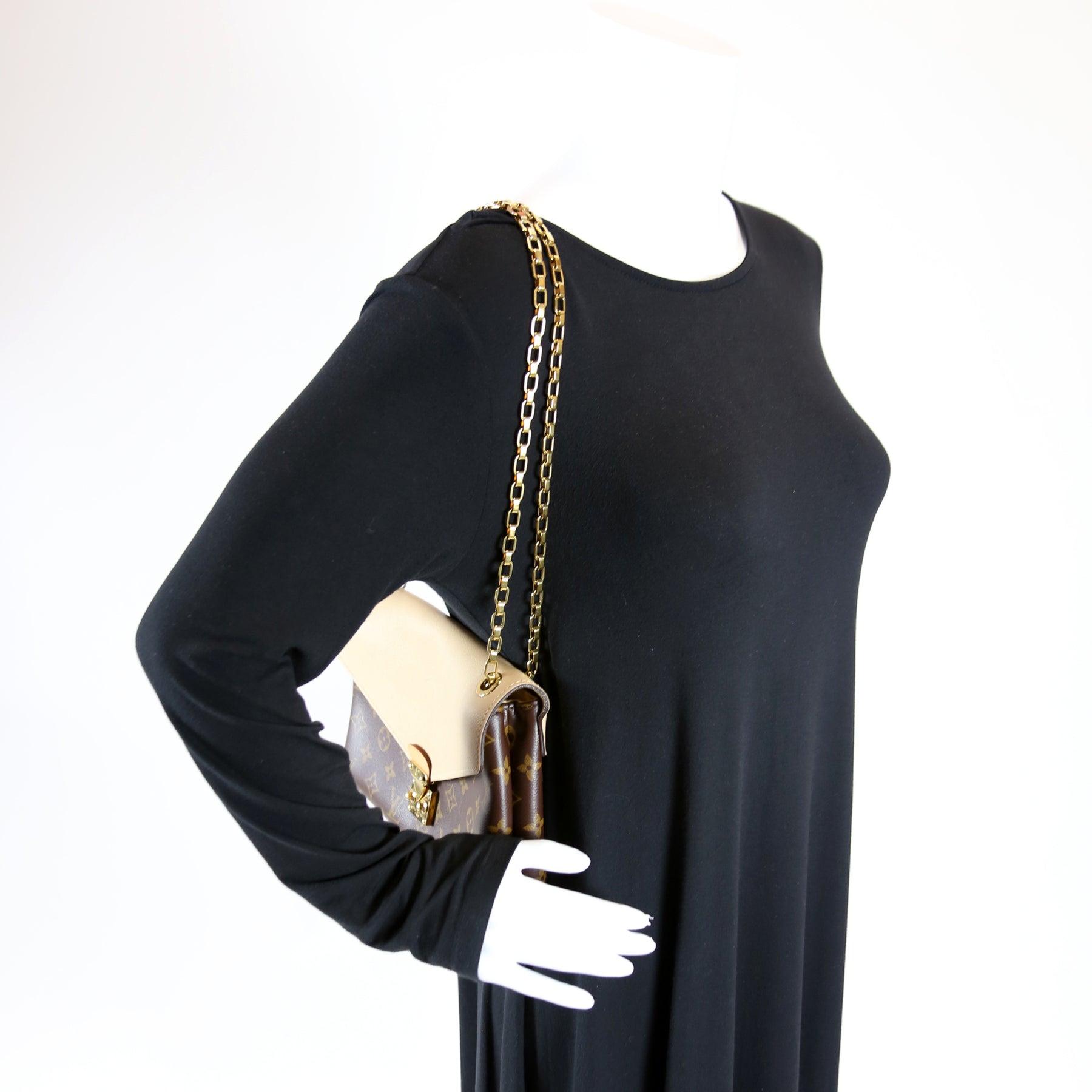This pre-owned Louis Vuitton Pallas Chain is guaranteed 100% authentic. The exterior is in the classic Louis Vuitton Monogram coated canvas.