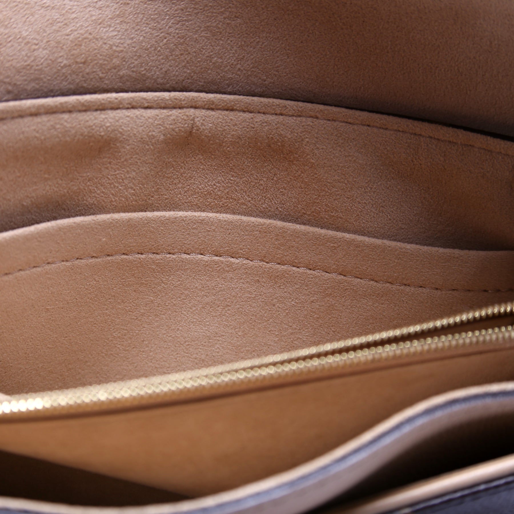 Exterior: The exterior coated canvas is free from wear. The beige leather has minor pen marks.