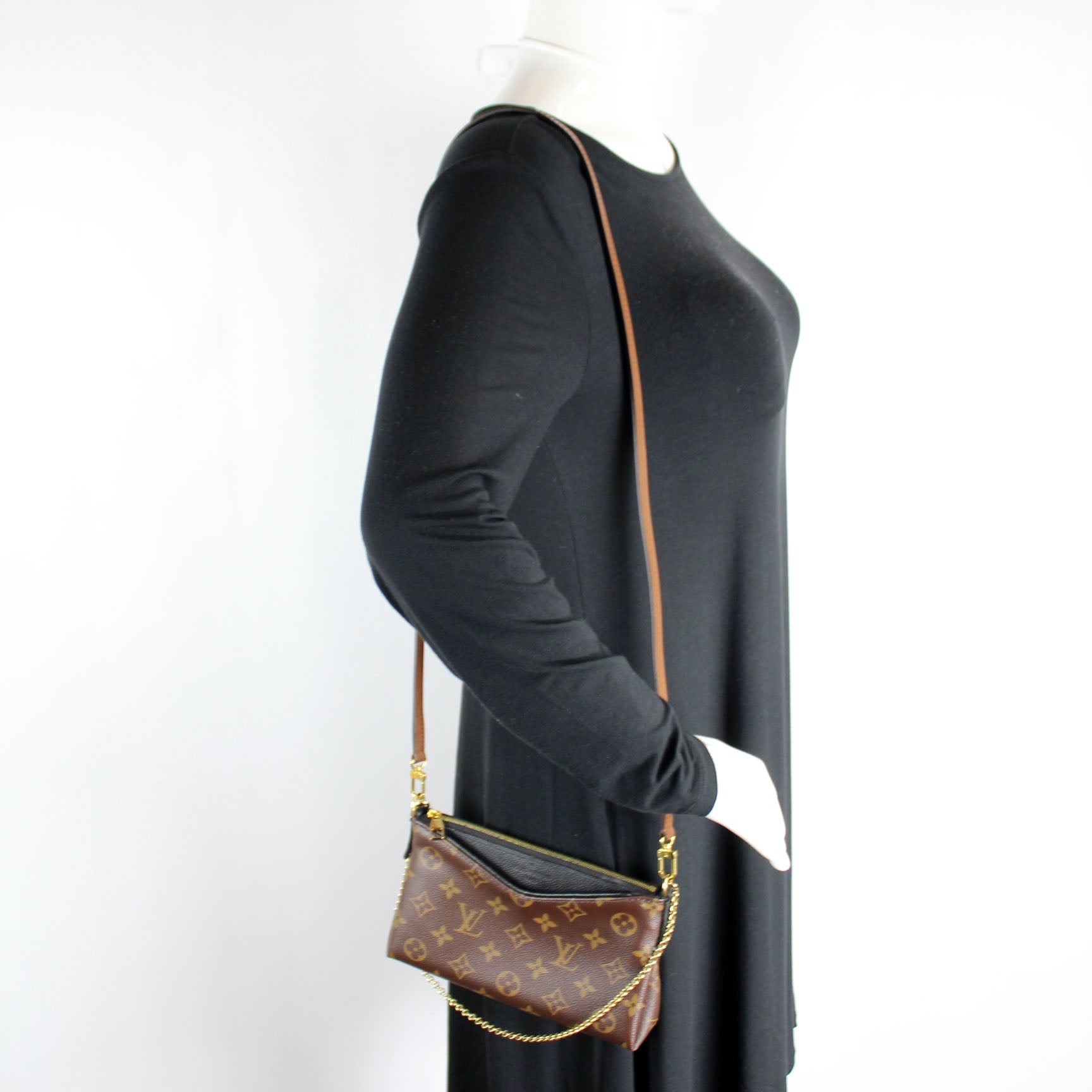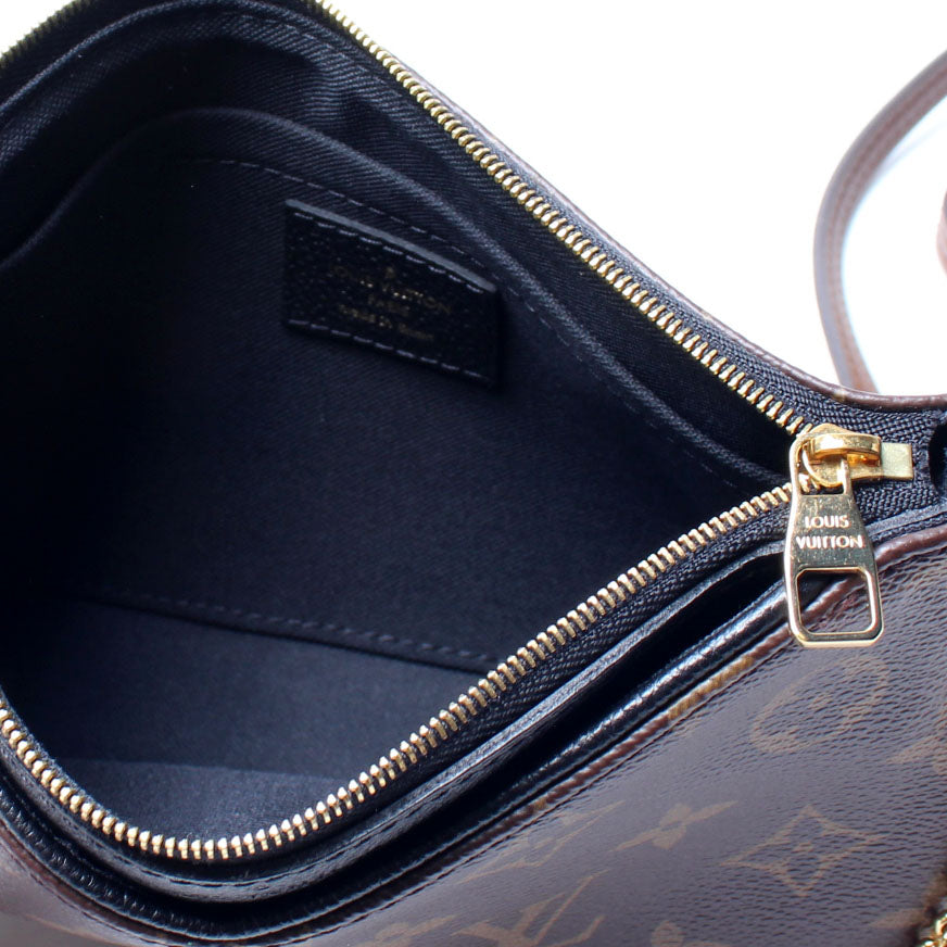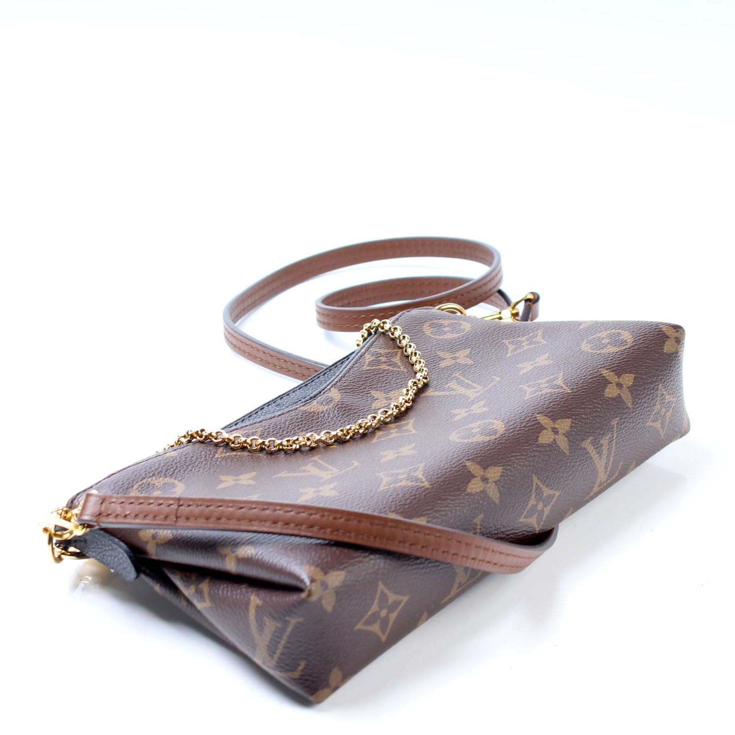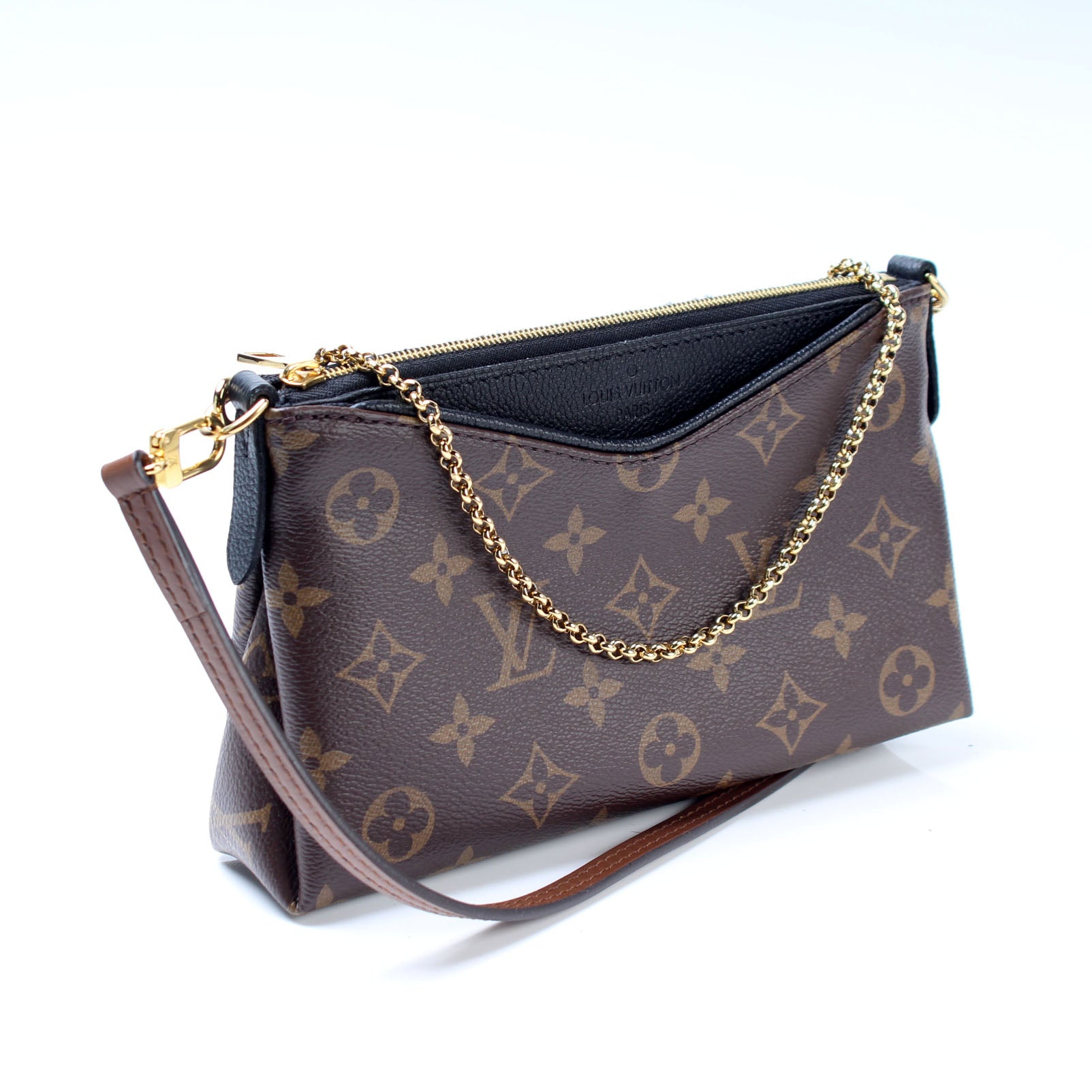This pre-owned Louis Vuitton Pallas Clutch is guaranteed 100% authentic. The exterior is in the classic Louis Vuitton Monogram coated canvas.