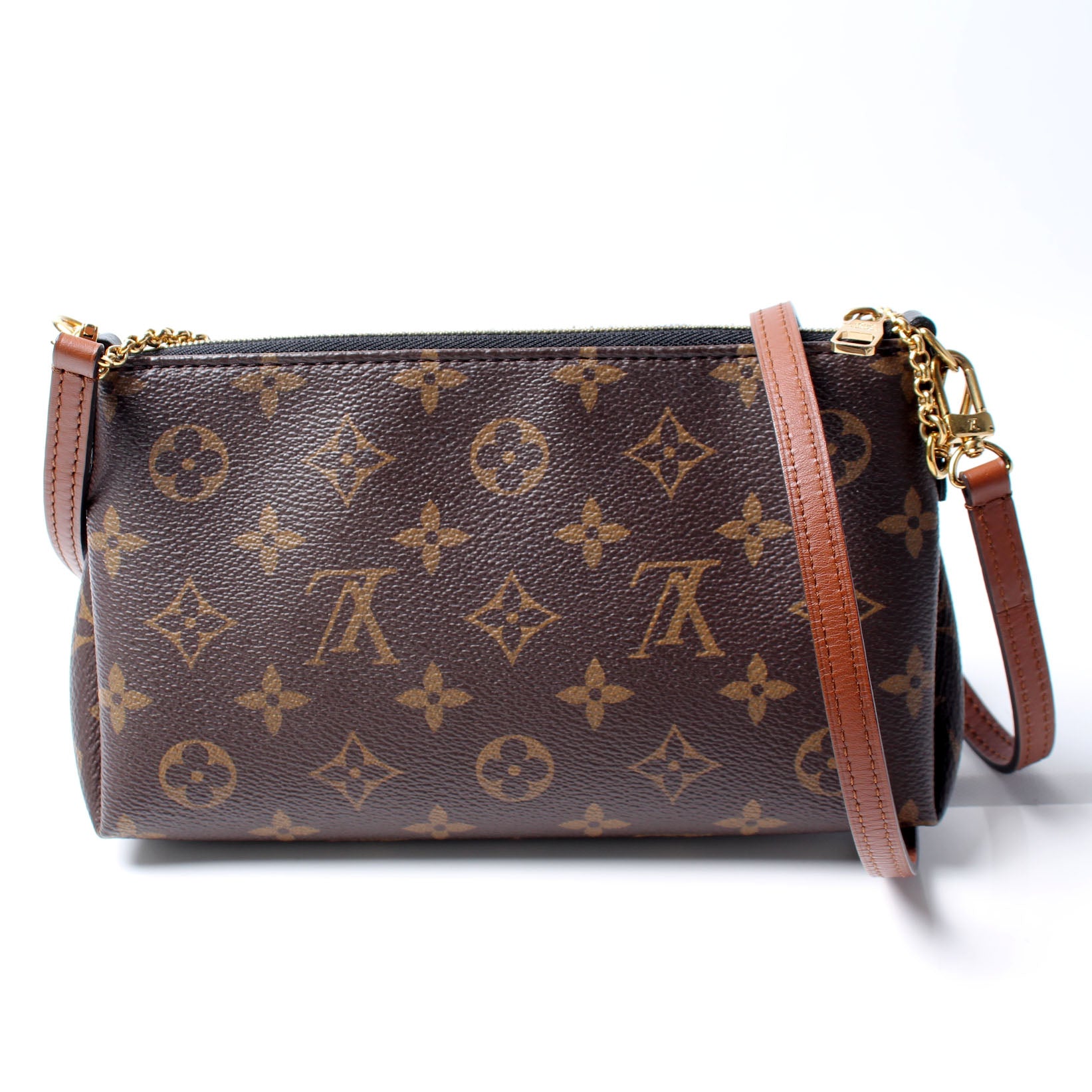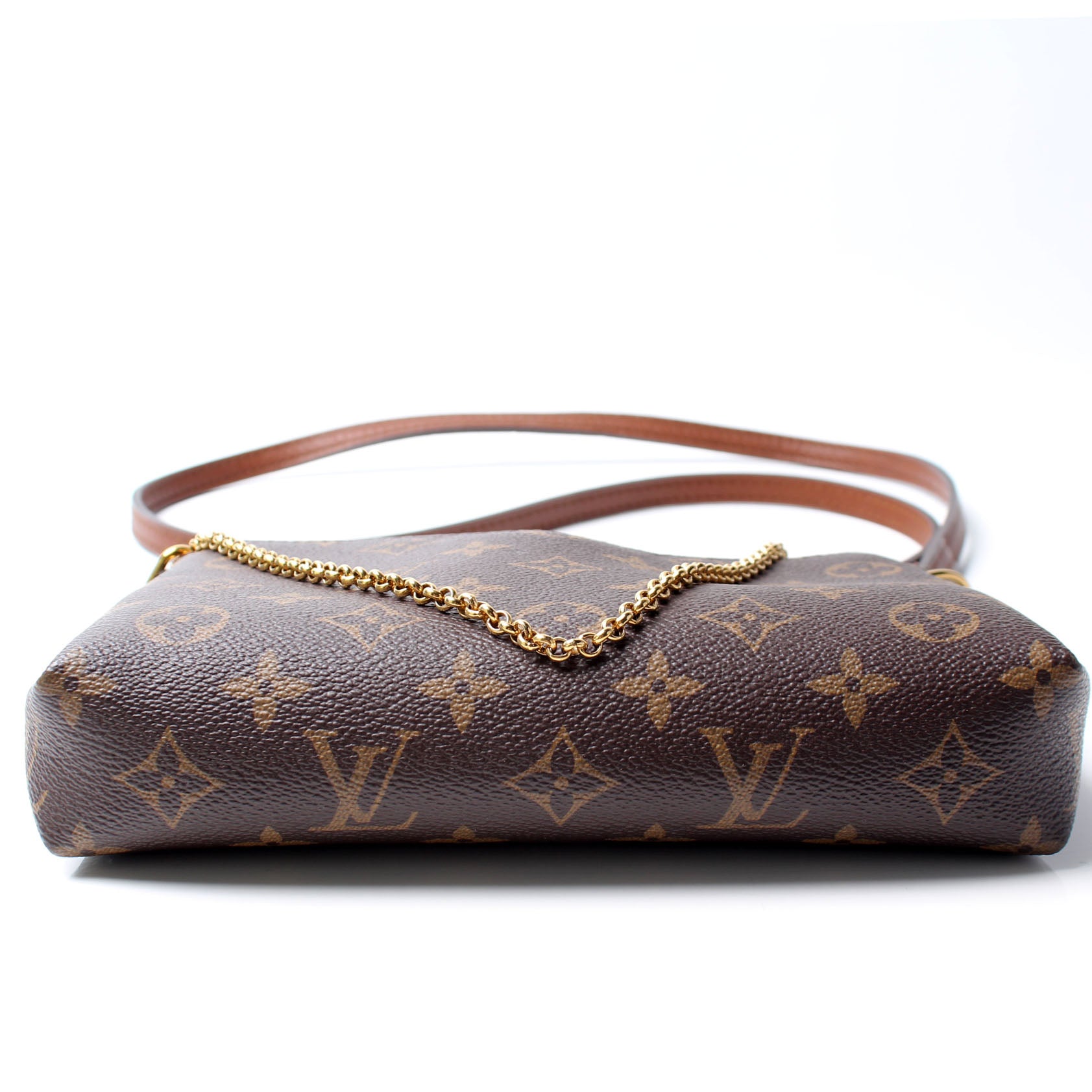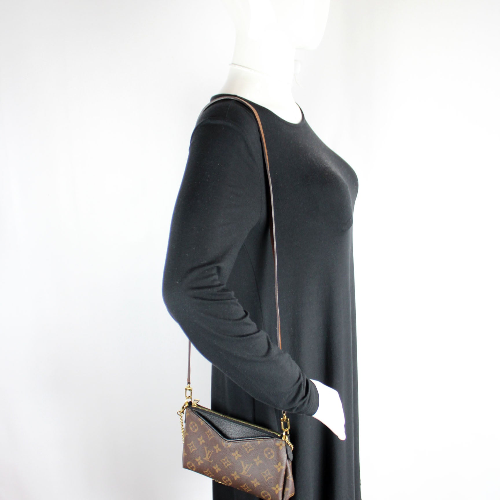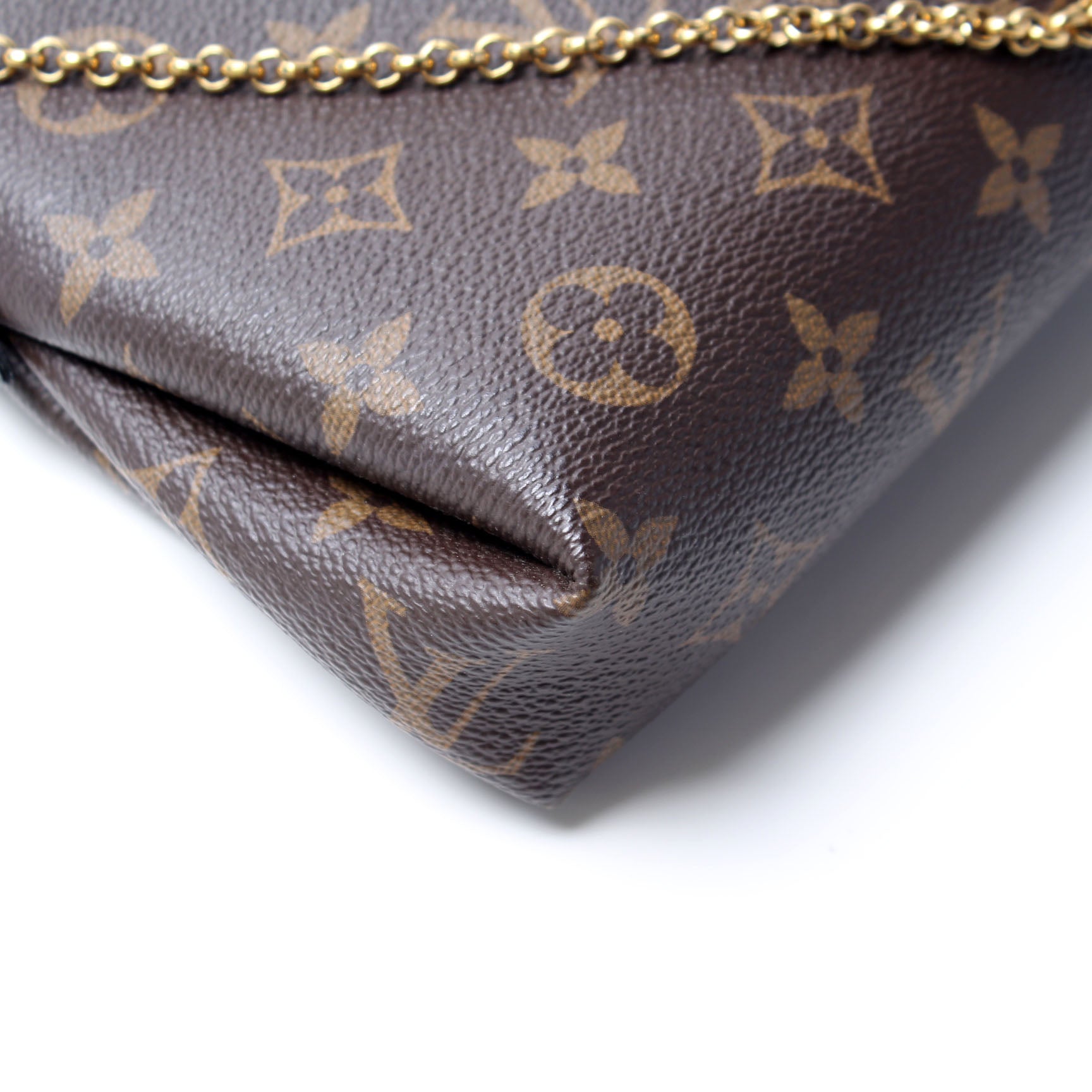 This pre-owned Louis Vuitton Pallas Clutch is guaranteed 100% authentic. The exterior is in the classic Louis Vuitton Monogram coated canvas.