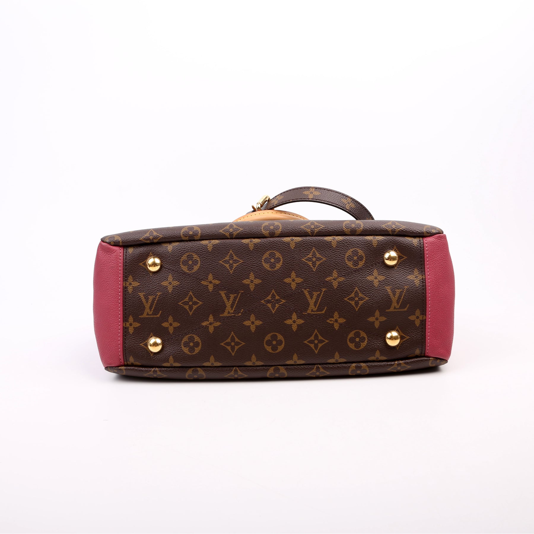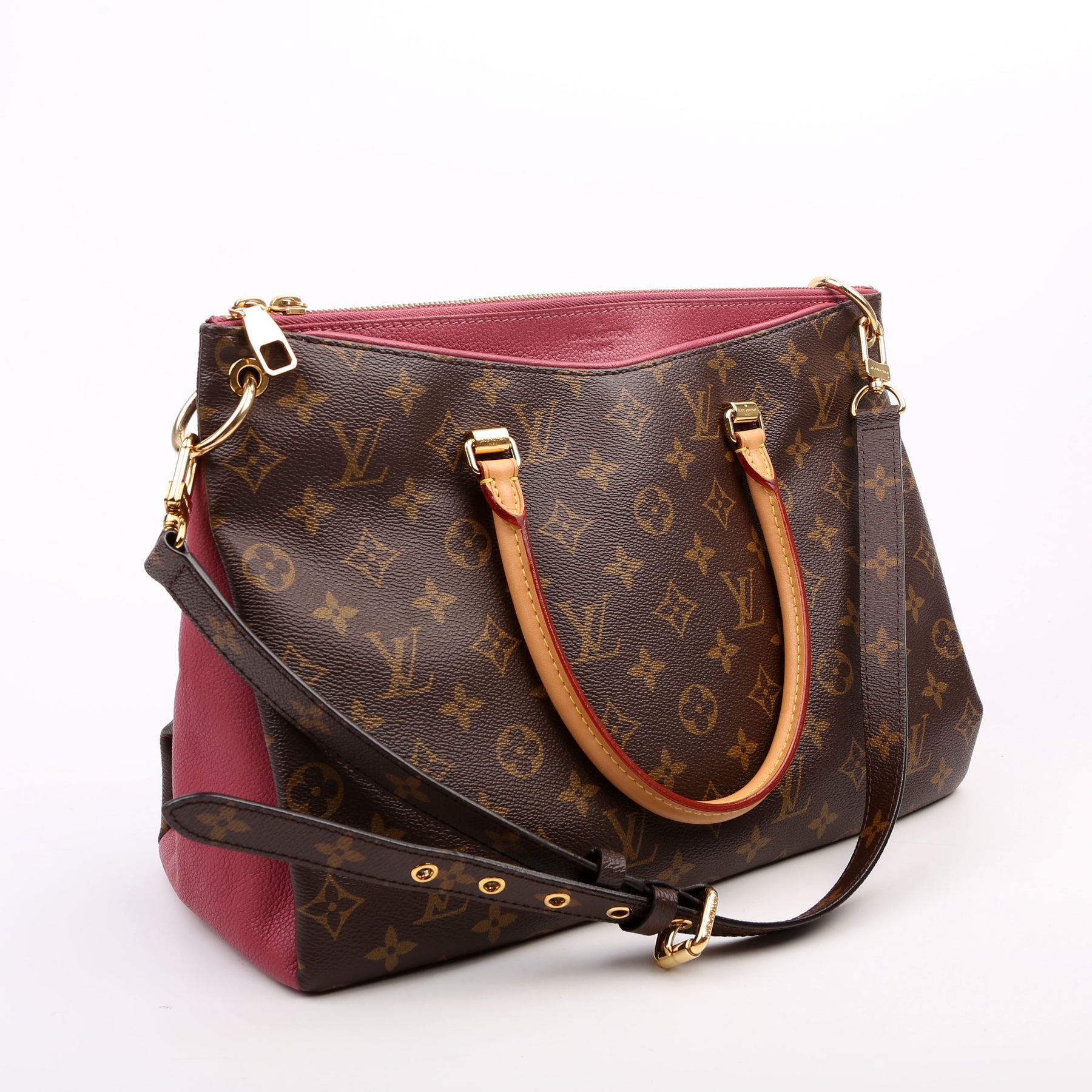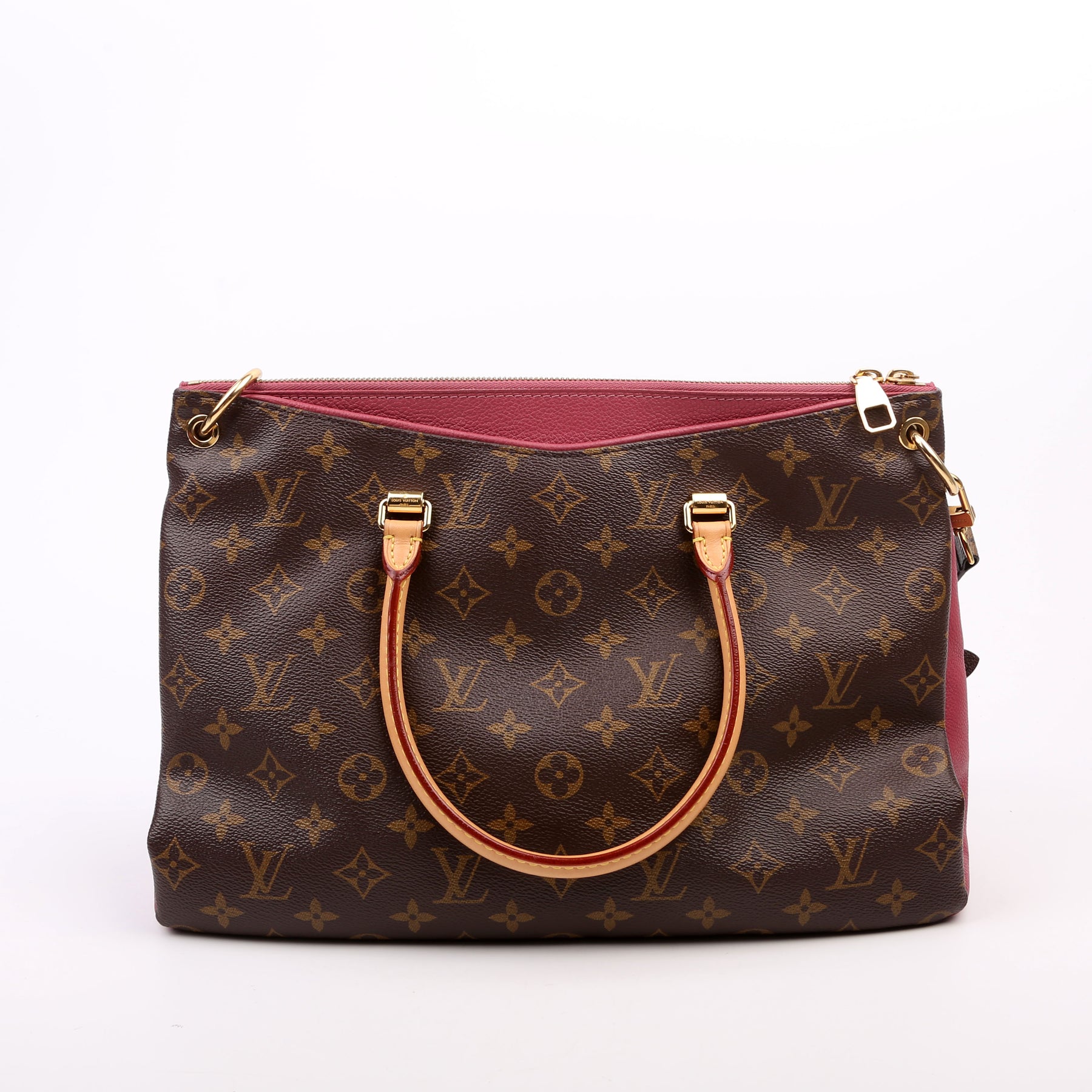 This pre-owned Louis Vuitton Pallas Tote Leather Side is guaranteed 100% authentic. The exterior is in the classic Louis Vuitton Monogram coated canvas..