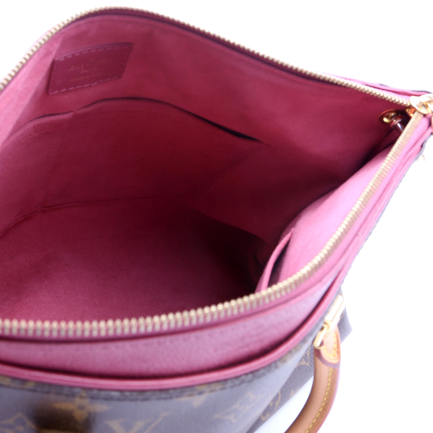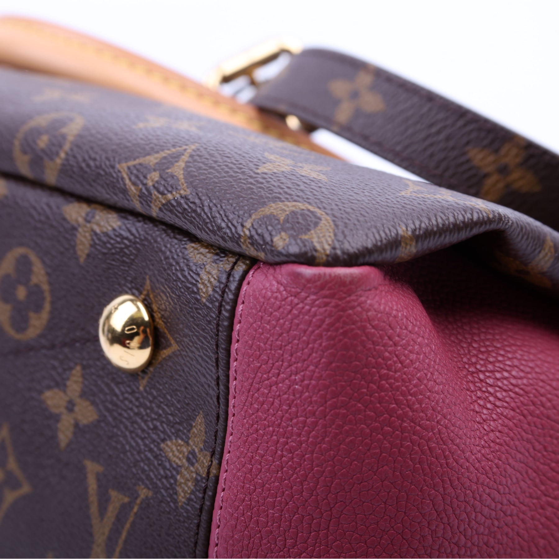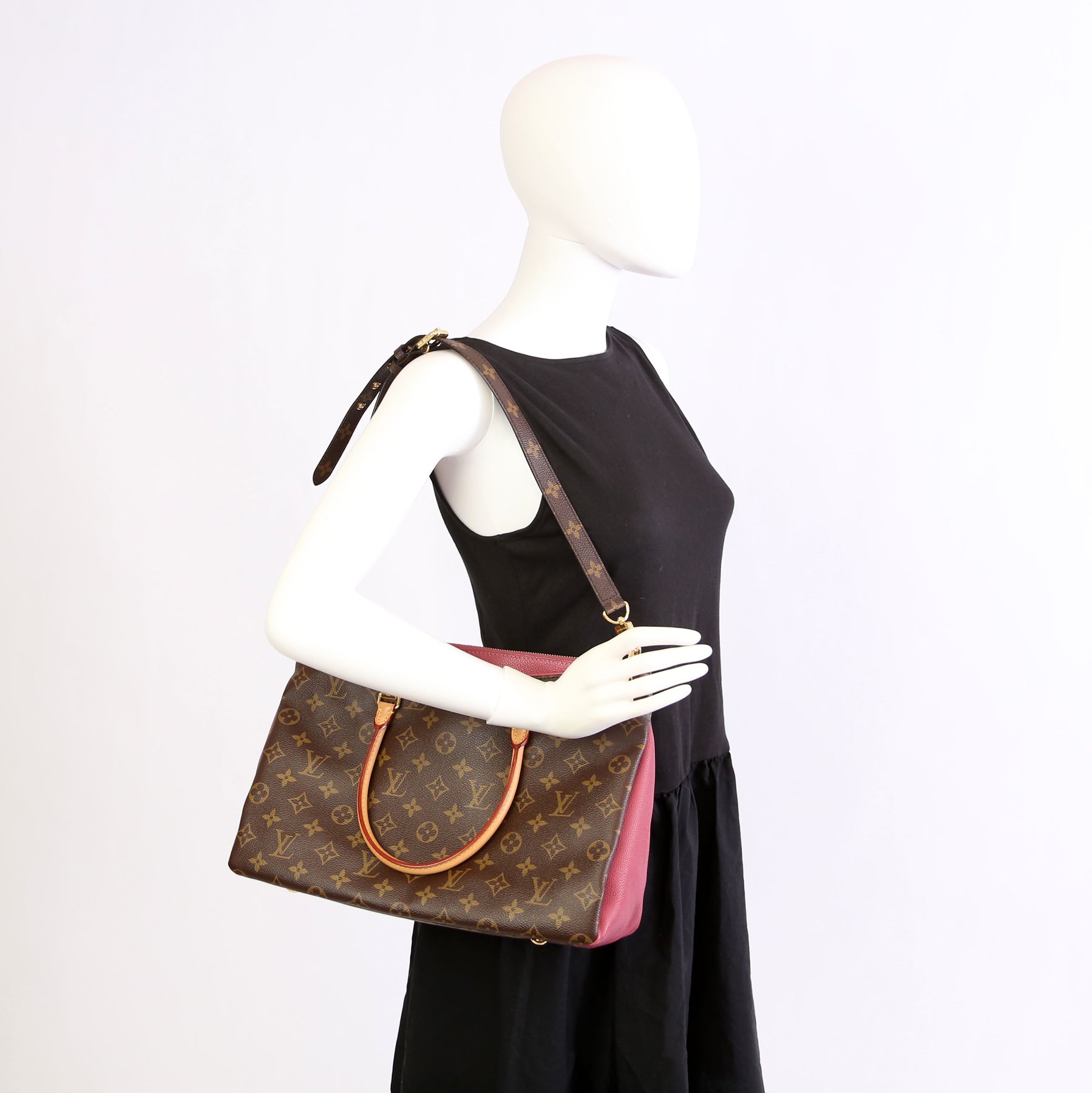 This pre-owned Louis Vuitton Pallas Tote Leather Side is guaranteed 100% authentic. The exterior is in the classic Louis Vuitton Monogram coated canvas..