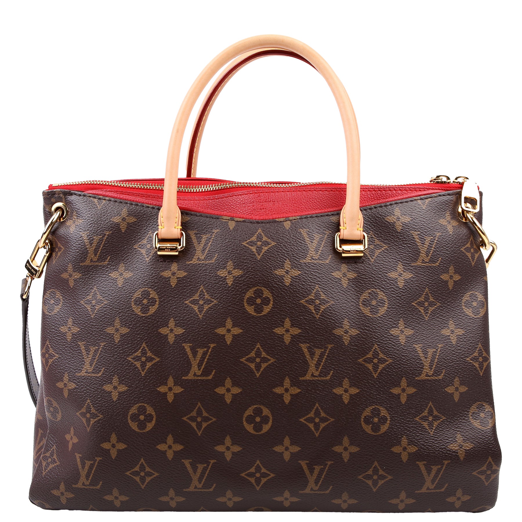 This pre-owned Louis Vuitton Pallas Tote Leather Side is guaranteed 100% authentic. The exterior is in the classic Louis Vuitton Monogram coated canvas.