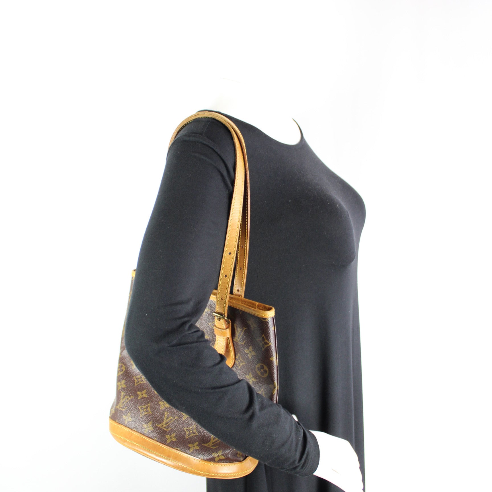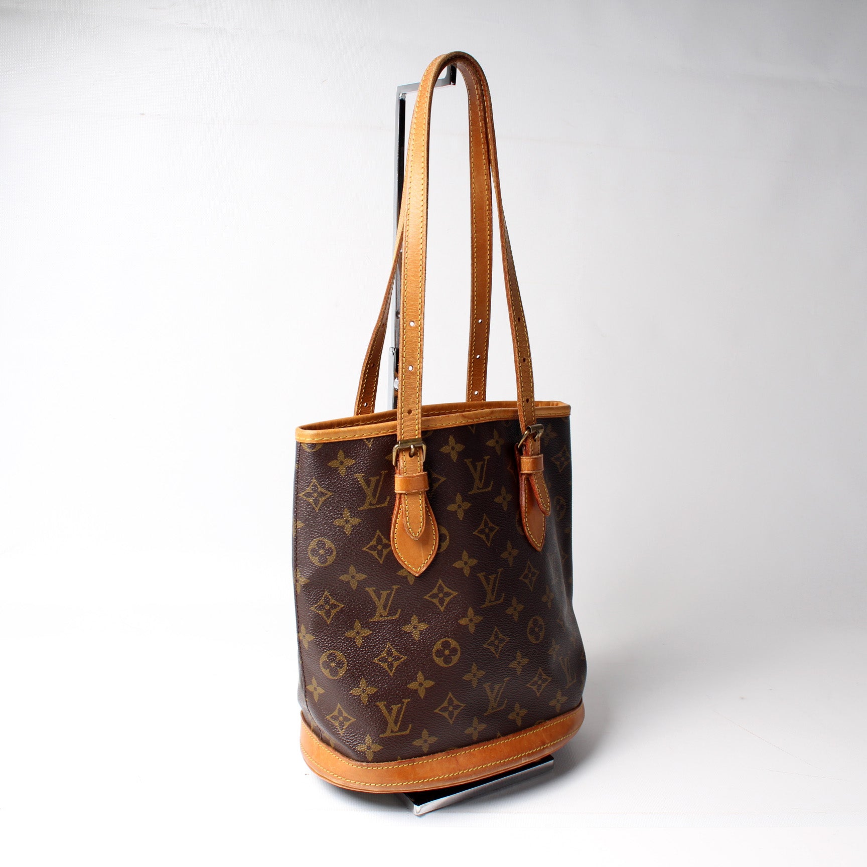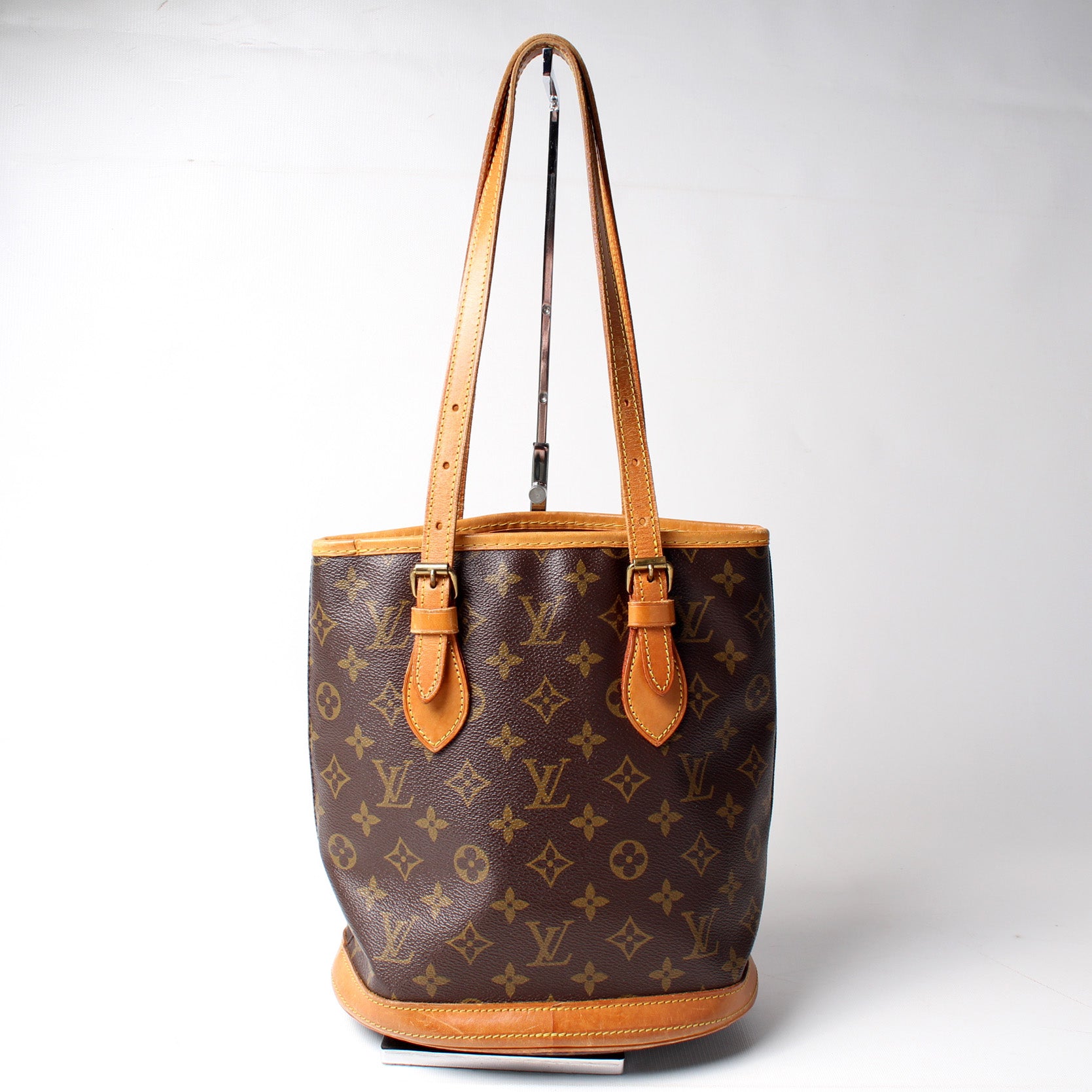 This pre-owned Louis Vuitton Petit Bucket is guaranteed 100% authentic. The exterior is in the classic Louis Vuitton Monogram coated canvas.