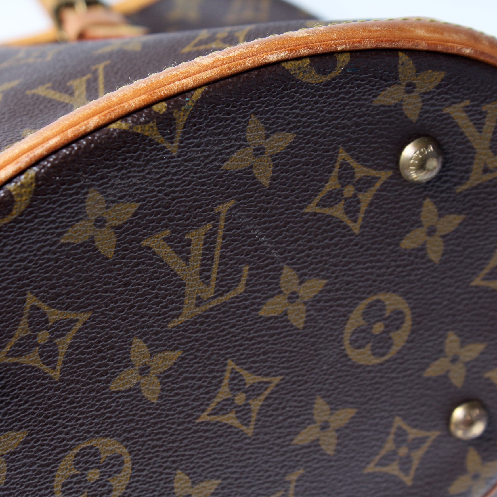 Exterior: The exterior coated canvas is free of any rips or cracks. The coated canvas has discoloration due to sun exposure. The leather trim has major discoloration and scuffs throughout. The pipping has wear.