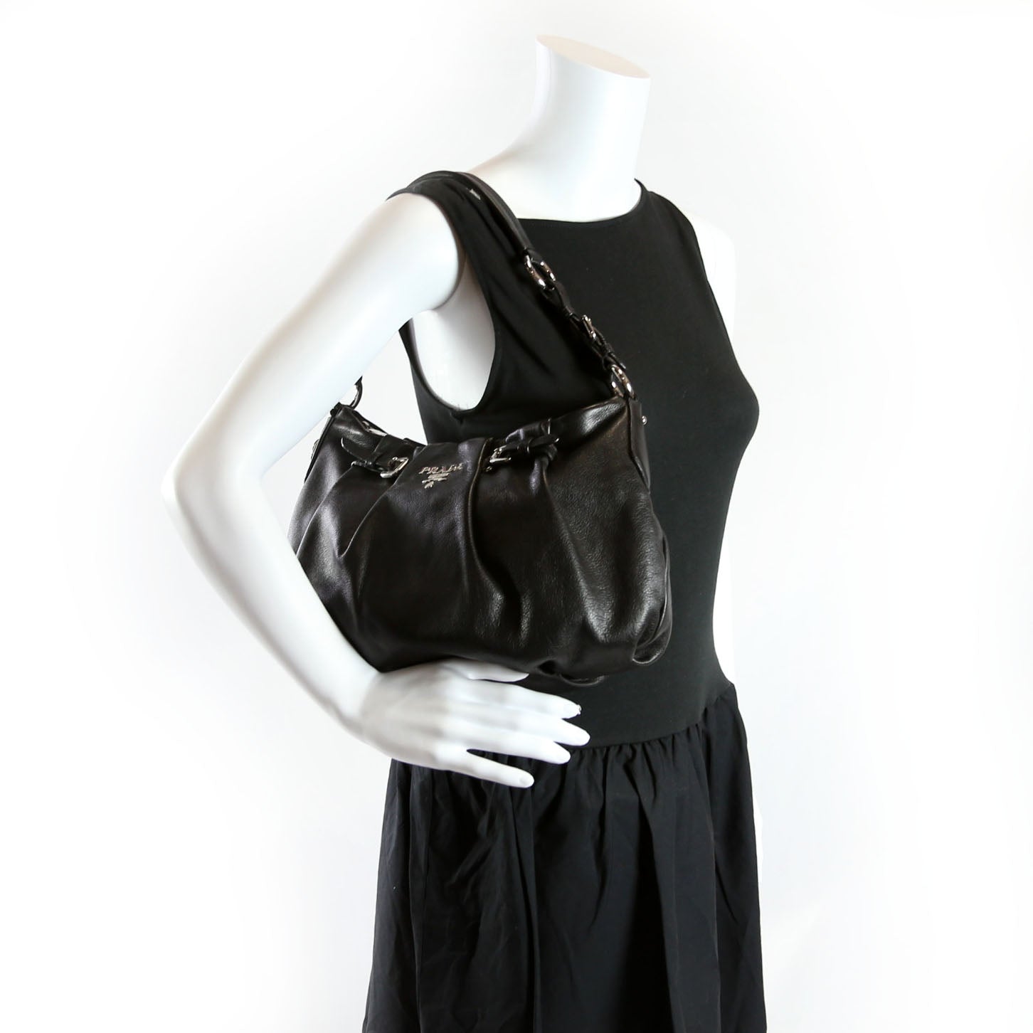 This pre-owned Prada Pleated Soft Calfskin Hobo is guaranteed 100% authentic. The exterior is in the classic Prada Calfskin leather.