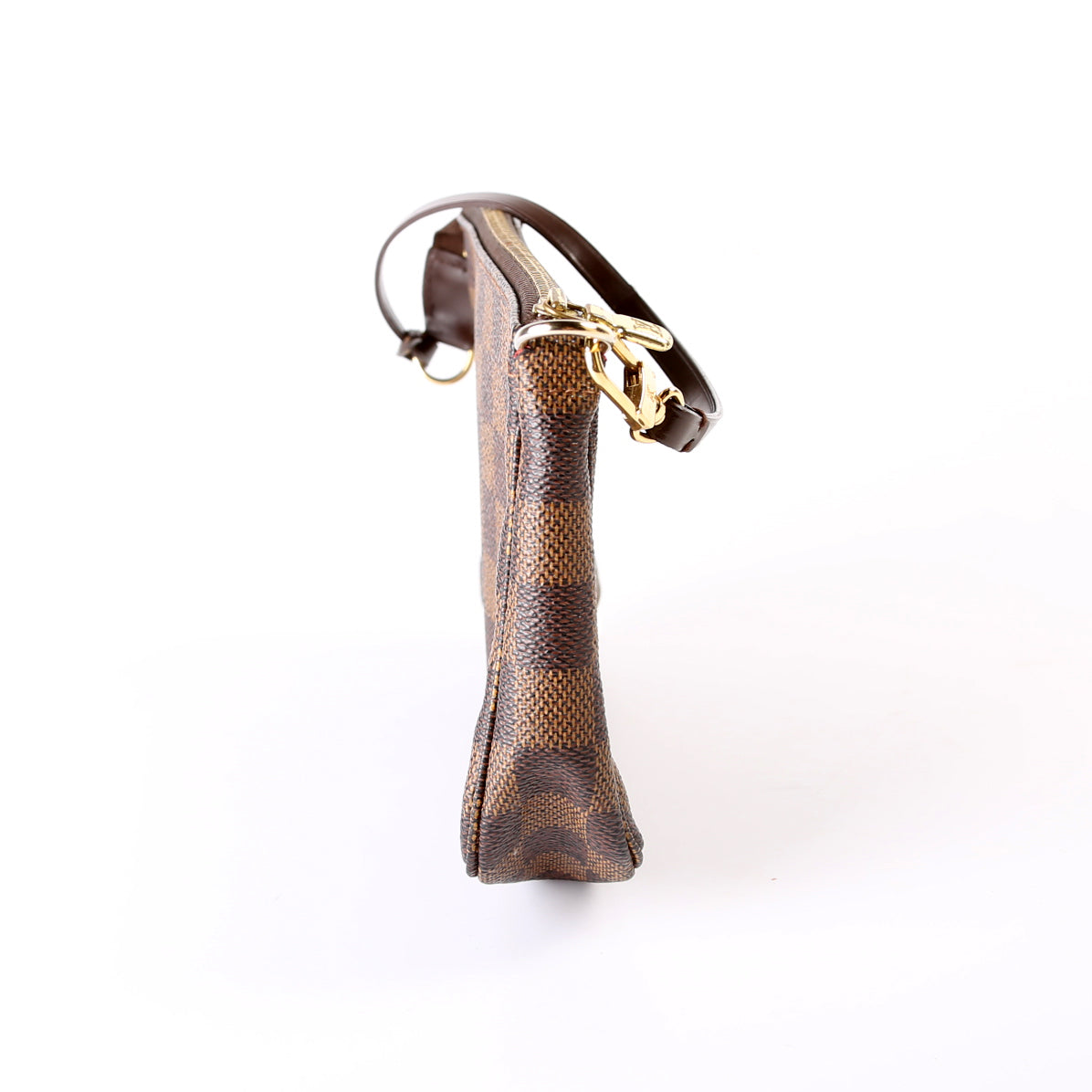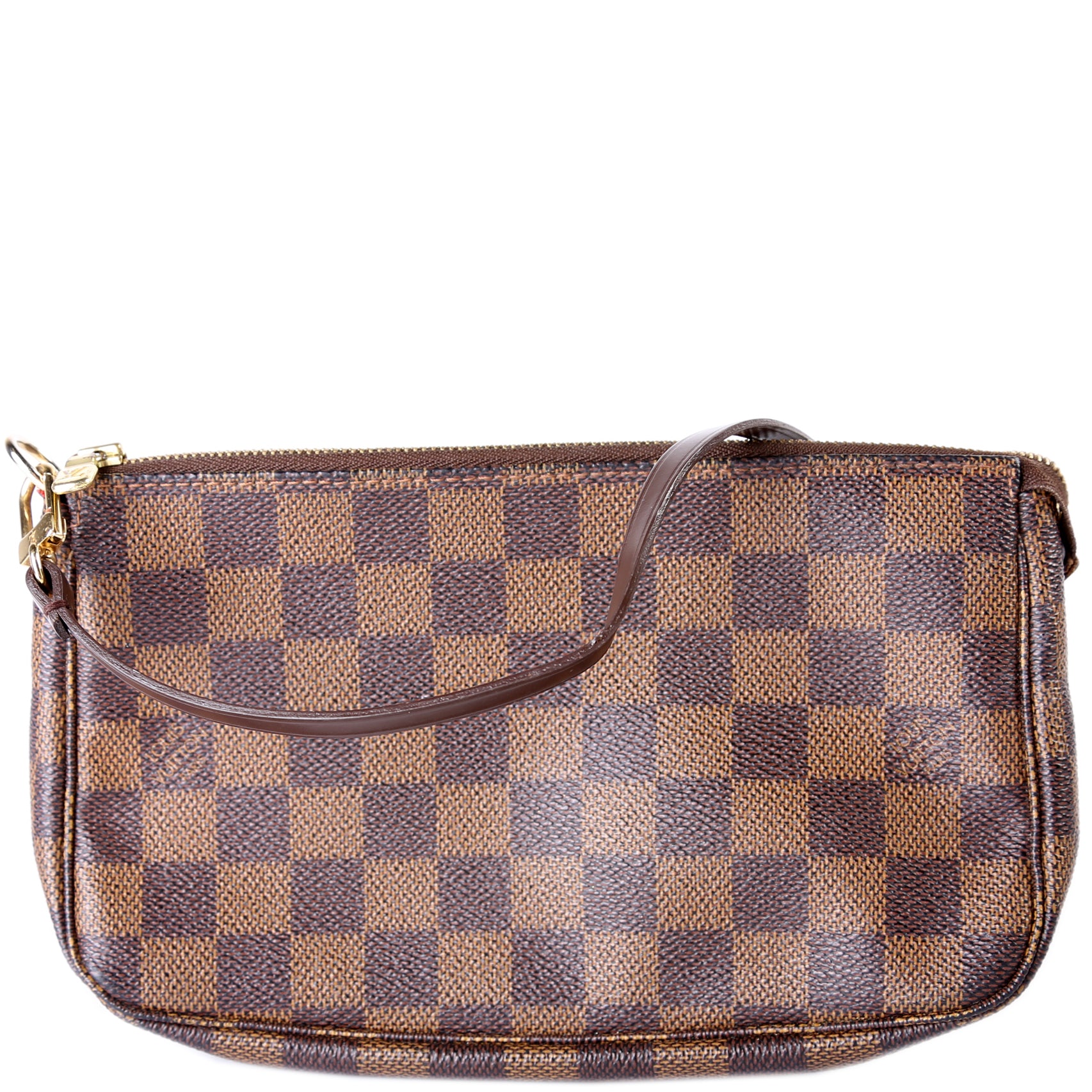 This pre-owned Louis Vuitton Pochette Access is guaranteed 100% authentic. The exterior is in the classic Louis Vuitton Damier Ebene coated canvas.