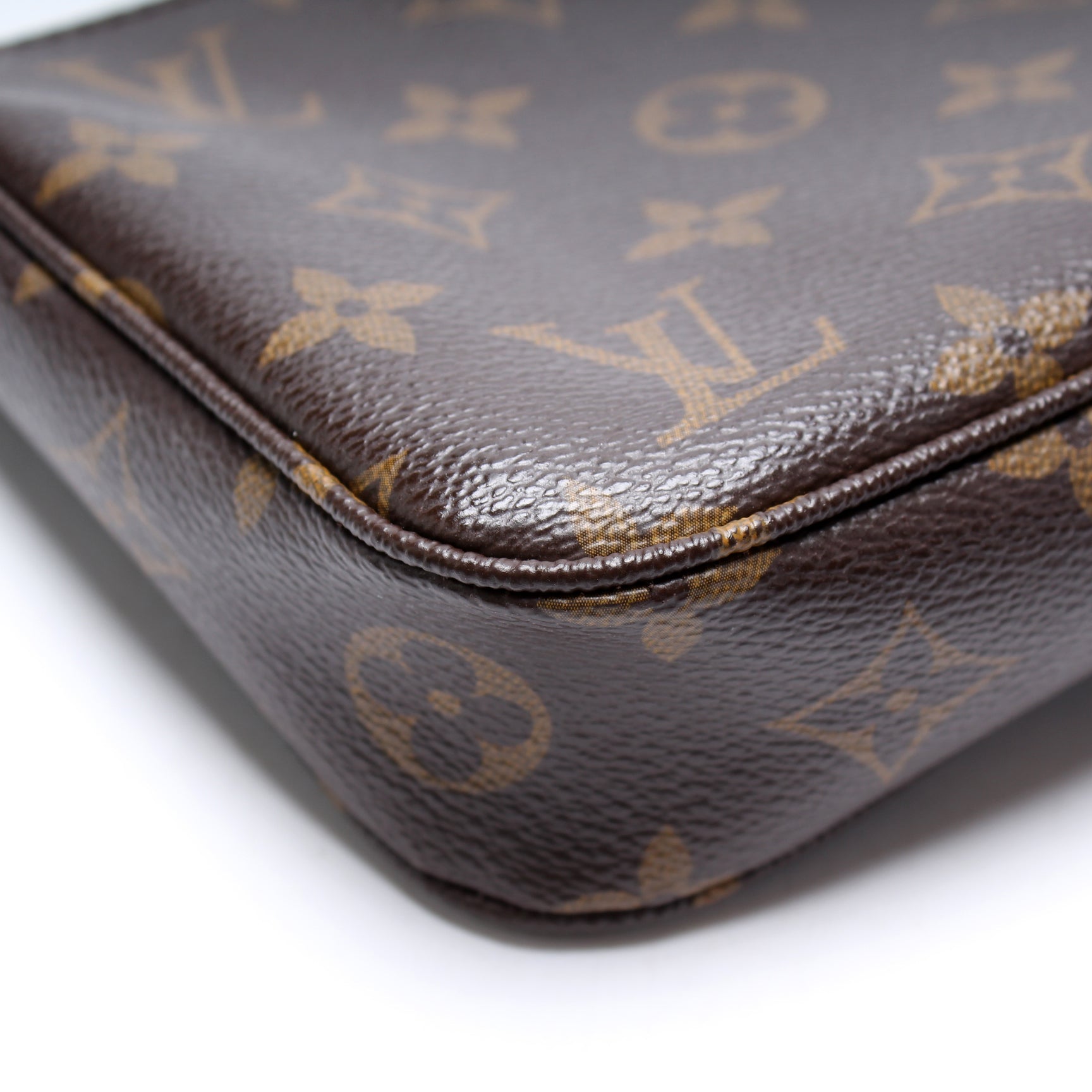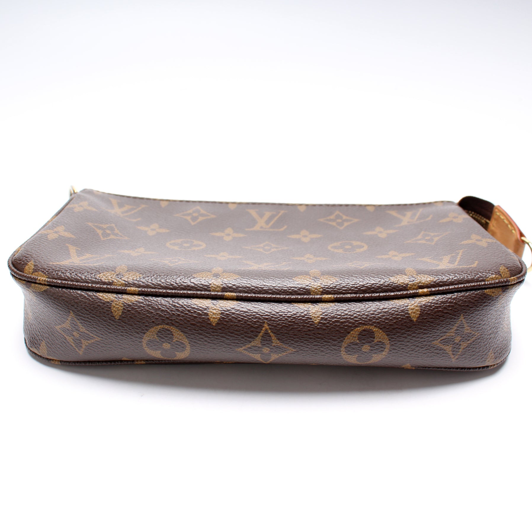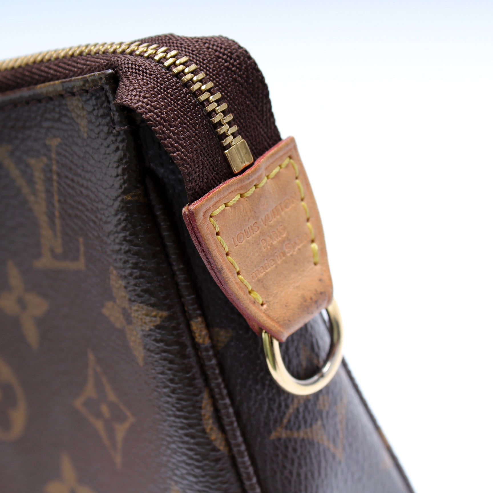 This pre-owned Louis Vuitton Pochette Accessories is guaranteed 100% authentic. The exterior is in the classic Louis Vuitton Monogram coated canvas.