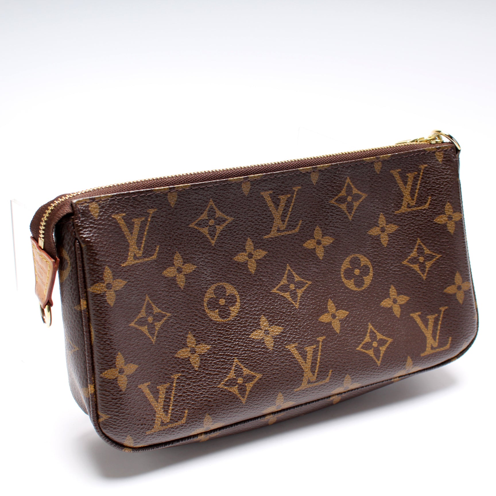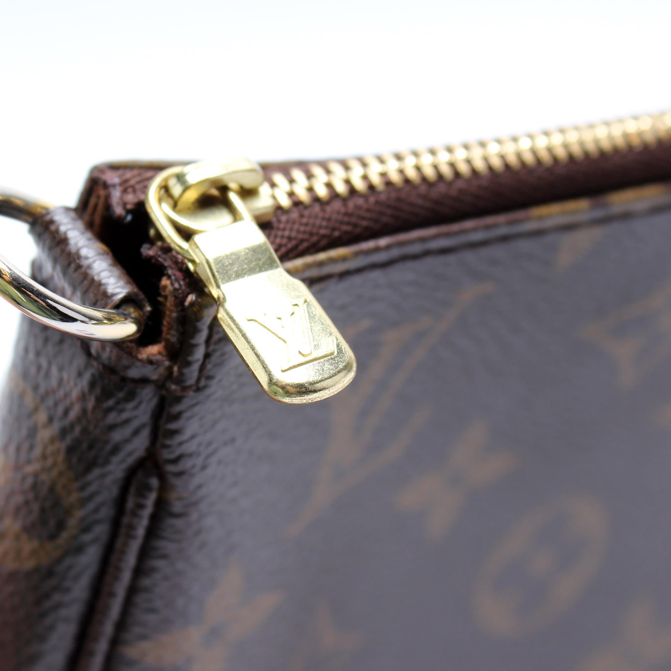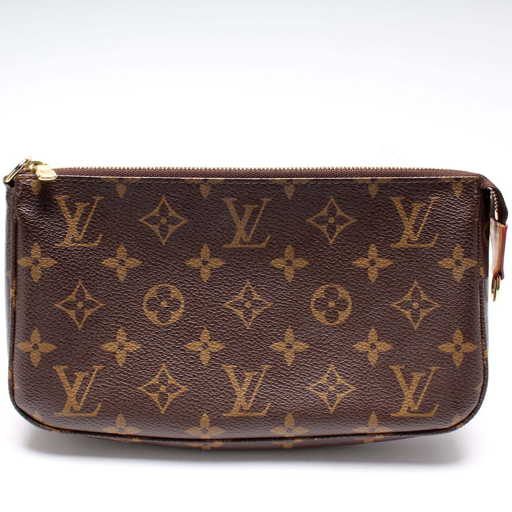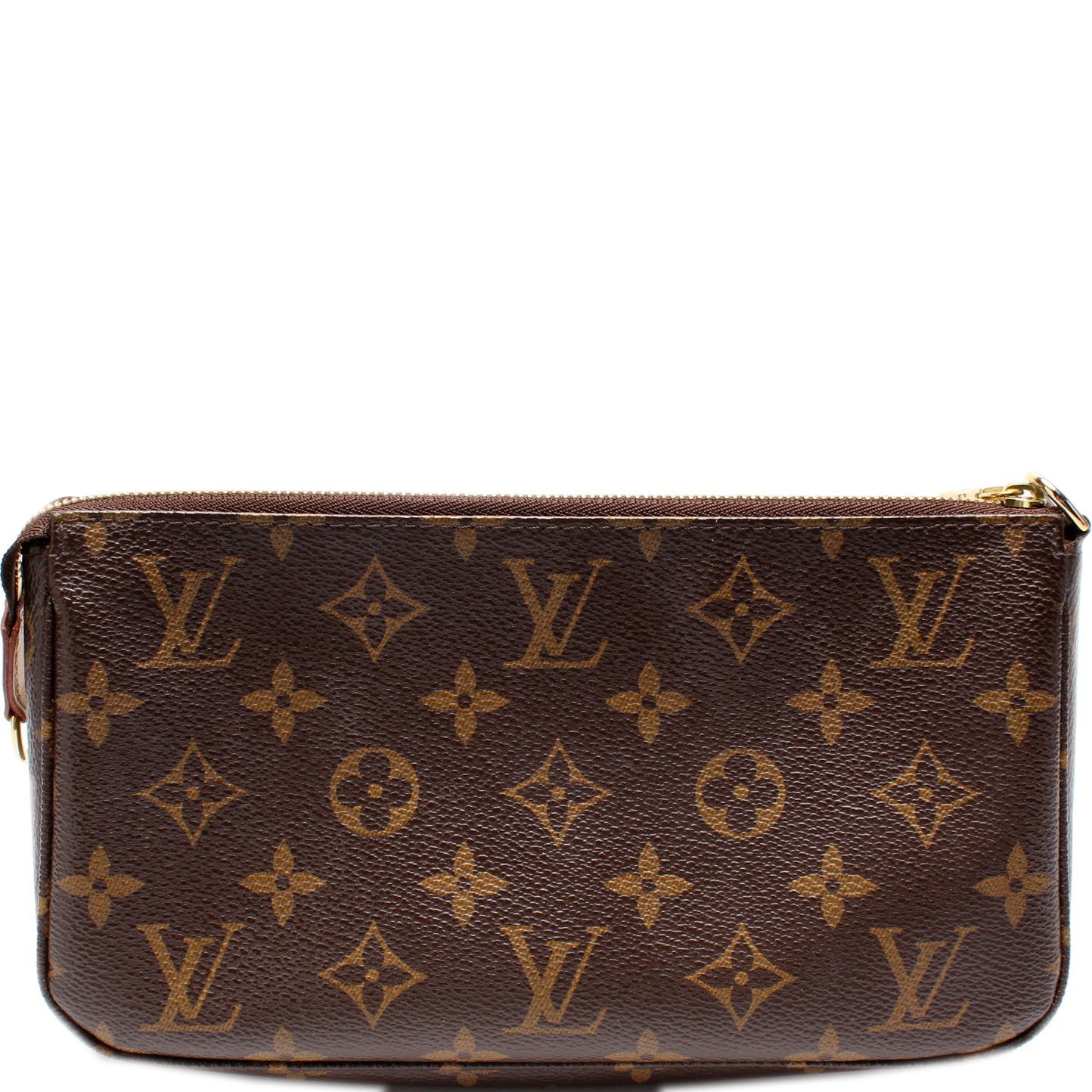 This pre-owned Louis Vuitton Pochette Accessories is guaranteed 100% authentic. The exterior is in the classic Louis Vuitton Monogram coated canvas.