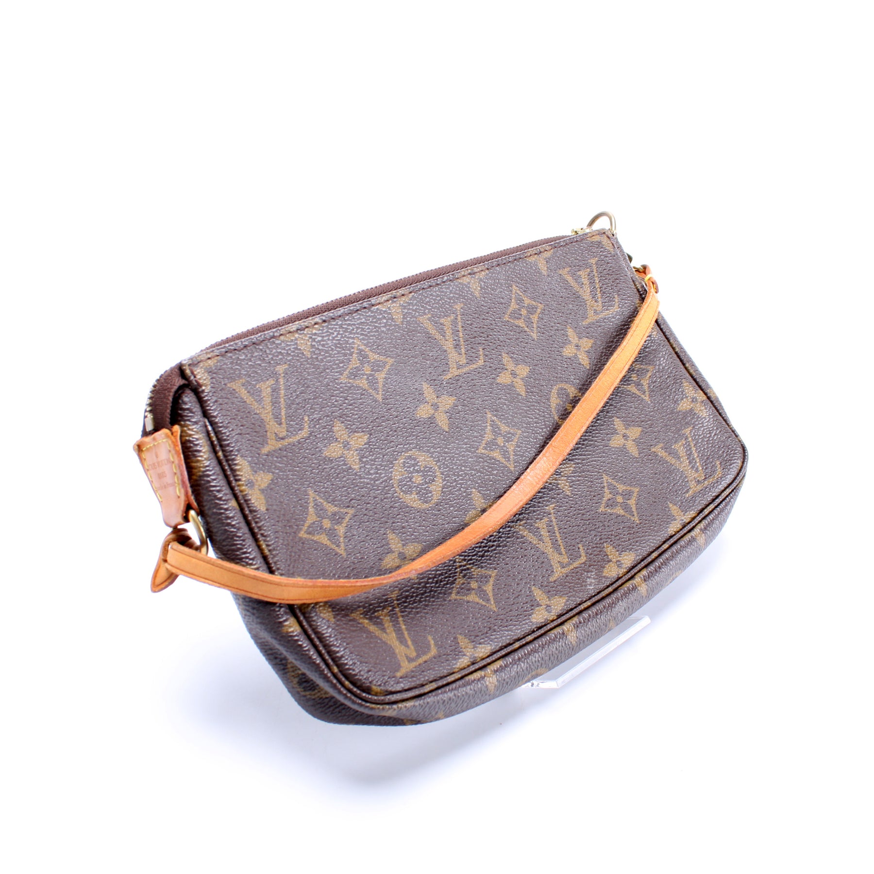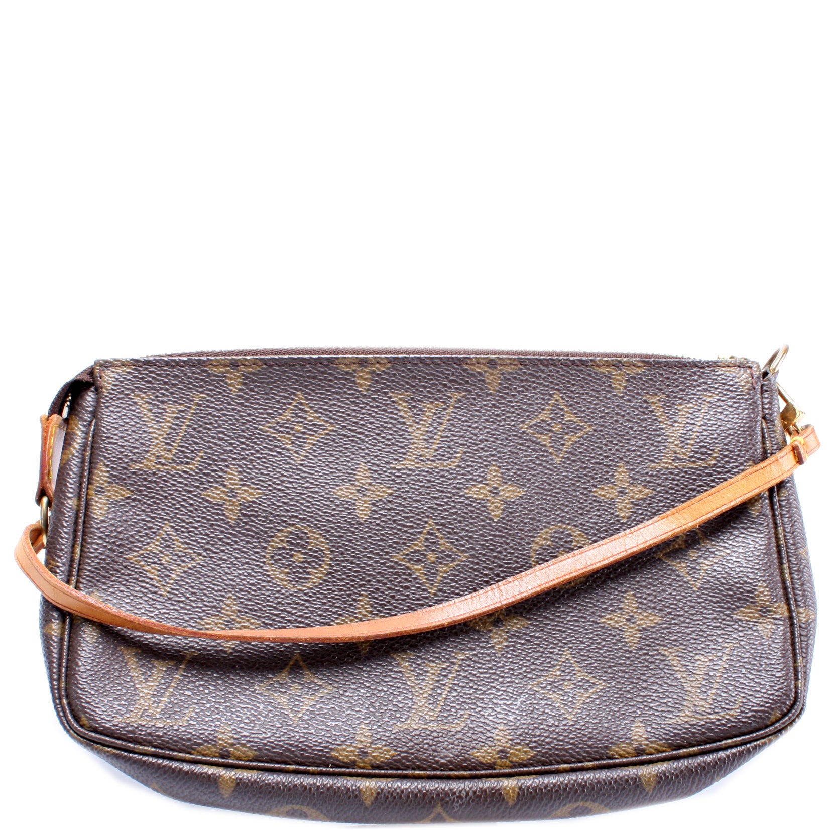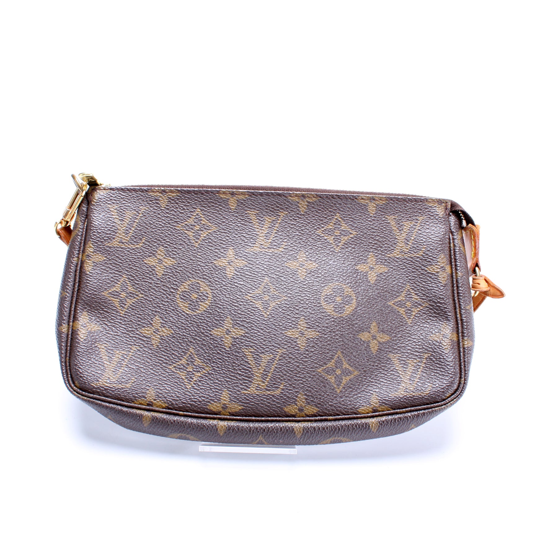 This pre-owned Louis Vuitton Pochette Accessories is guaranteed 100% authentic. The exterior is in the classic Louis Vuitton Monogram coated canvas.