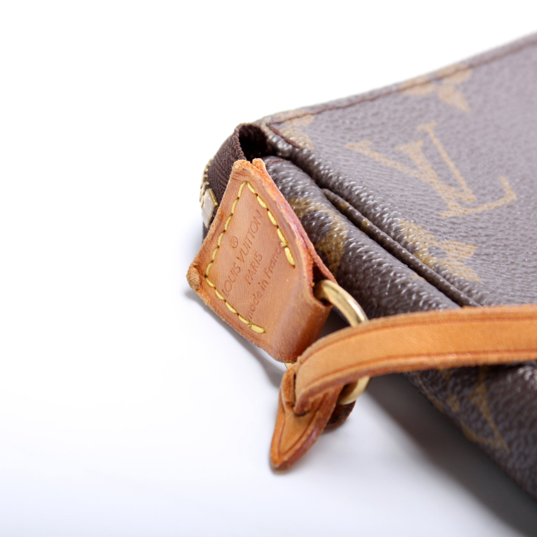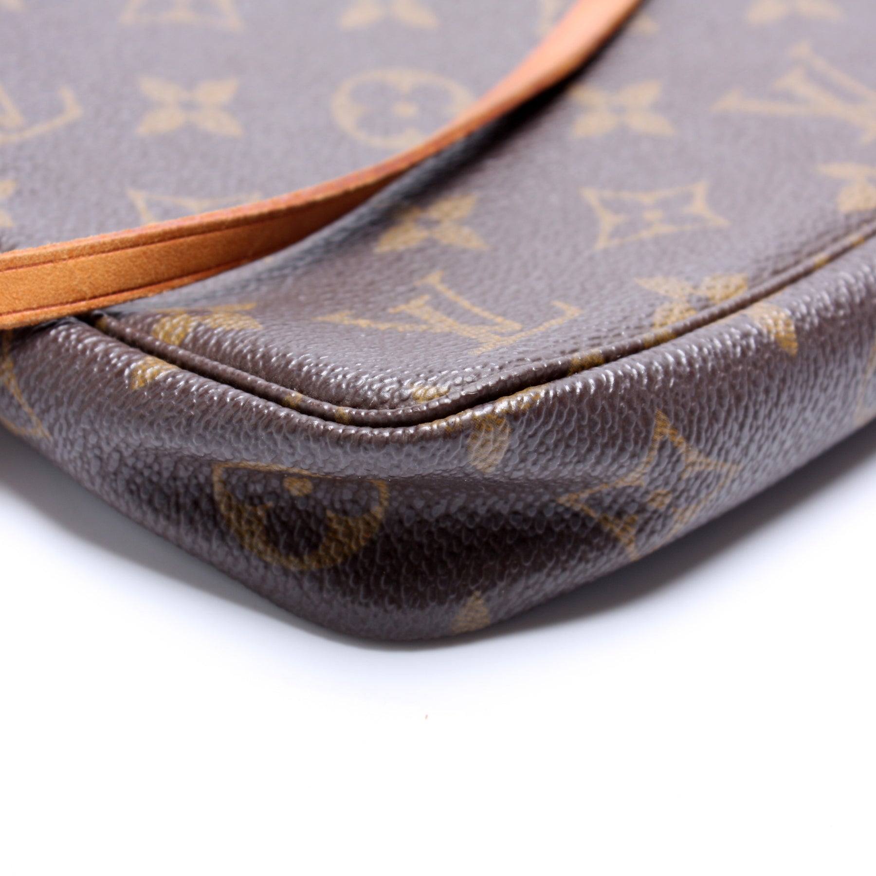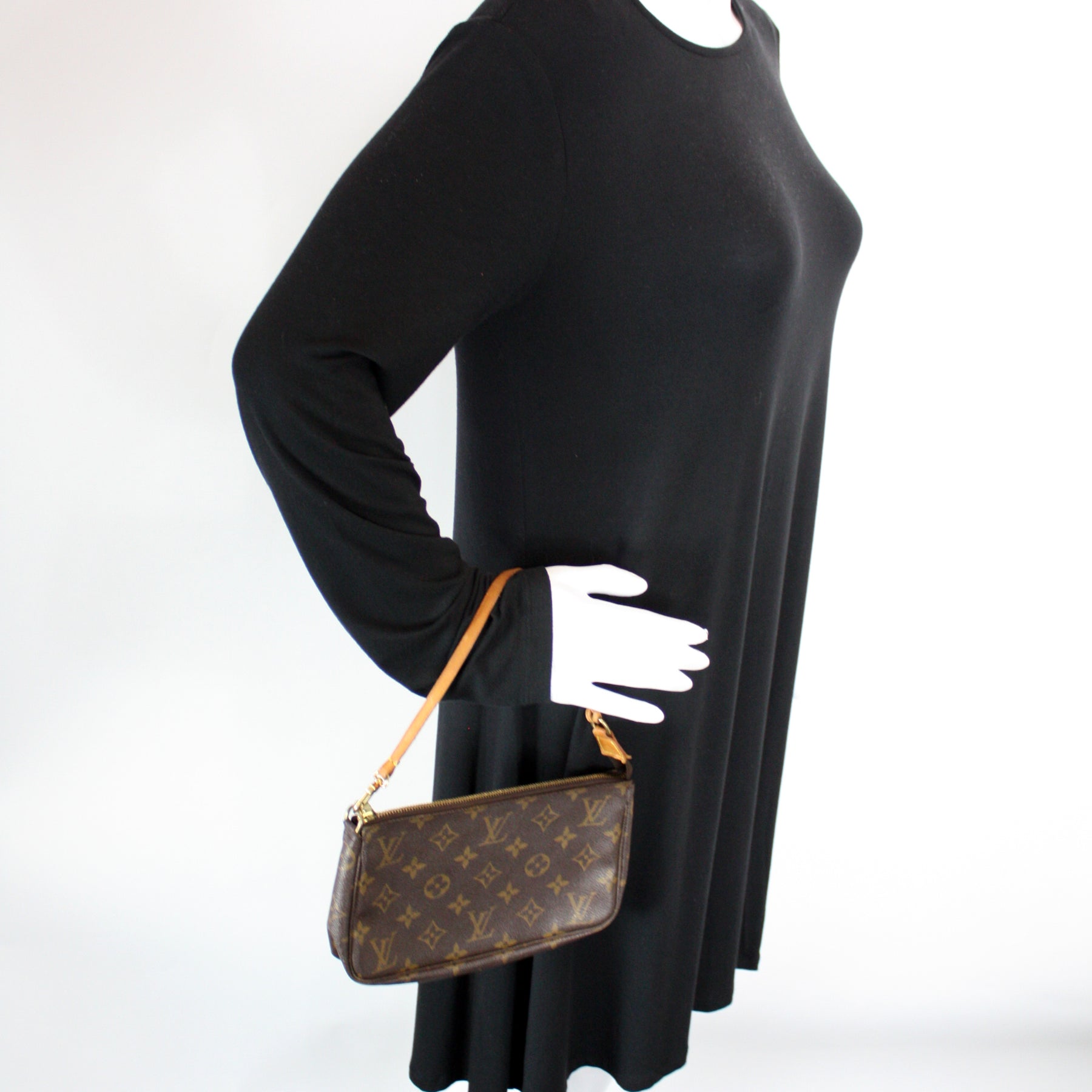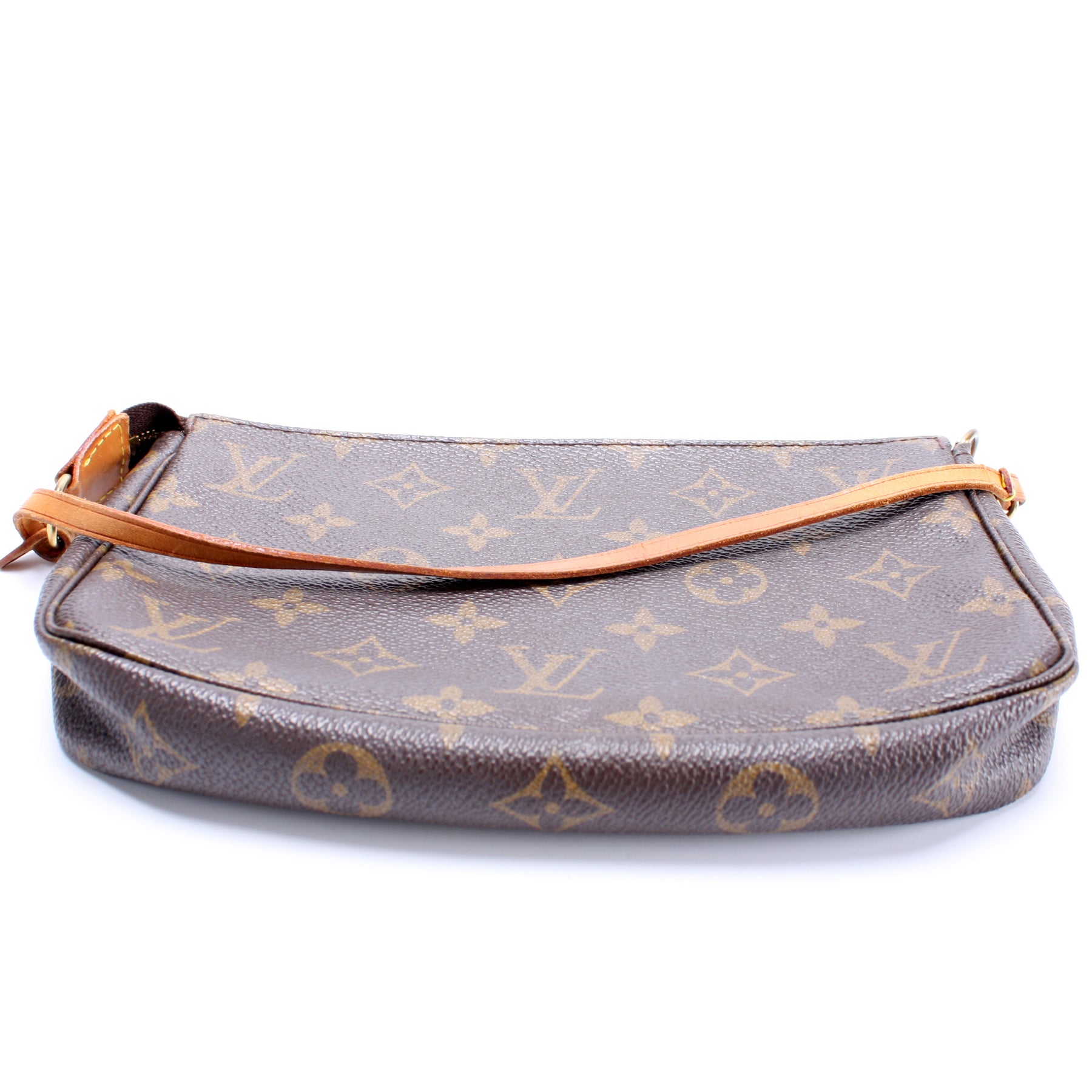 This pre-owned Louis Vuitton Pochette Accessories is guaranteed 100% authentic. The exterior is in the classic Louis Vuitton Monogram coated canvas.