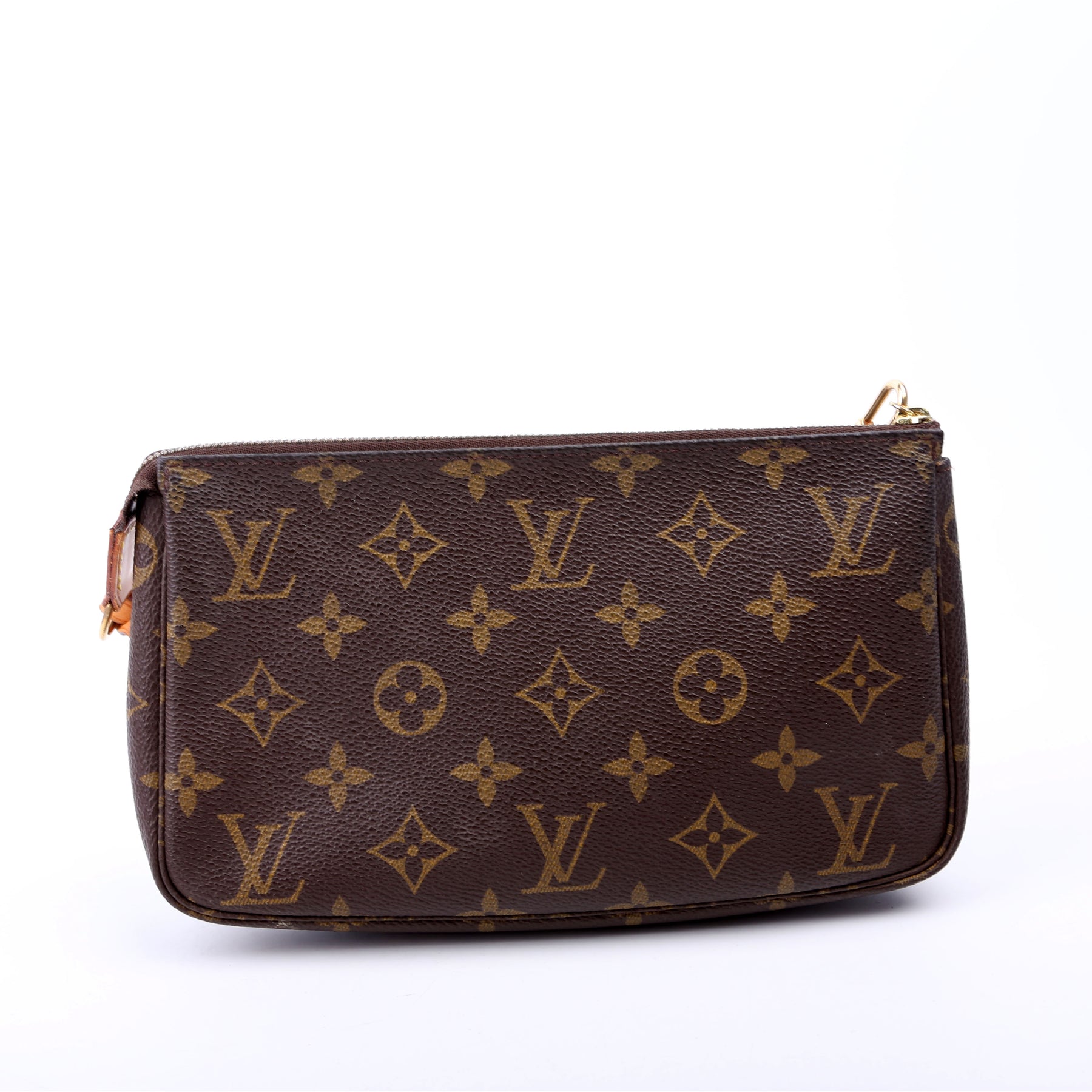 This pre-owned Louis Vuitton Pochette Accessories is guaranteed 100% authentic. The exterior is in the classic Louis Vuitton Monogram coated canvas.